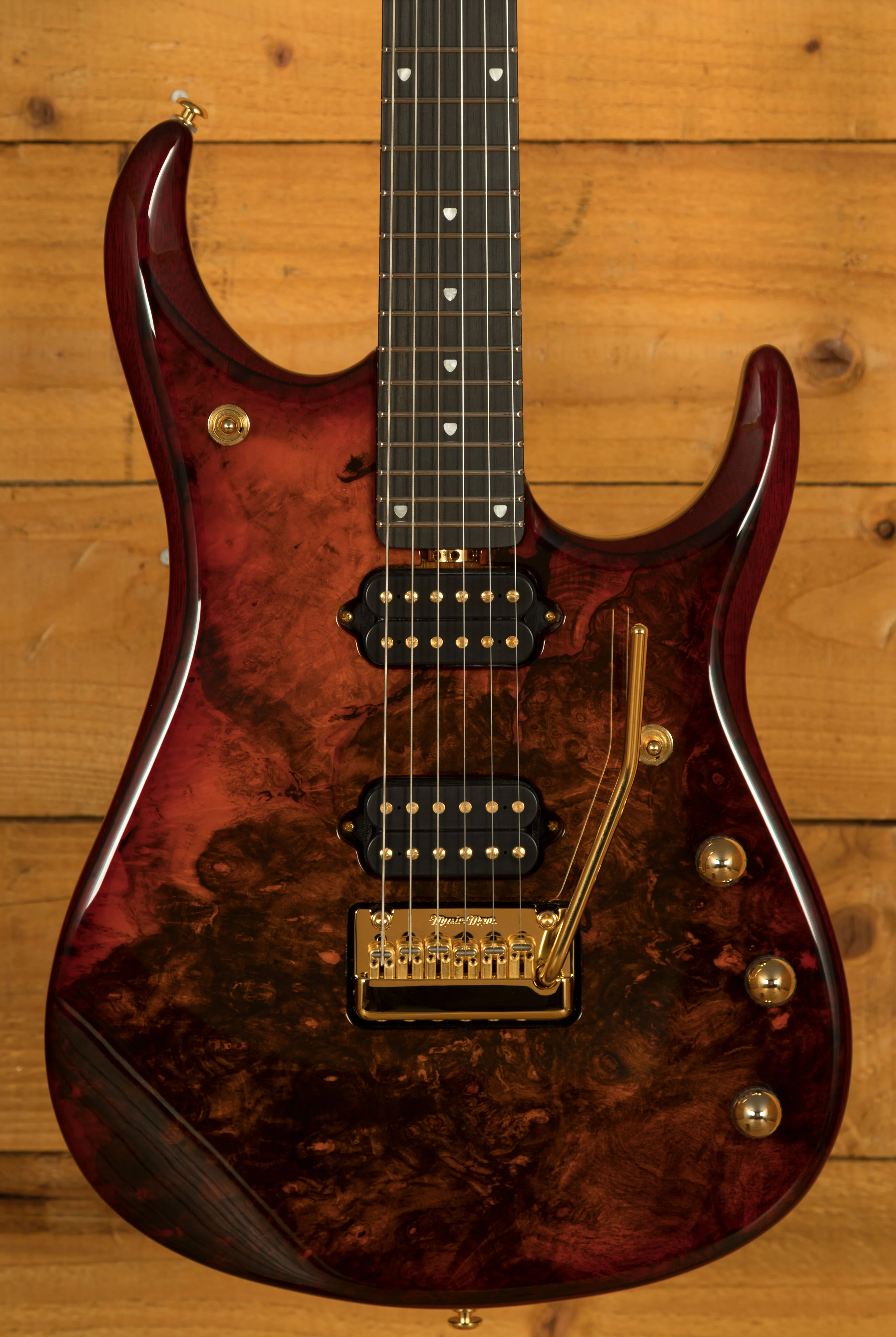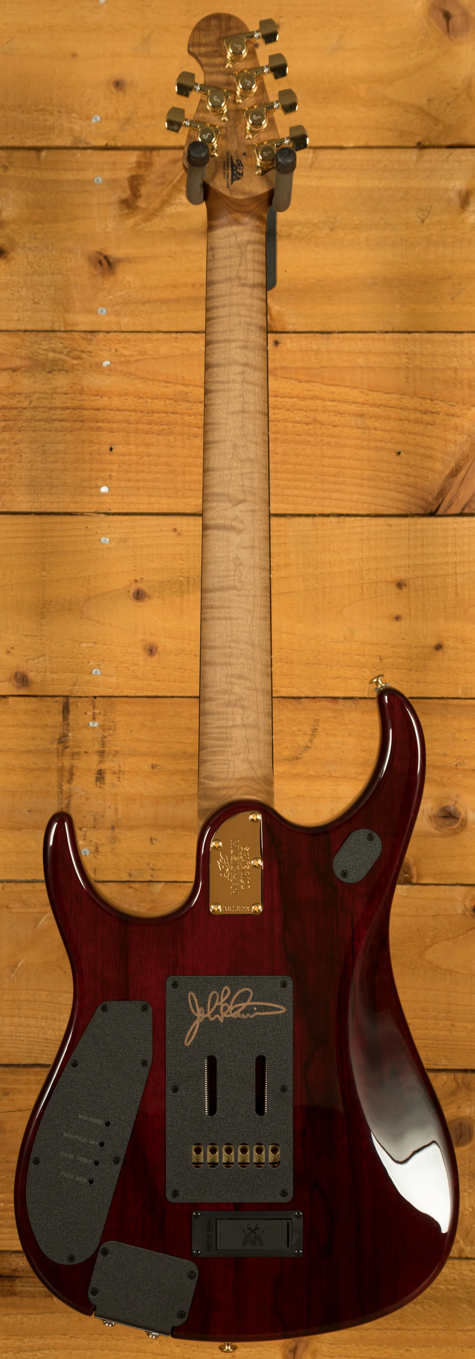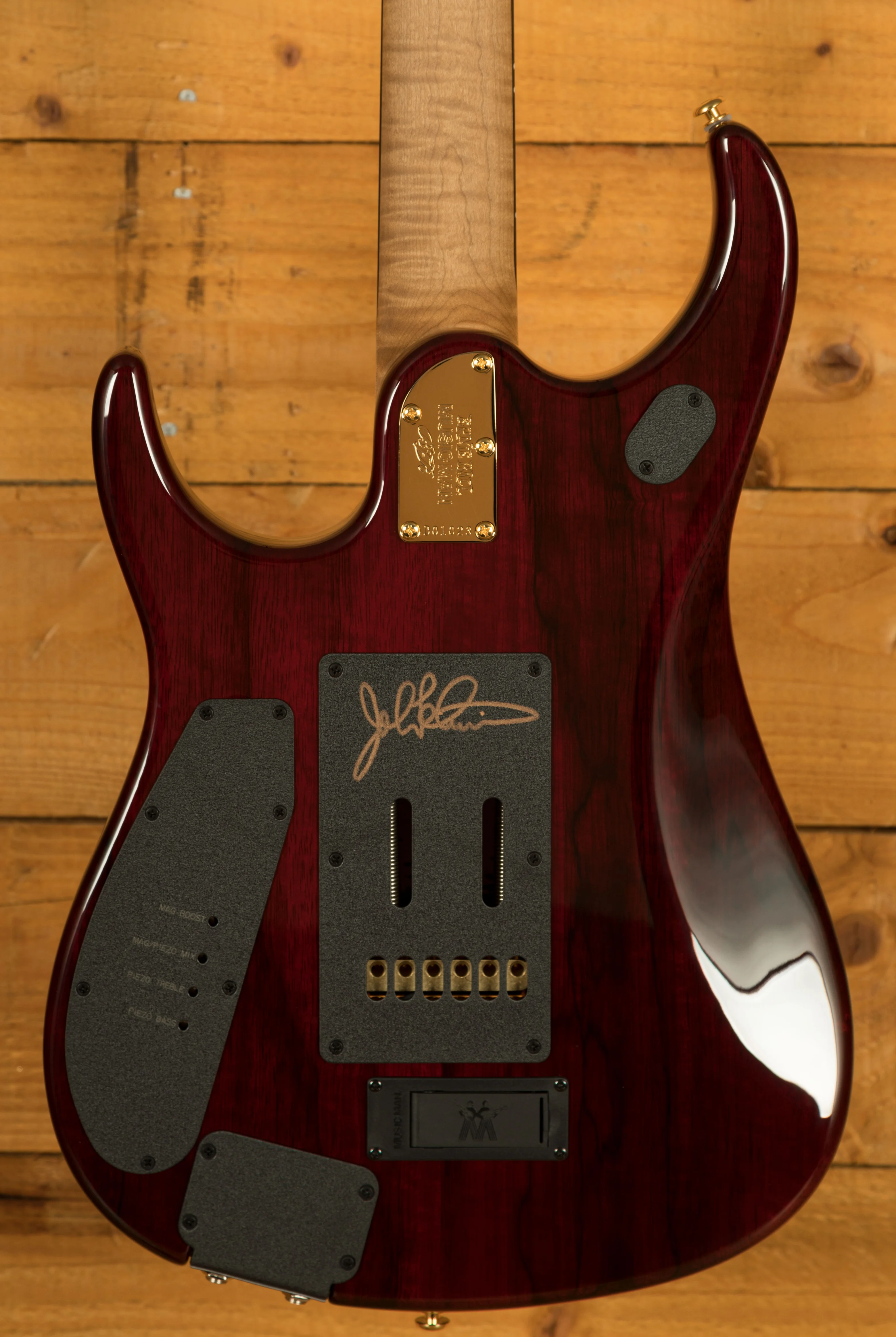 The JP15 Solar Flare is a commanding example of form meeting function, combining boutique tonewoods, cutting-edge electronics and signature John Petrucci design elements into a guitar built for performance and collectability. The dramatic Bright Red Burst buckeye burl top catches the light with fiery depth, while the Black Limba body, finished in Dark Translucent Red high gloss, lends both visual richness and tonal warmth. With its solid construction and resonant character, this instrument delivers articulate, full-bodied tone from the first note.