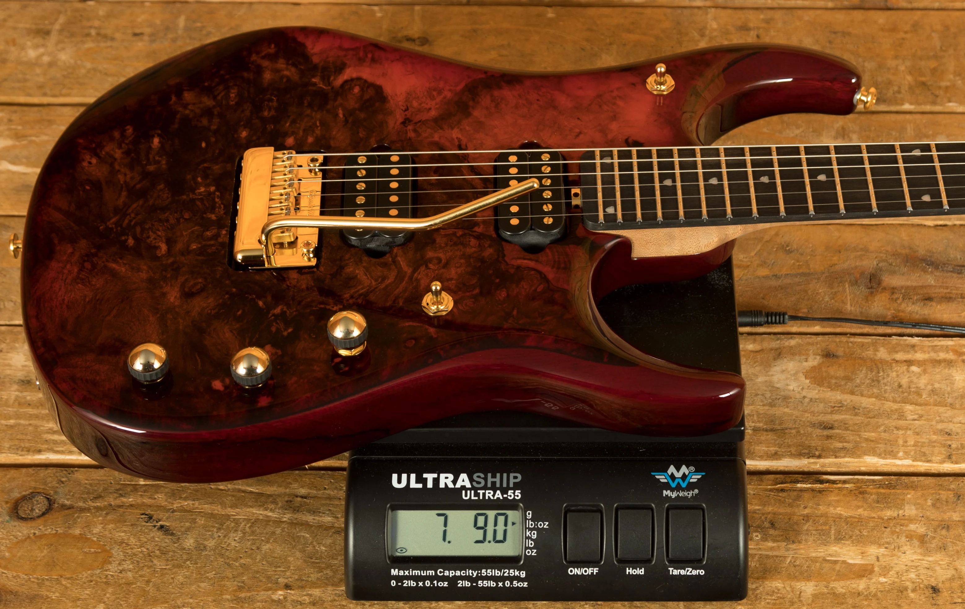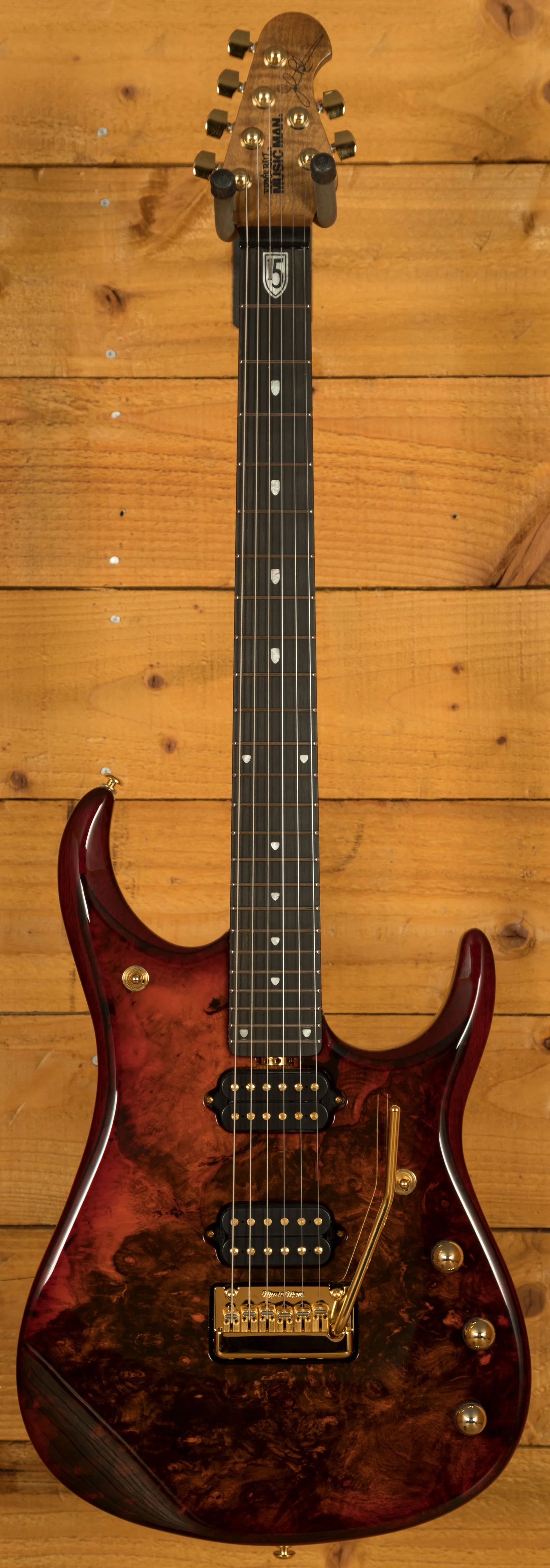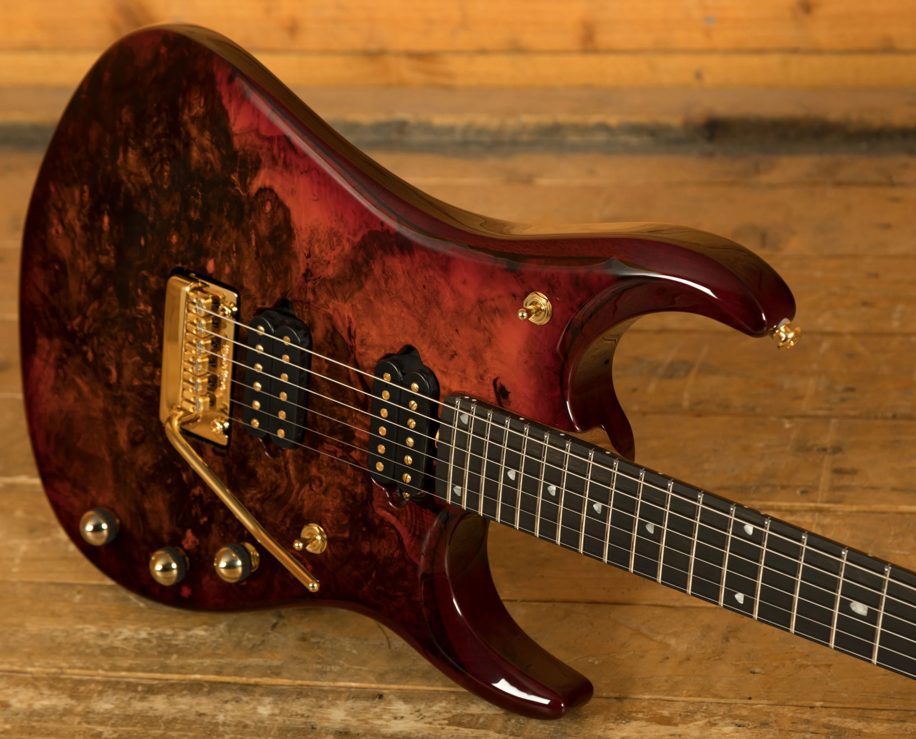 The JP15 Solar Flare is a commanding example of form meeting function, combining boutique tonewoods, cutting-edge electronics and signature John Petrucci design elements into a guitar built for performance and collectability. The dramatic Bright Red Burst buckeye burl top catches the light with fiery depth, while the Black Limba body, finished in Dark Translucent Red high gloss, lends both visual richness and tonal warmth. With its solid construction and resonant character, this instrument delivers articulate, full-bodied tone from the first note.