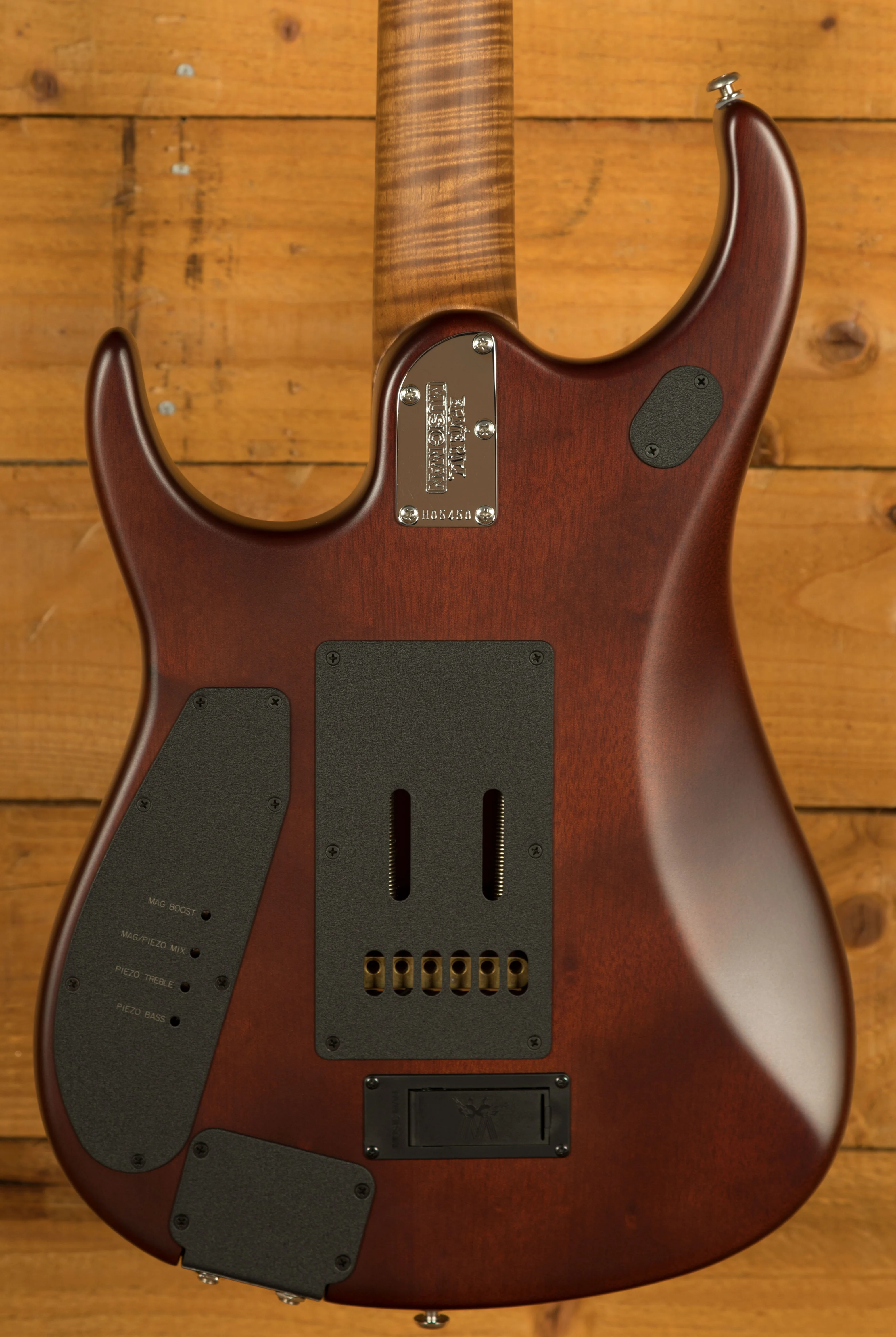 The Figured Roasted Maple neck and fingerboard are adorned with awesome JP15 inlays. Thanks to the 24 Medium Jumbo Stainless Steel Frets, a 17" Radius and of course a 25.5" Scale Length you will have a premium playing experience, this setup is super comfortable, allowing for quick and easy movements all across the fingerboard.