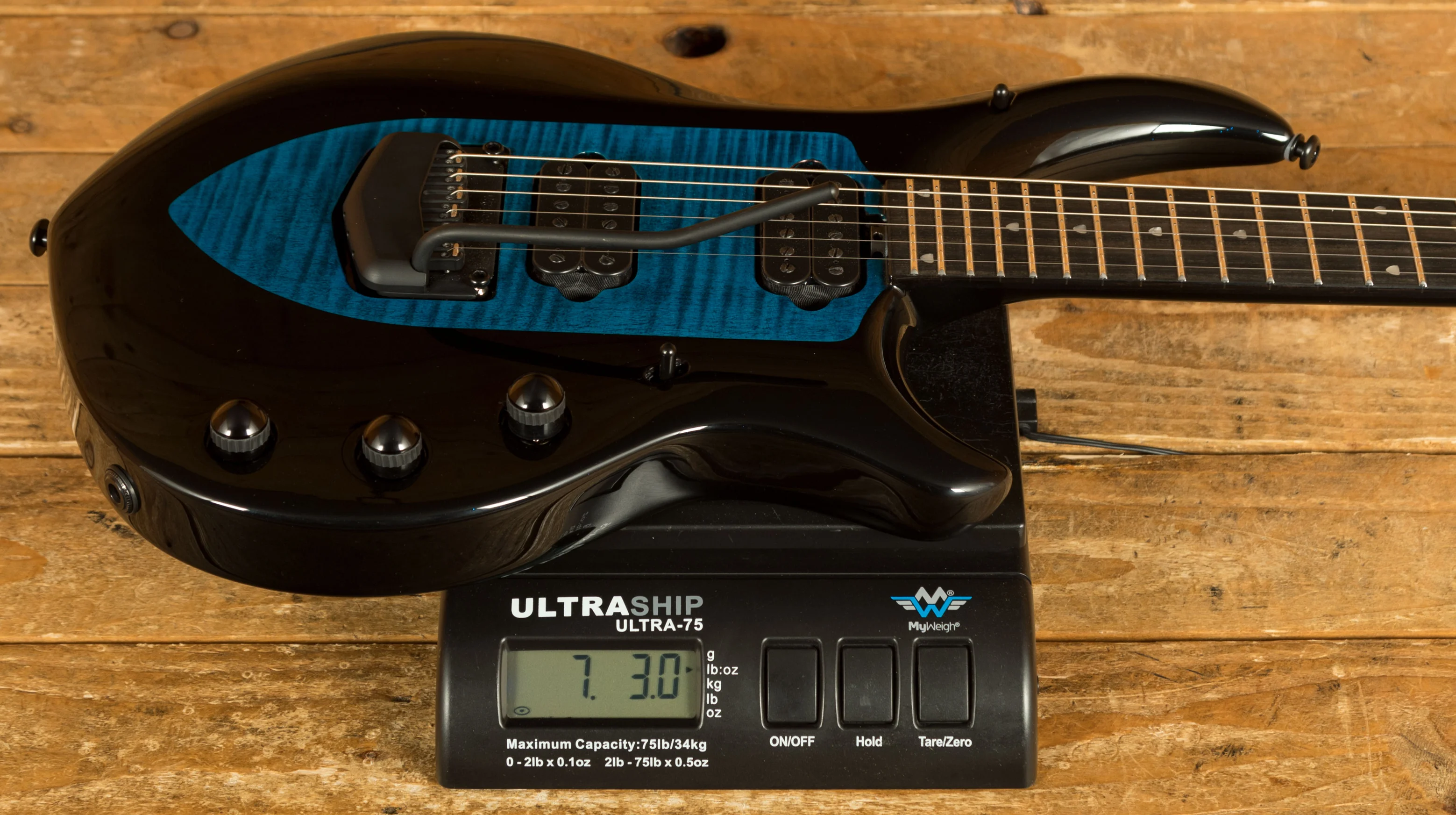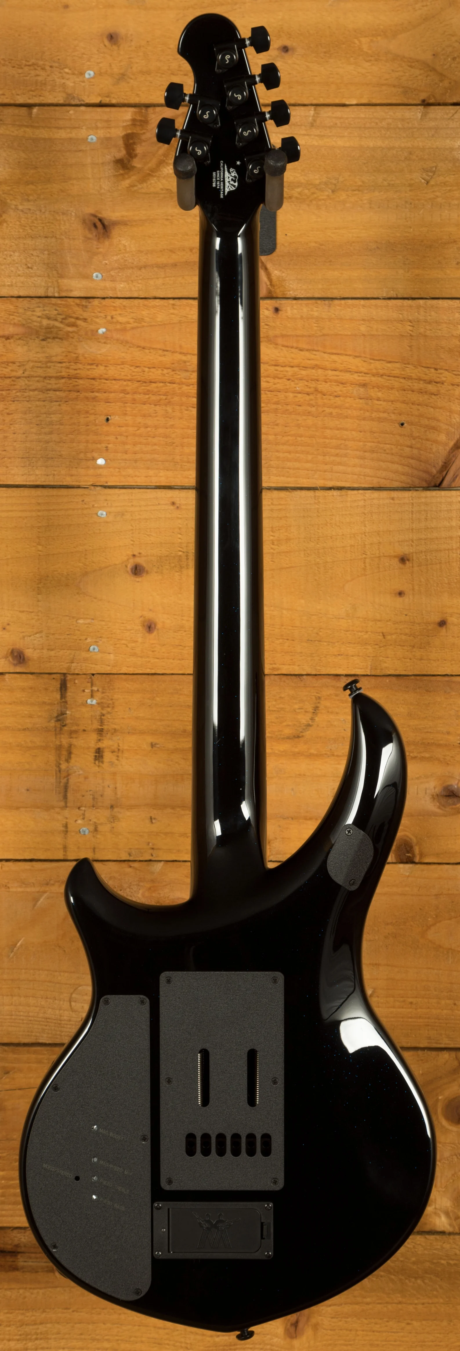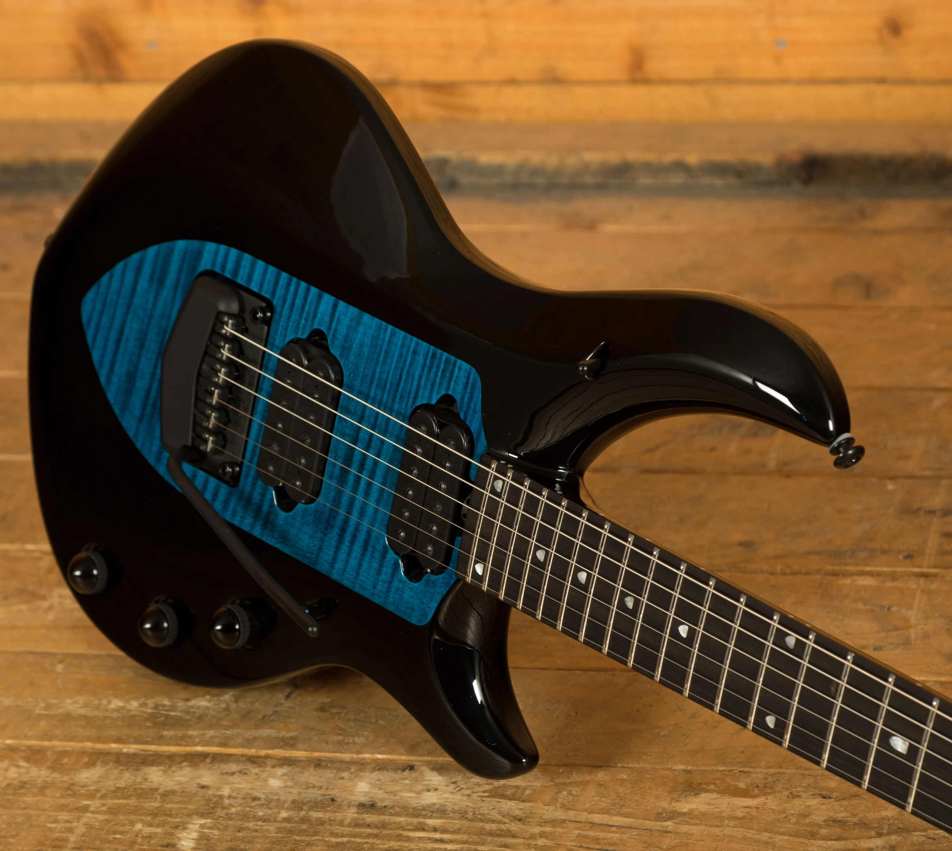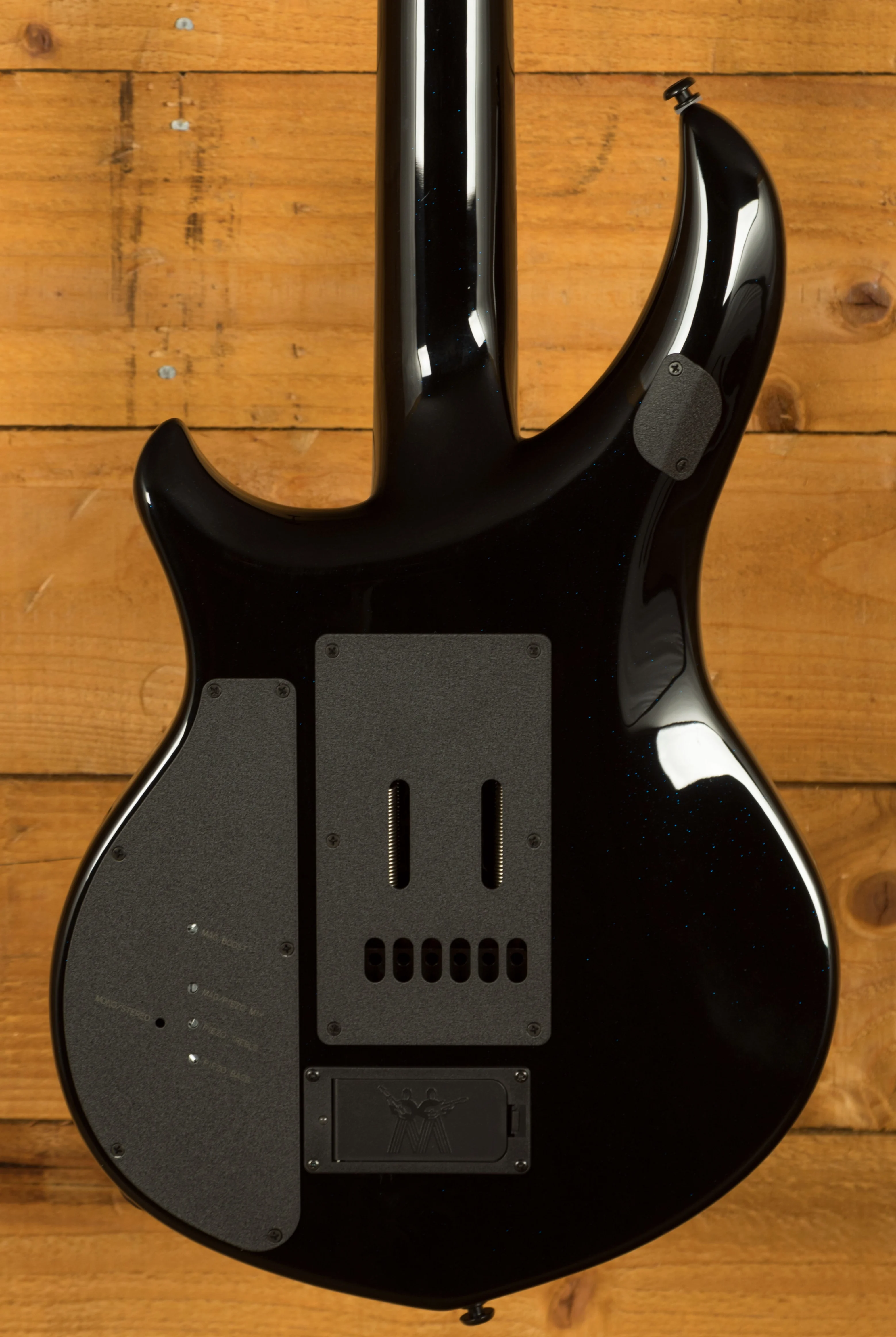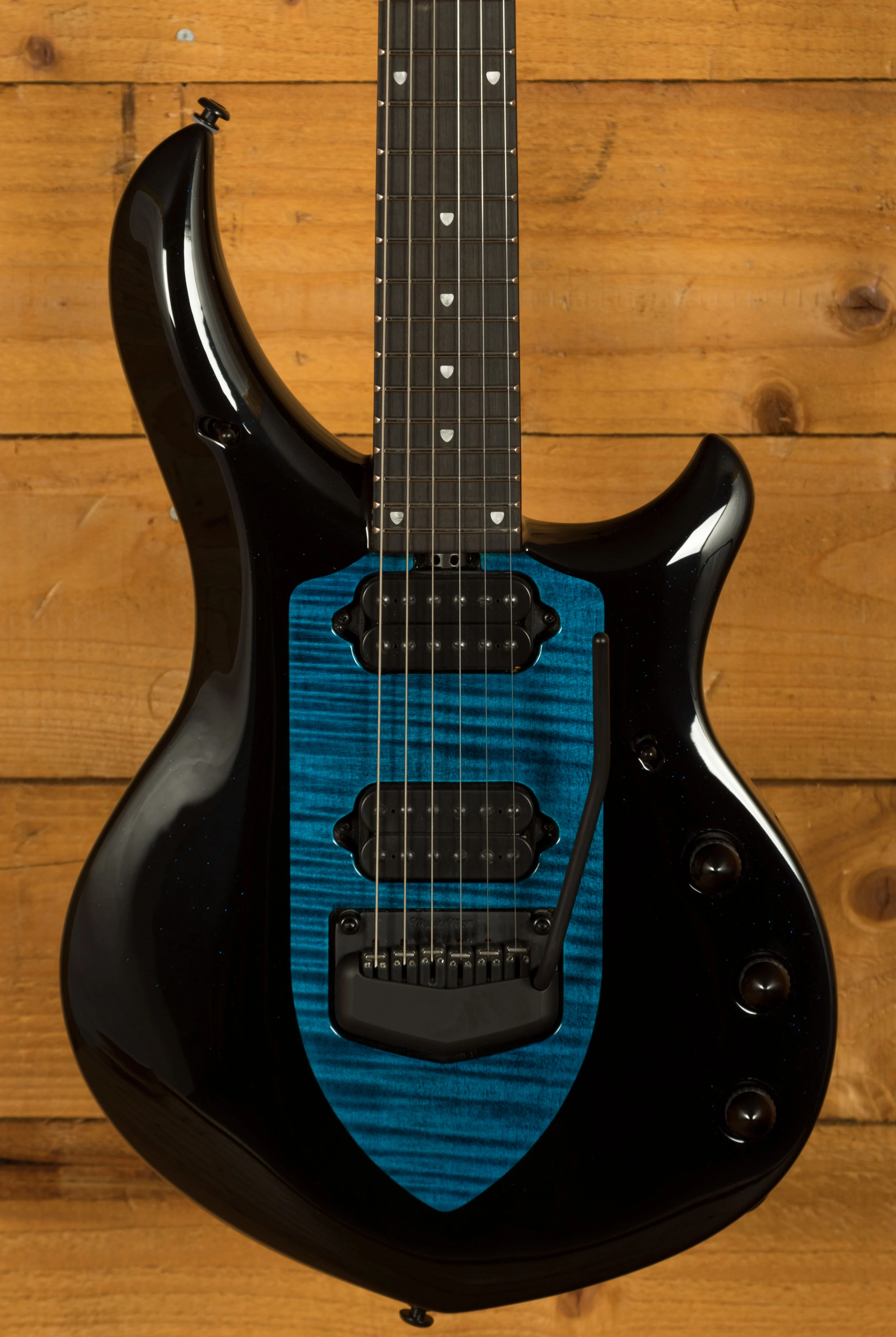 The Music Man Majesty in Okelani Blue is the latest in a succession of the incredible signature models. The Majesty benefits from a strong and punchy Okoume body with a Maple Top finished in Okelani Blue which sparkles beautifully under lights, it really accentuates the curves and figure of the body. It is beautifully weighted and super well balanced. The ergonomic design is a real treat to play.