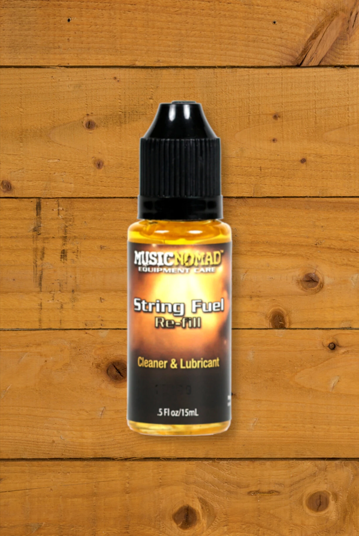 This Re-Fill bottle is designed to refuel MN109 String Fuel Applicator (sold separately) once the applicator becomes dry over a period of time due to usage. This String Fuel formulation is a hybrid blend of refined naturally occurring oils that are speed blended with premium quality mineral oils to deliver a string cleaner & lubricant like no other. Music Nomad's proprietary formulation allows you to both clean & protect your strings to last longer & sound better while reducing the finger noise & enhancing the speed you can slide your fingers. It's silicone free & even conditions unfinished fretboard wood. This bottle can re-fuel the String Fuel Applicator a minimum two times.