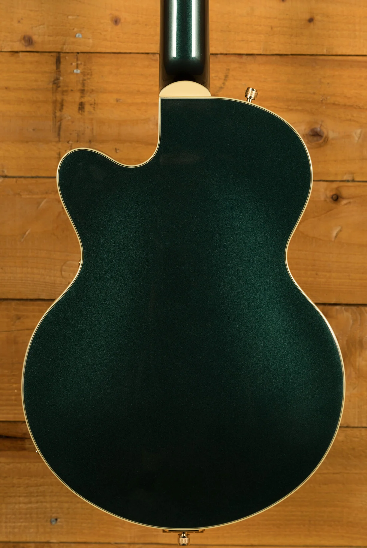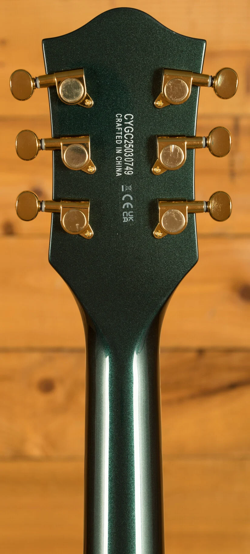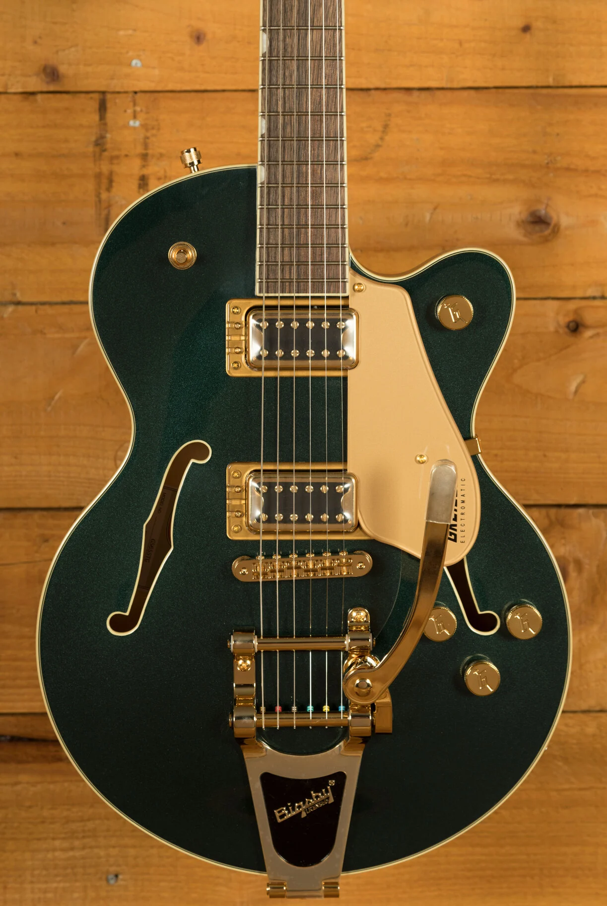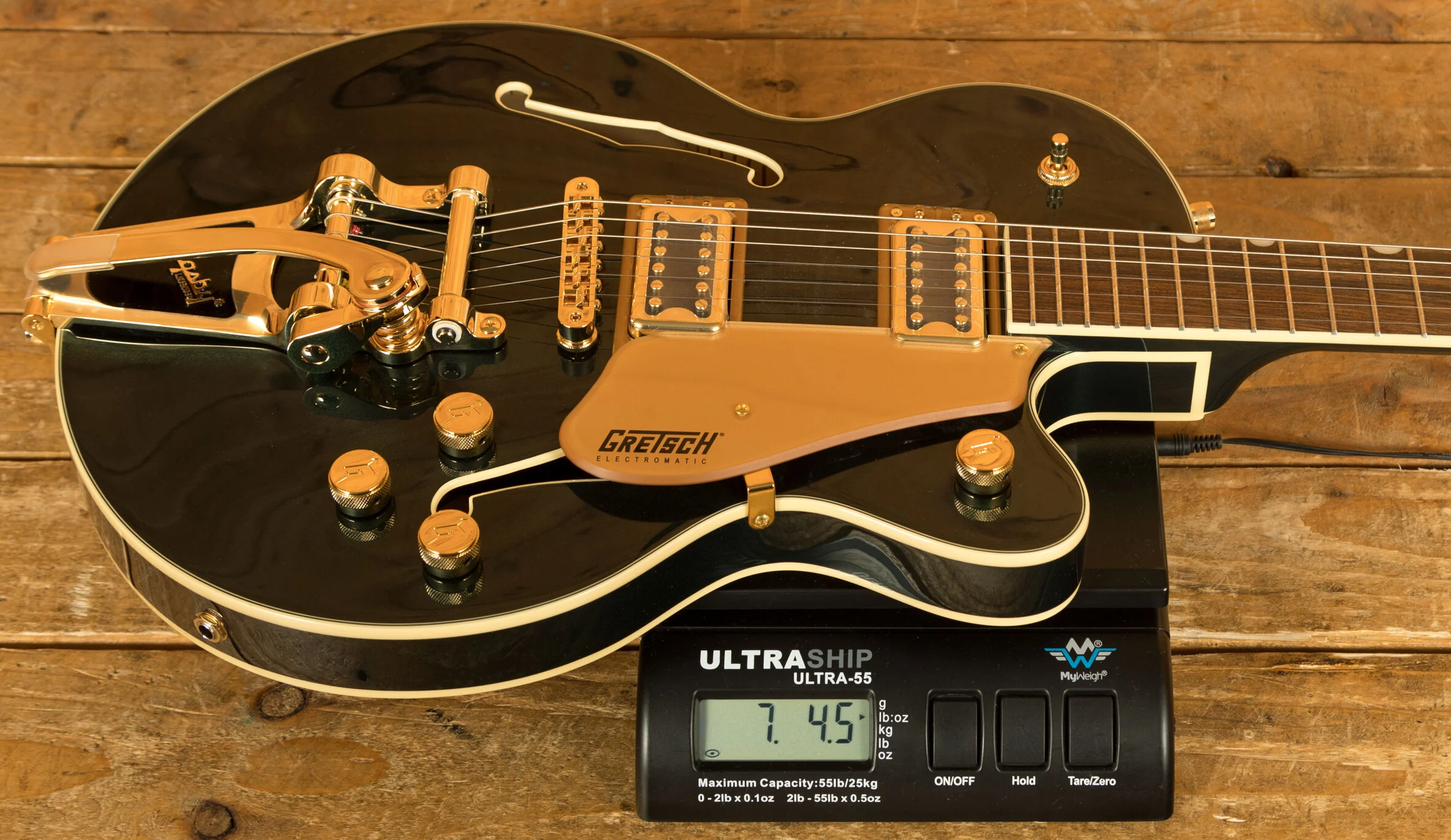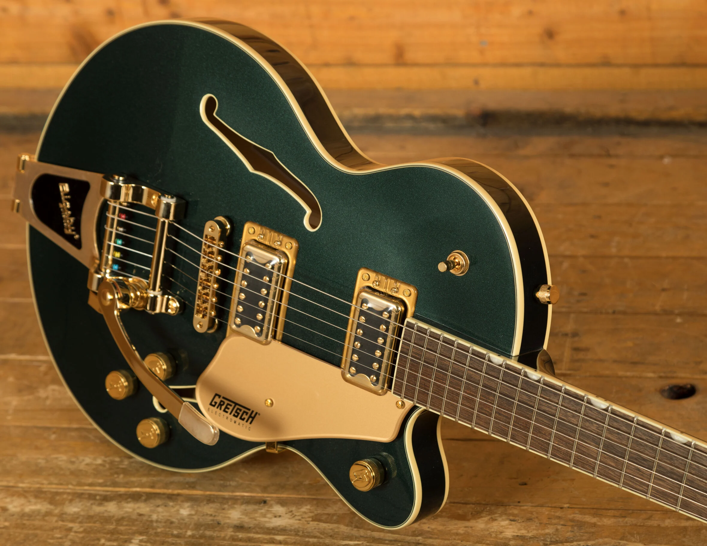 The Gretsch G5655TG Electromatic Center Block Jr. Single-Cut with Bigsby and Gold Hardware is designed to deliver a powerful and authentic Gretsch sound at high volumes, making it ideal for players who demand bold and dynamic tone. The guitar features a slightly smaller 14" single-cutaway maple body, combined with a chambered spruce centre block, which provides excellent resonance and lightweight comfort. This design allows for high gain power without sacrificing tonal clarity or comfort during long playing sessions.