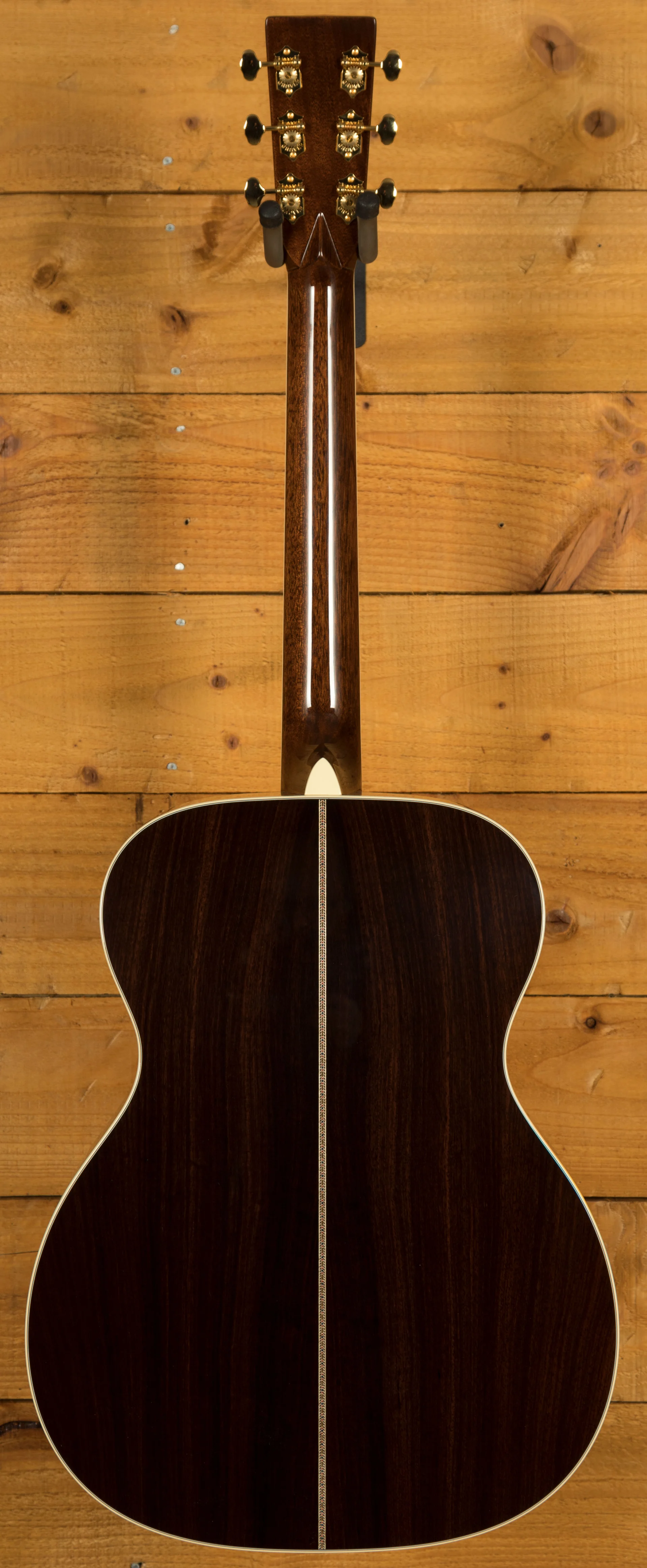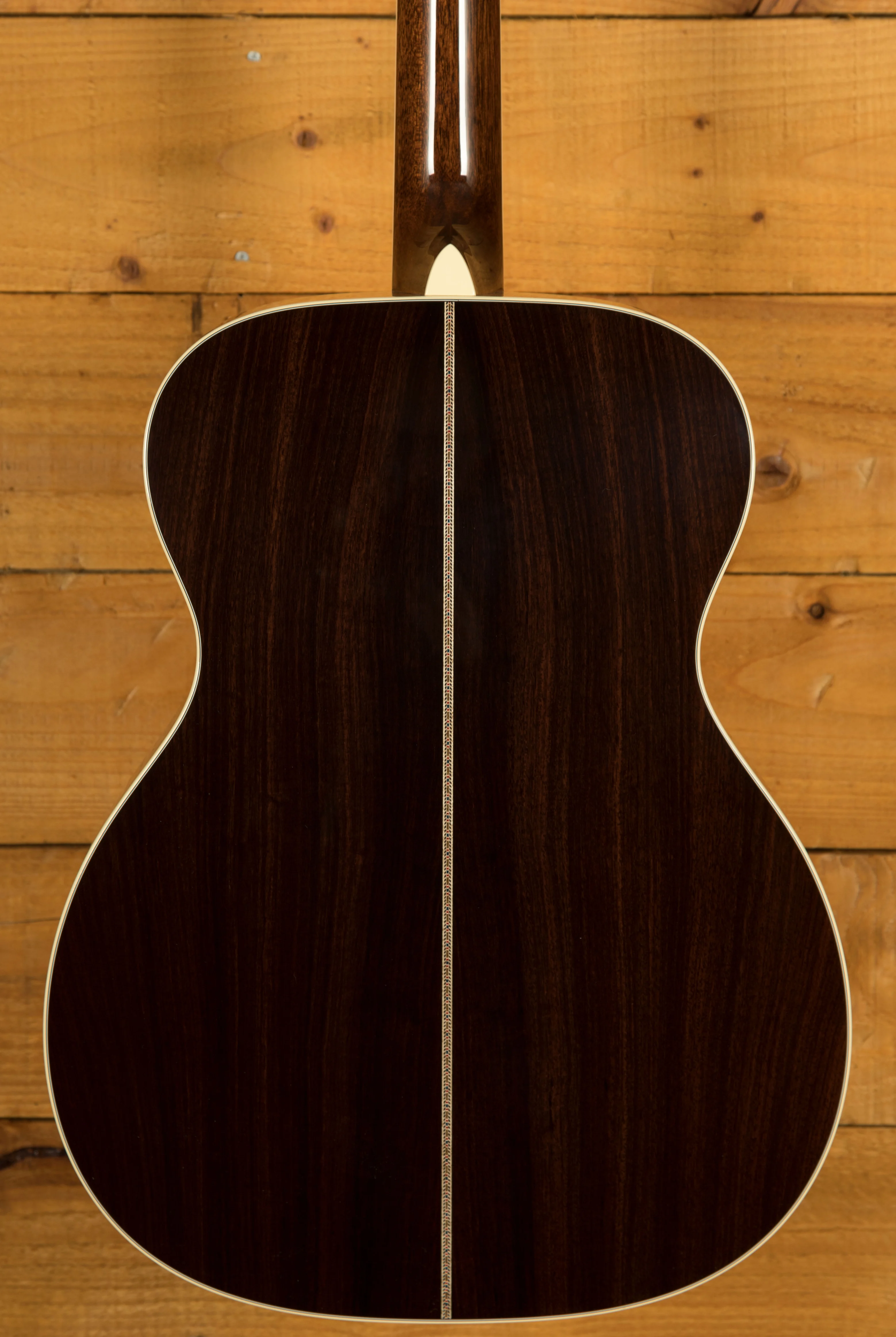 The ornate design and flash of the 42 Series adds panache to the classic tone of East Indian rosewood back and sides, a Sitka spruce scalloped X-braced top, and hand-fit dovetail neck joint. Open geared tuners, antique white binding, polished gloss finish and abalone pearl top inlay offers exquisite style with complex tone. Short scale and a sleek modified low-oval neck with narrow taper mean strumming and picking for hours in comfort and bliss.
