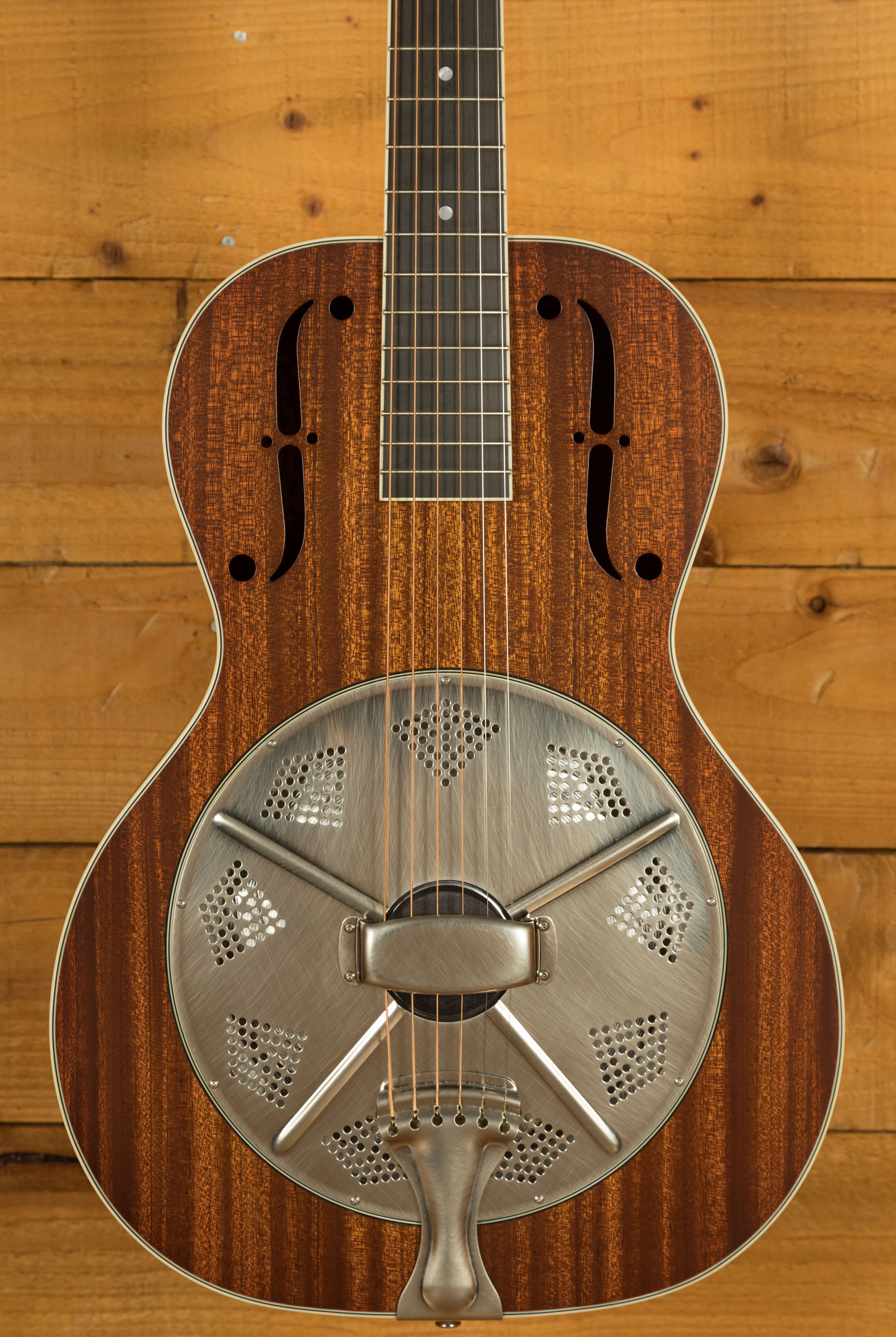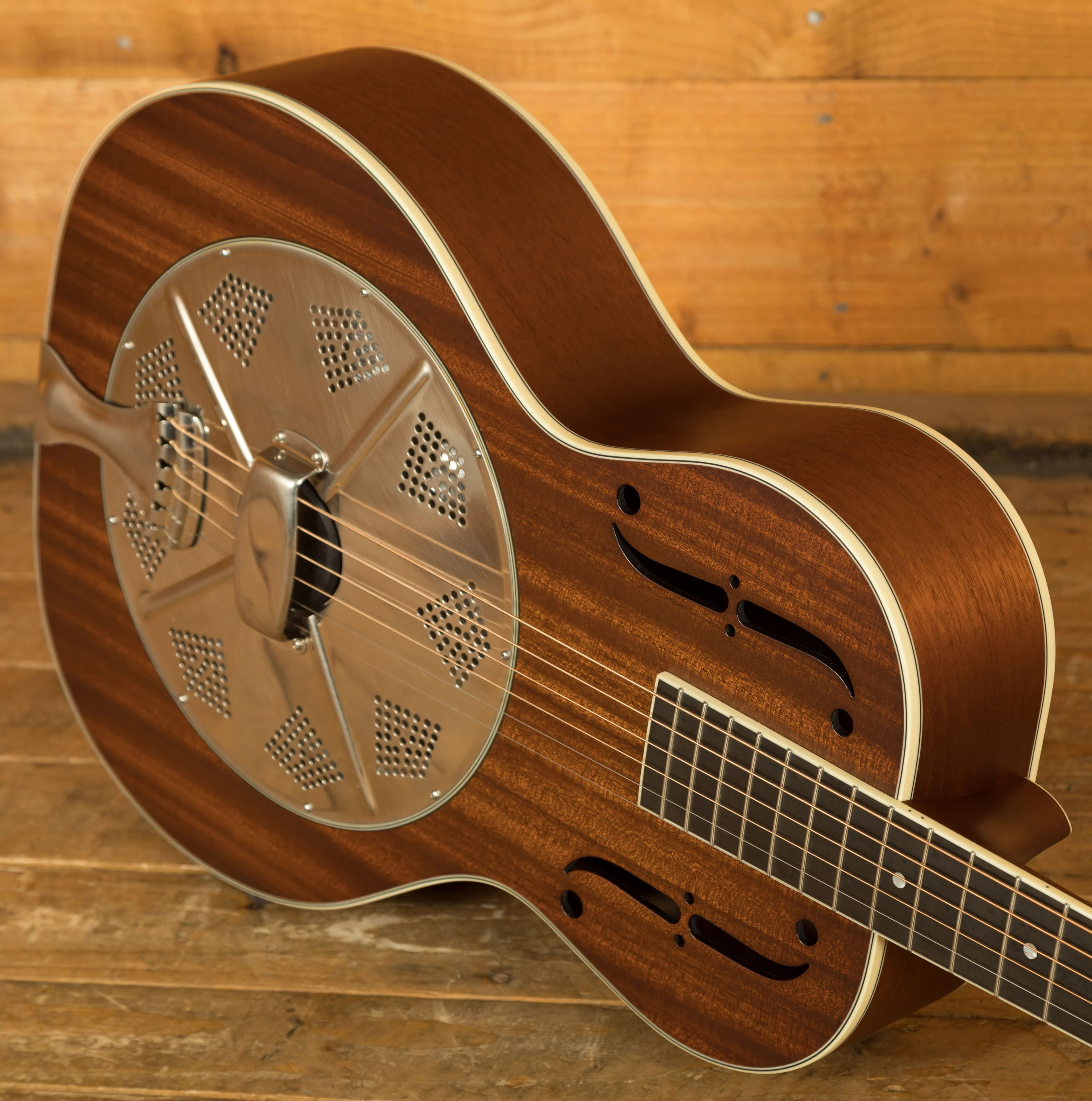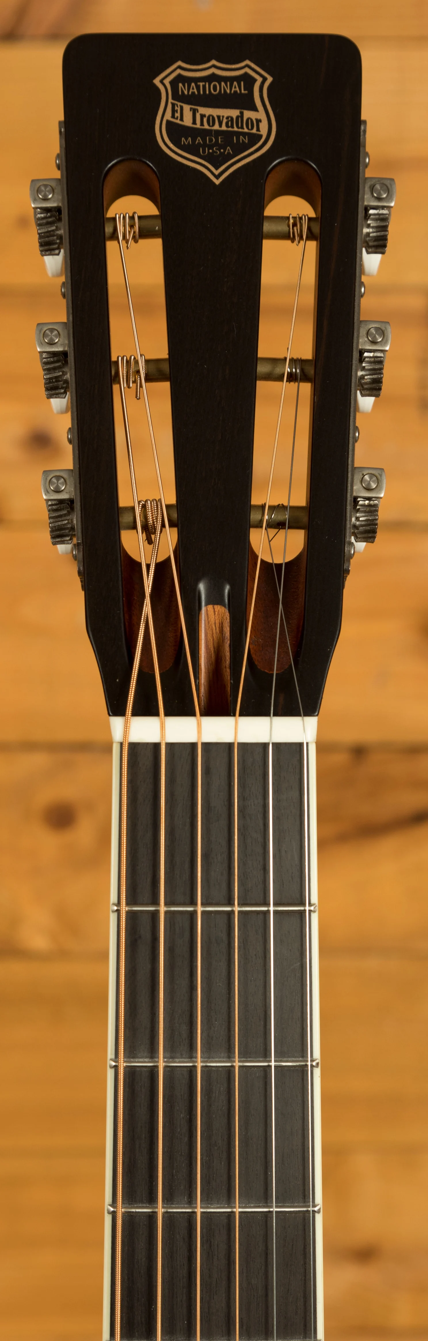 The El Trovador is distinguished by its large, four-inch-deep mahogany body, which is prized for its warm and resonant sonic properties. The wooden soundwell inside the body houses the resonator, enhancing the guitar's unique projection and tonal clarity. The body is bound with multi-layer celluloid, a classic touch that pairs beautifully with the purfling border around the iconic coverplate, adding to its vintage charm.
