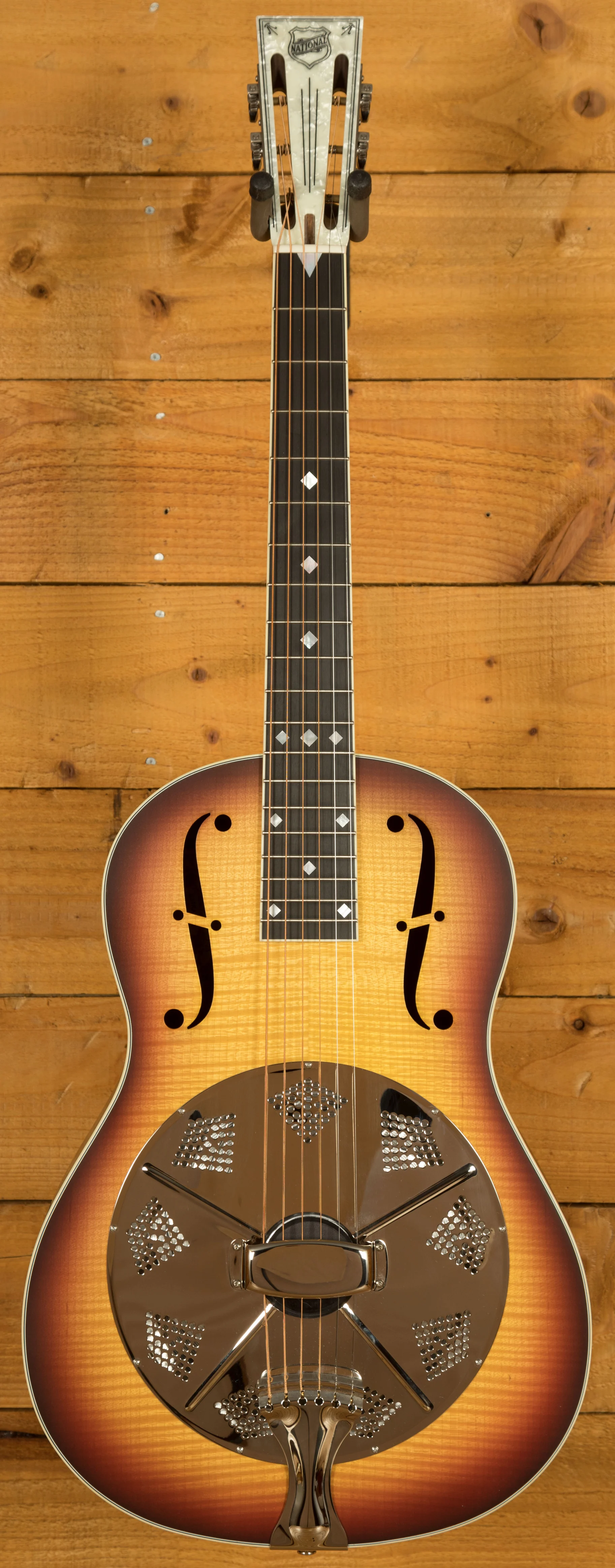 Introduced in 2001, the Estralita Deluxe has a stunning design. Its body is made of walnut for the back and sides, with a maple laminate top that showcases a glorious figured pattern. This top is triple-bound with ivoroid/black/ivoroid binding, perfectly highlighting its sunburst finish. The walnut neck is complemented by an ivoroid-bound ebony fingerboard, with mother-of-pearl diamond inlays that add an elegant touch. The slotted headstock, overlaid with white pearloid and engraved with the National logo, adds to the guitar's sophisticated appearance.