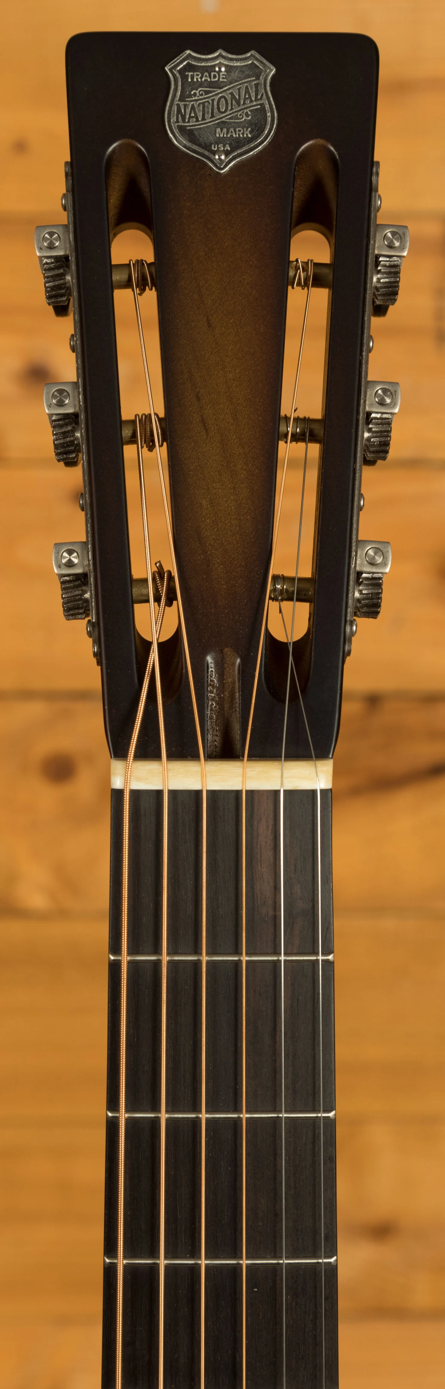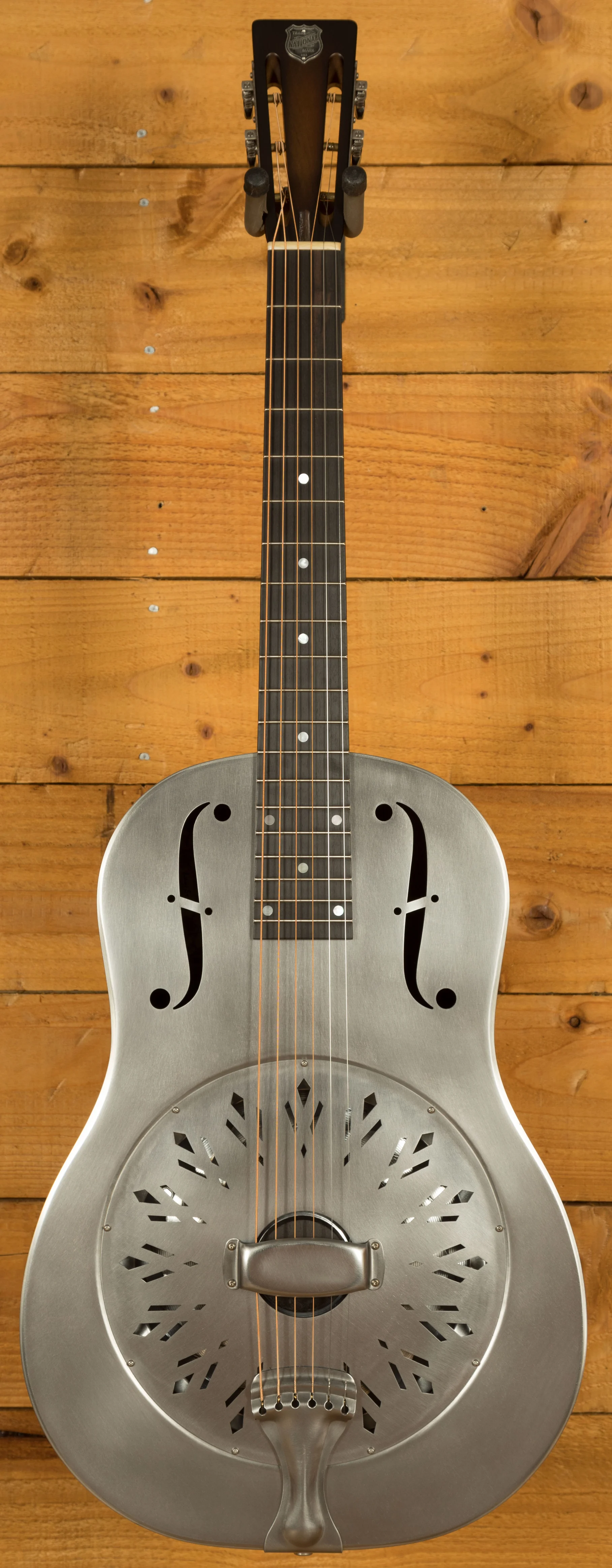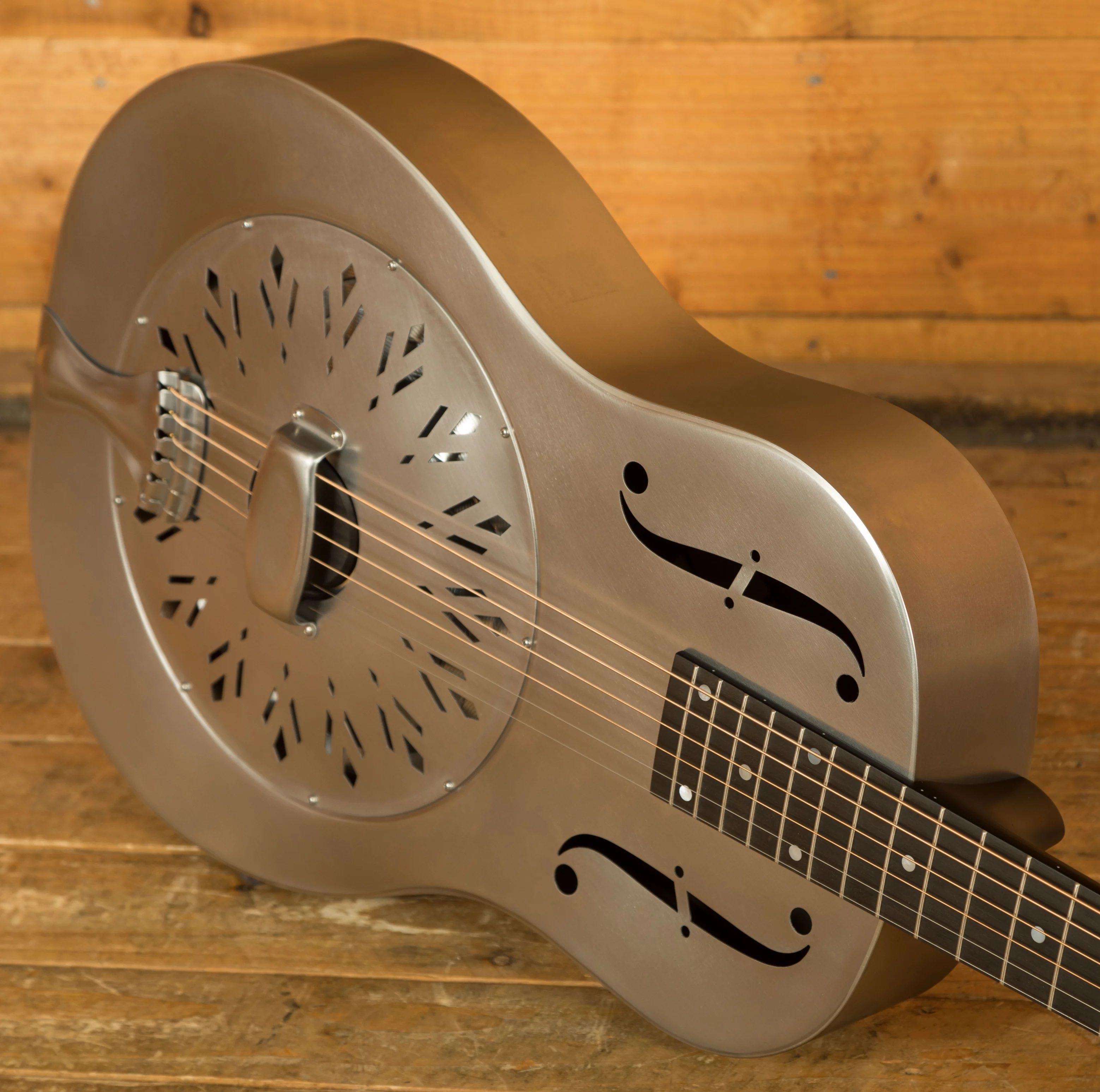 National's guitars, particularly their metal-bodied resonators, are known for their unique combination of aesthetics and durability. One standout is the National Raw Series, designed with a minimal wax finish on the body. This subtle coating not only enhances the natural, smooth feel of the instrument but also allows the metal to develop a rich patina over time, adding character with age. The steel body is complemented by a hardrock maple neck and a chicken-foot resonator cover plate, hallmarks of this series' blend of elegance and functionality.