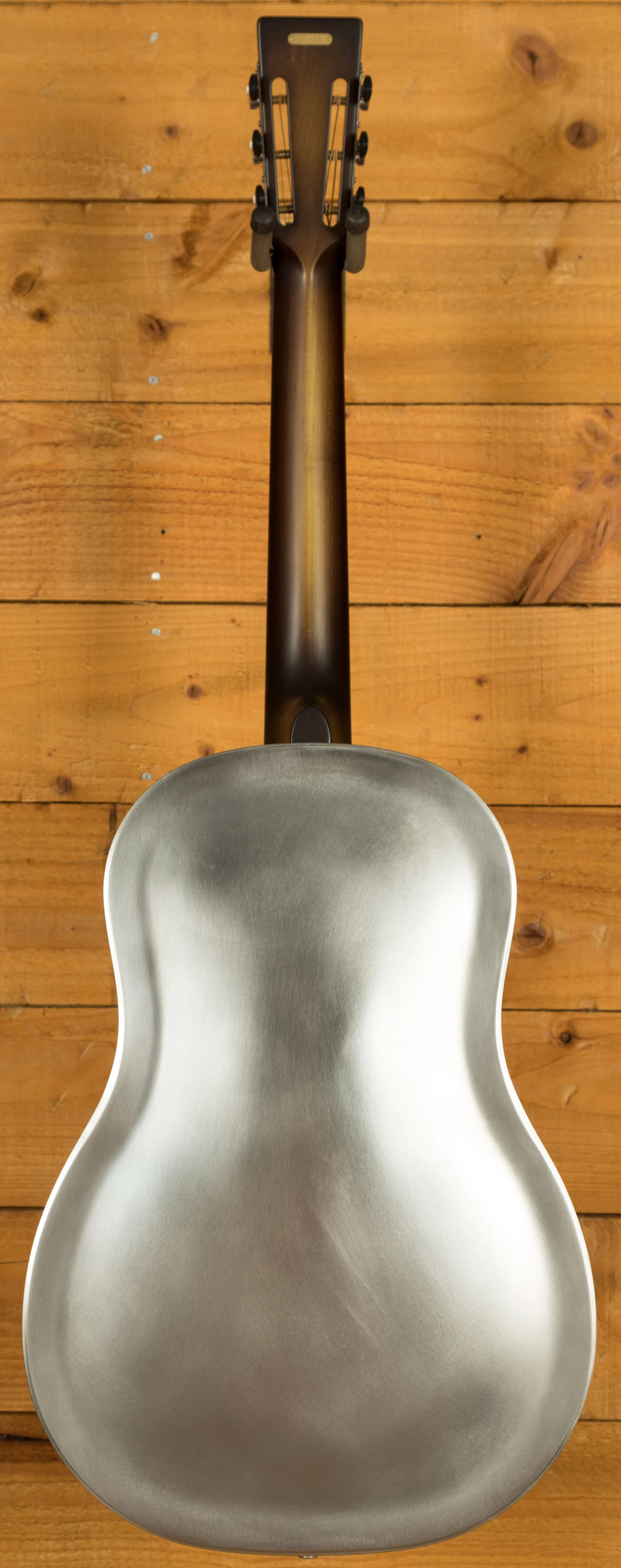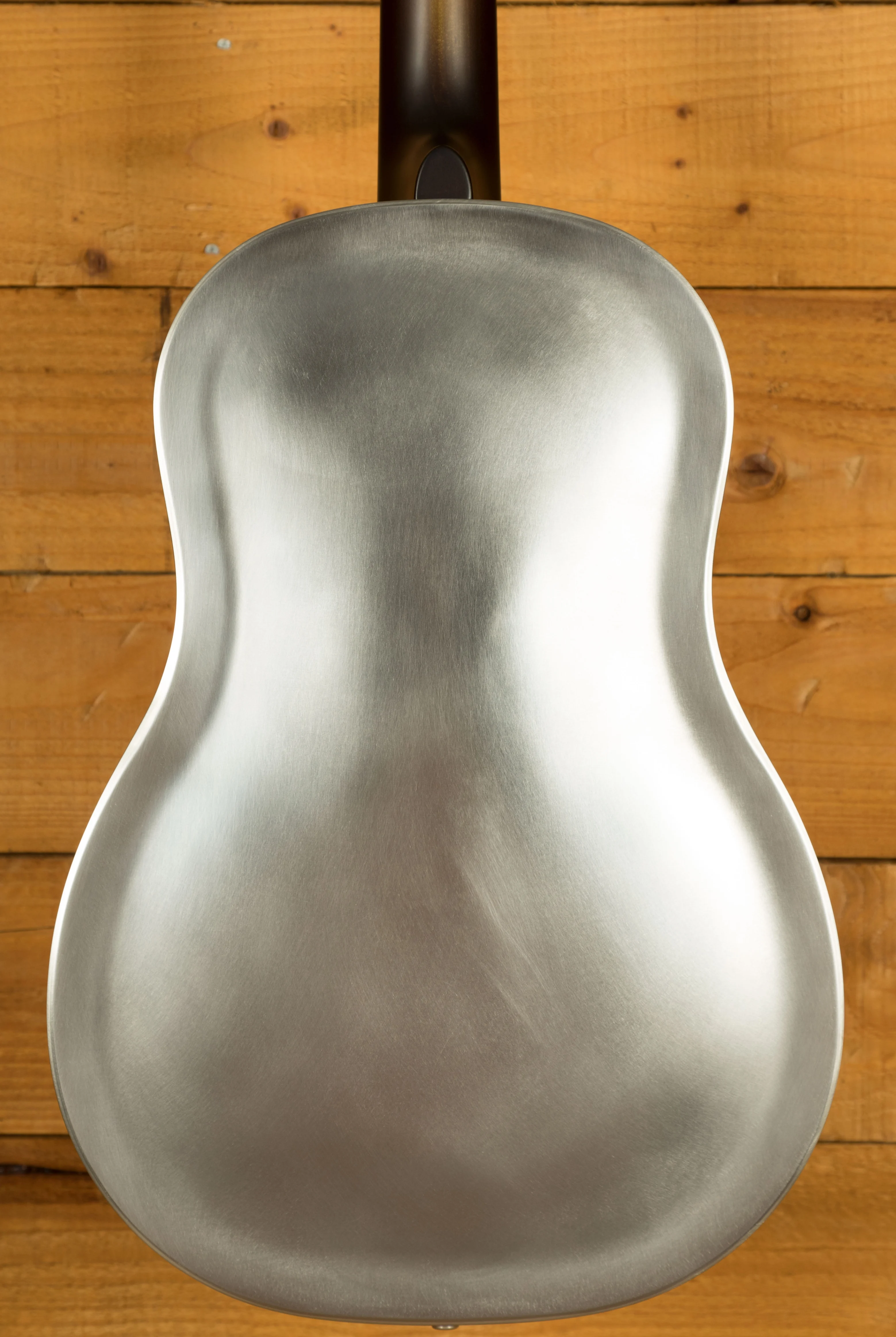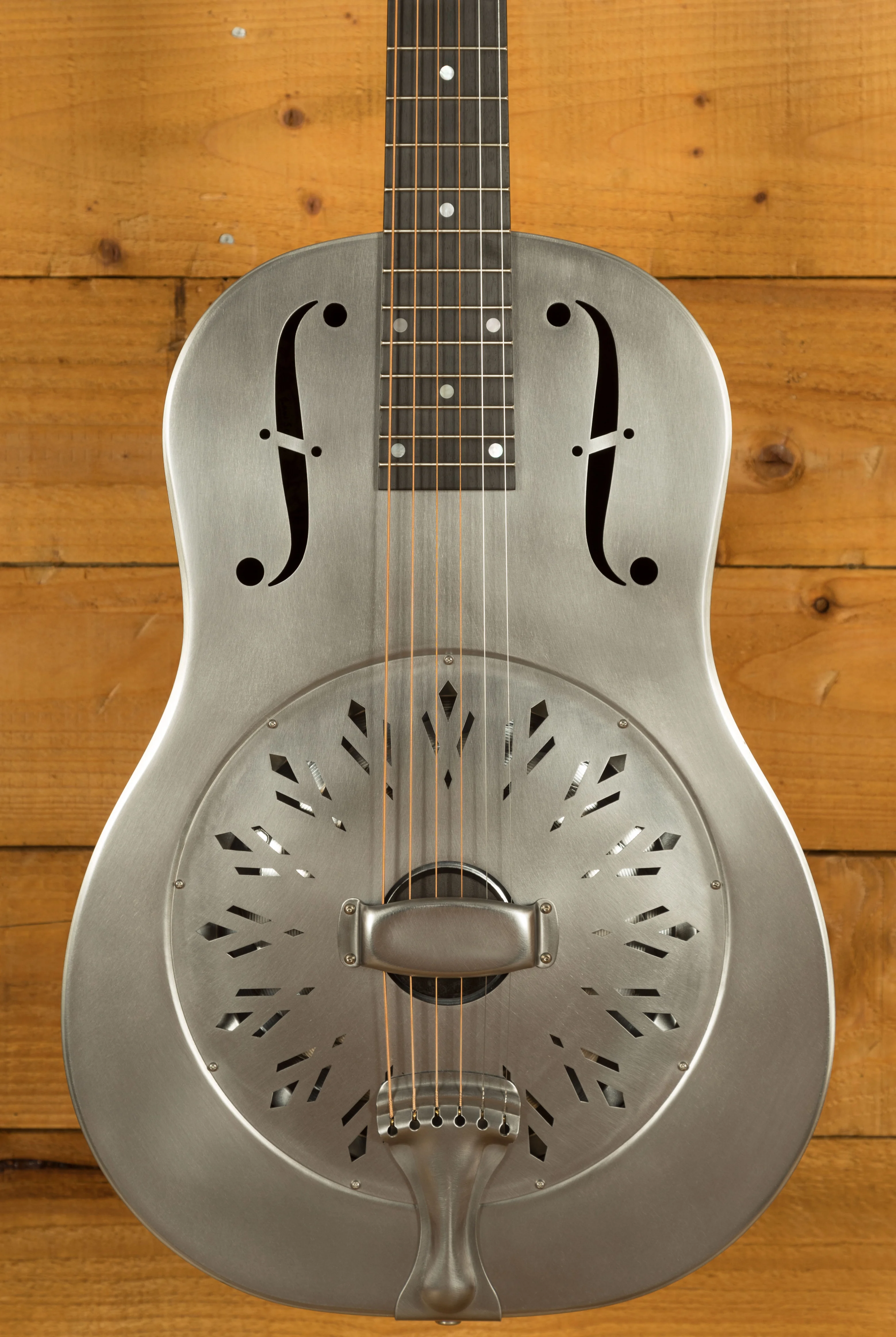 National's guitars, particularly their metal-bodied resonators, are known for their unique combination of aesthetics and durability. One standout is the National Raw Series, designed with a minimal wax finish on the body. This subtle coating not only enhances the natural, smooth feel of the instrument but also allows the metal to develop a rich patina over time, adding character with age. The steel body is complemented by a hardrock maple neck and a chicken-foot resonator cover plate, hallmarks of this series' blend of elegance and functionality.
