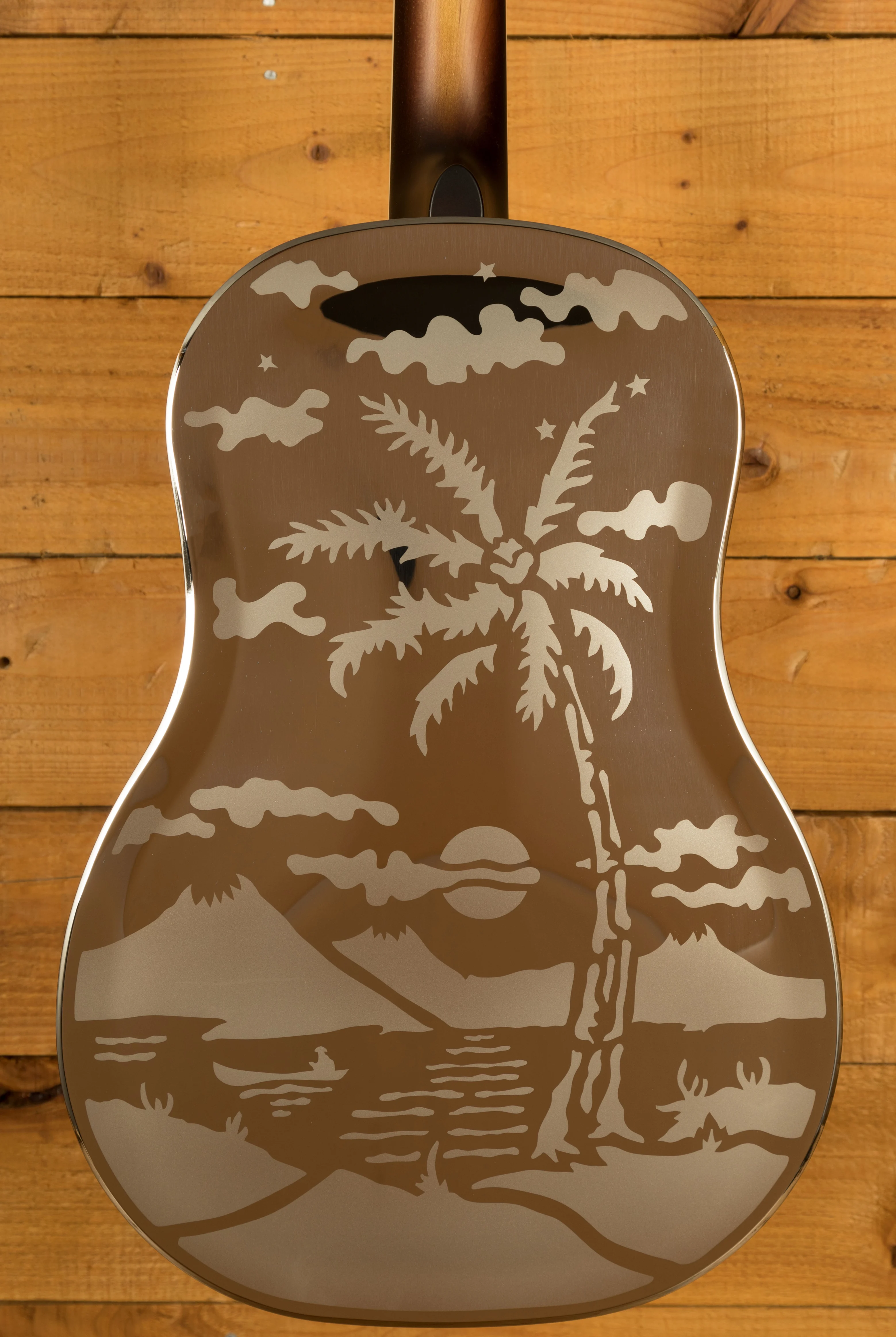 Today's Style O is built with the same attention to detail that made it famous. The body, crafted from brass and polished to a mirror-like finish, is plated in nickel and etched with the famous scene of the Aloha Isles, capturing the tropical allure that has defined its aesthetic for generations. The maple neck is finished in a classic sunburst, while the ivoroid-bound ebony fretboard is crowned by vintage-style engraved tuners, combining elegance with a nod to its rich history.