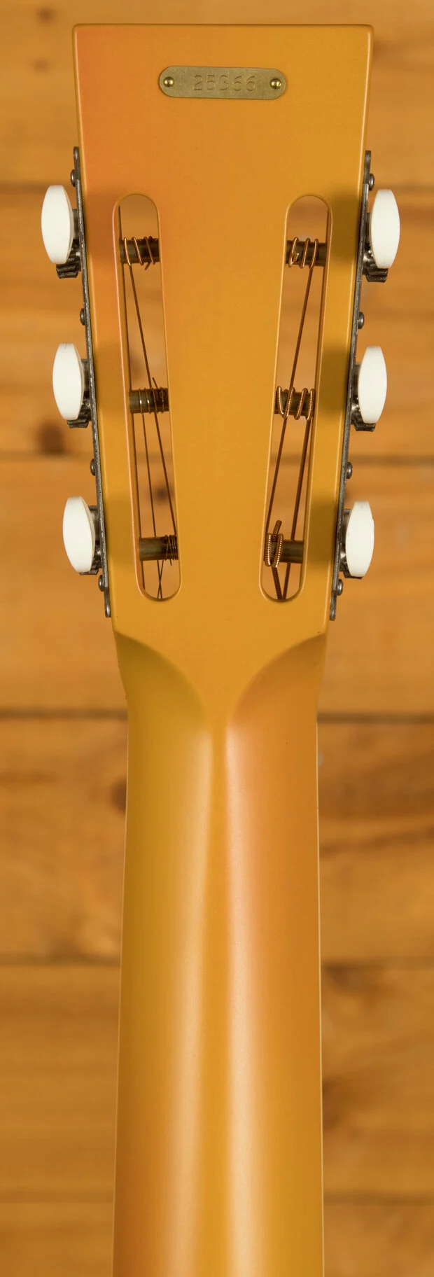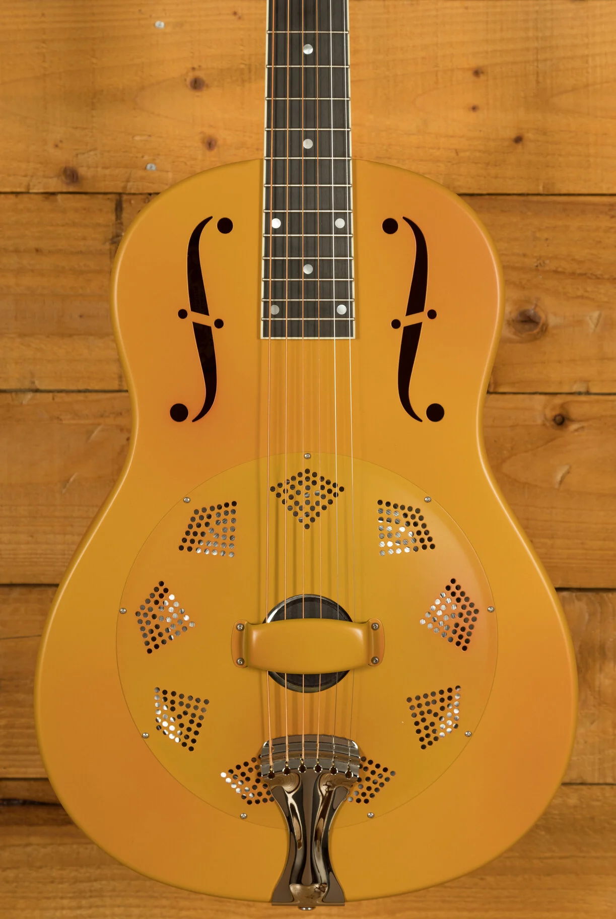 A key feature of this model is its wooden body, a custom option that sets it apart from the typical thin-gauge steel used in other models. Like its predecessors, the guitar boasts flat-cut f-holes, a formed back, and a traditional non-ribbed coverplate. It also follows the early 12-fret, large-body design, rather than the later 14-fret, smaller-body versions that became popular in the mid-20th century.