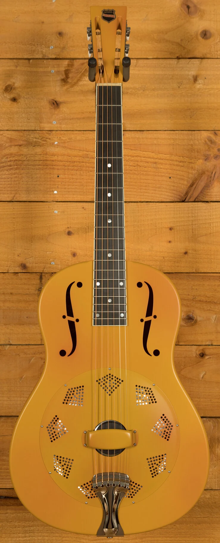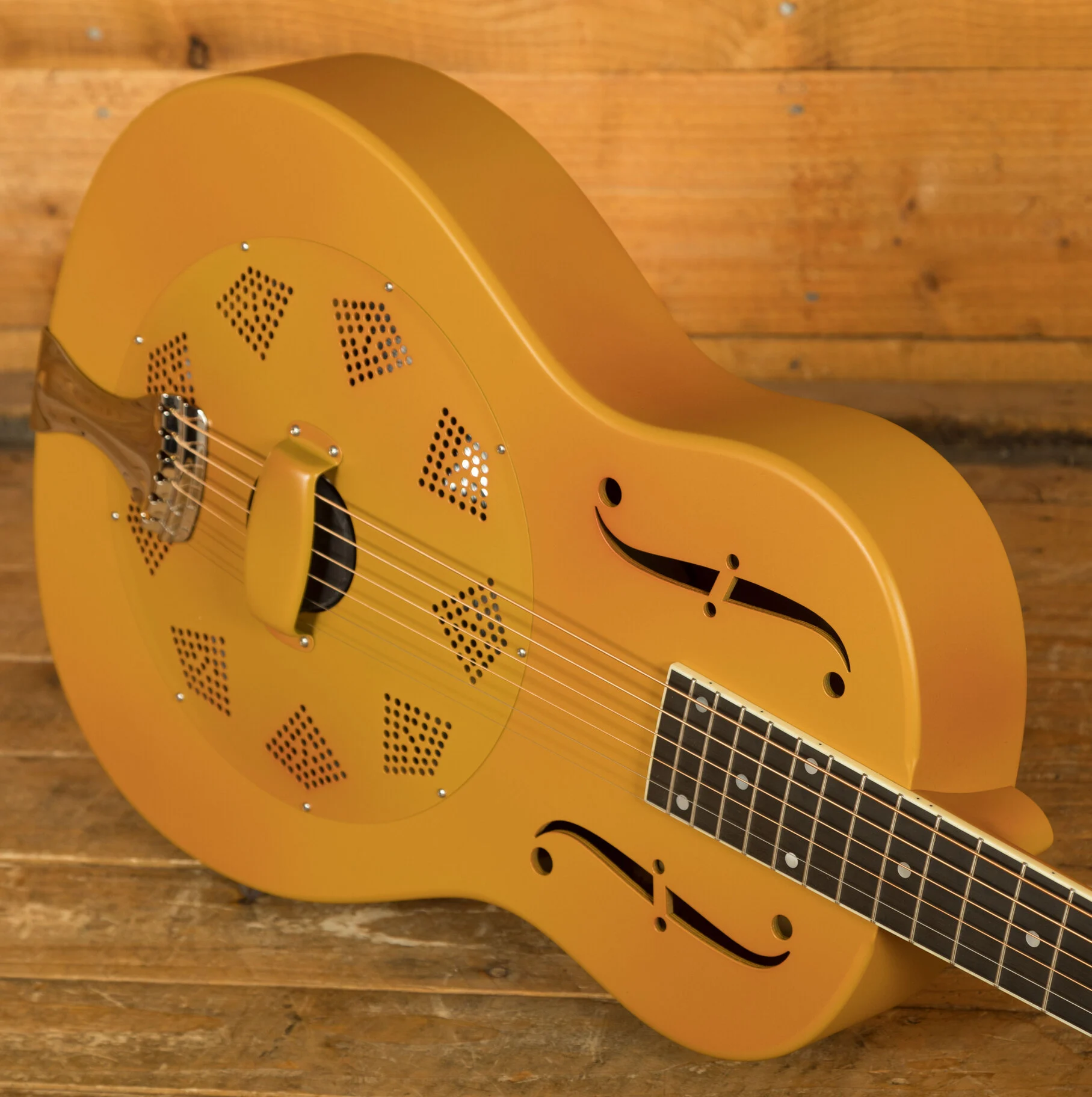 The maple neck is complemented by an ebony fretboard with ivoroid binding, enhancing both its durability and aesthetic. Traditional engraved tuners add a vintage charm, but the inclusion of a modern adjustable truss rod offers added practicality - a feature missing from the original Nationals. However, this reissue doesn't compromise on sound; it delivers the same sweet, rich tones that made National Guitars a favourite amongst musicians in the 1930s.