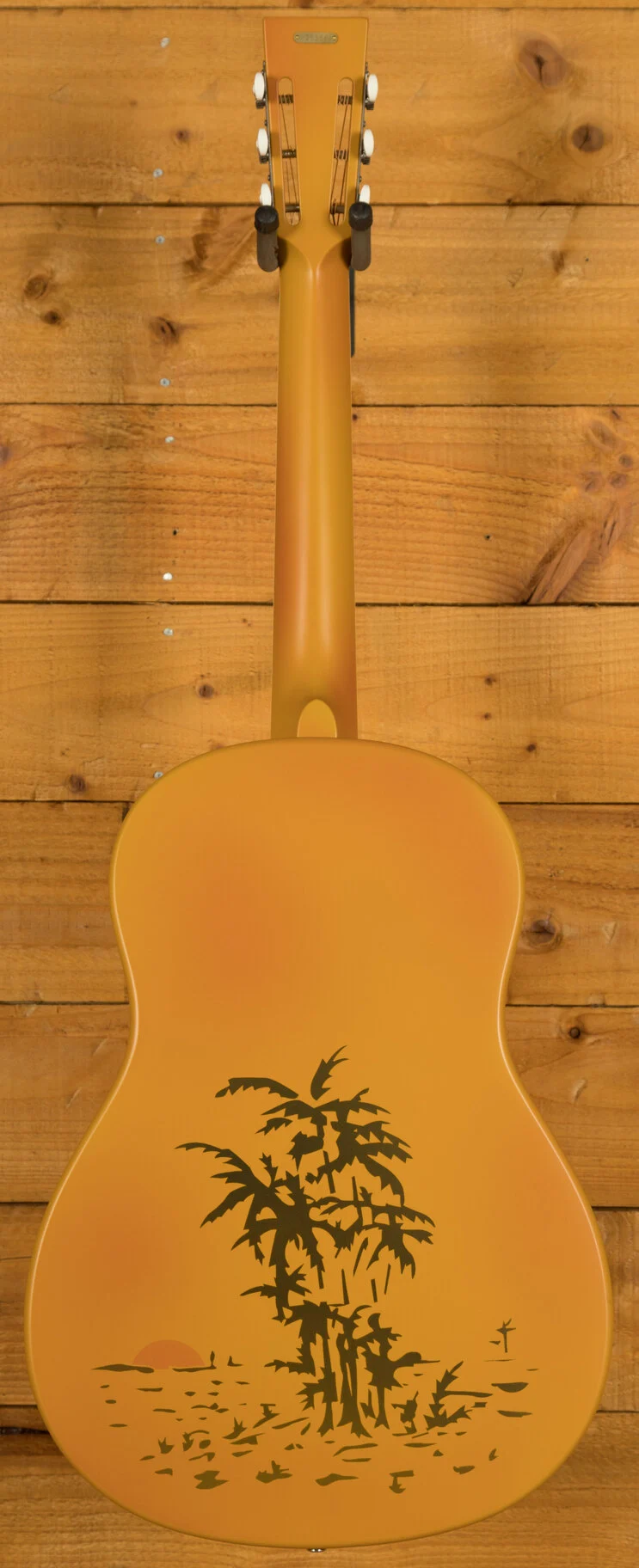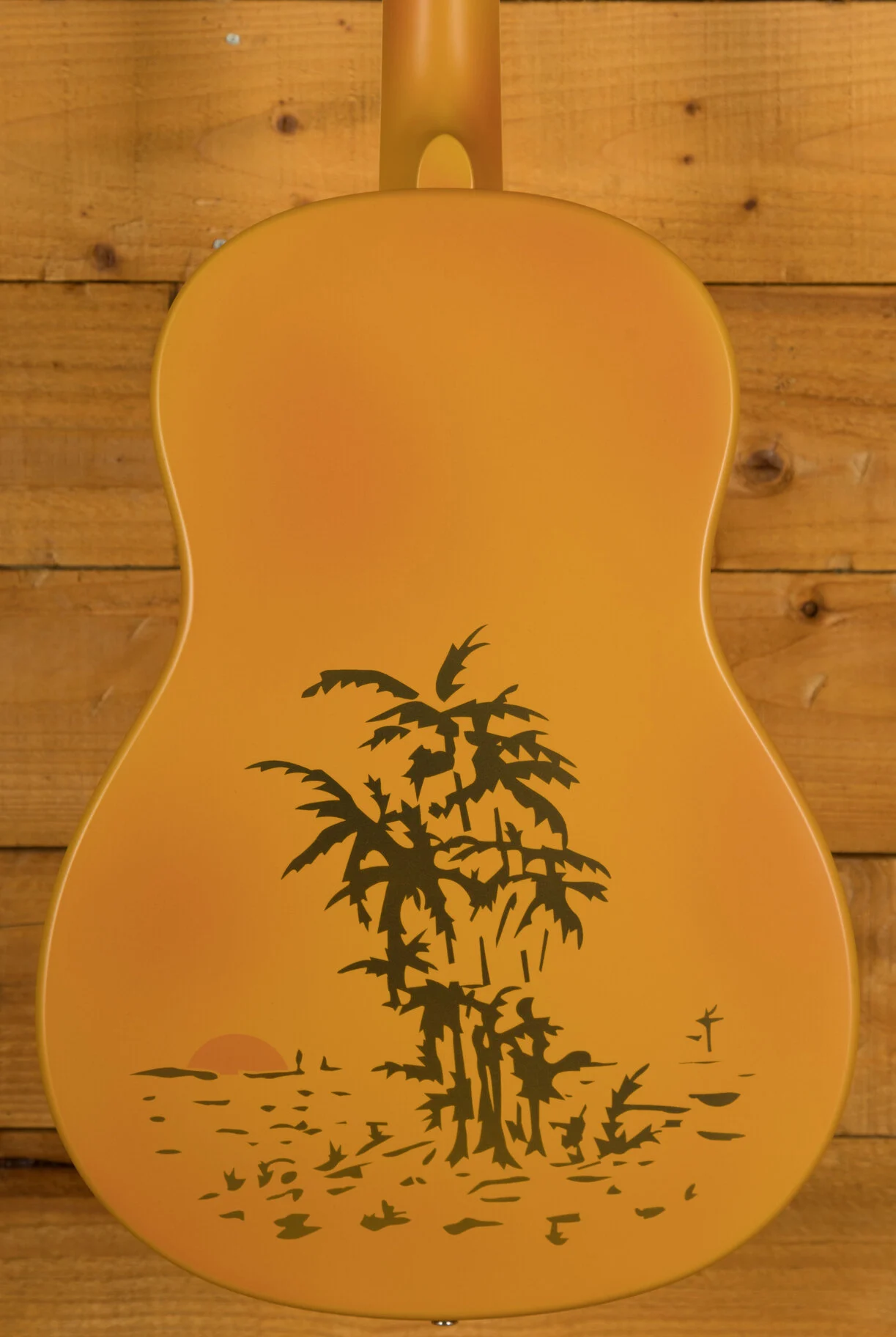One of the standout models in their Singlecone range is the Triolian Polychrome, a reissue that captures the essence of the early Triolians first produced in the late 1920s and 1930s. The original Triolians were known for their unique golden Polychrome finish, with a beautiful stencilled scene on the back featuring a sunset over swaying palm trees along a shoreline - evoking the idea of Paradise. This reissue pays homage to that iconic design, preserving both the visual appeal and the special sound of the early single-cone Nationals.