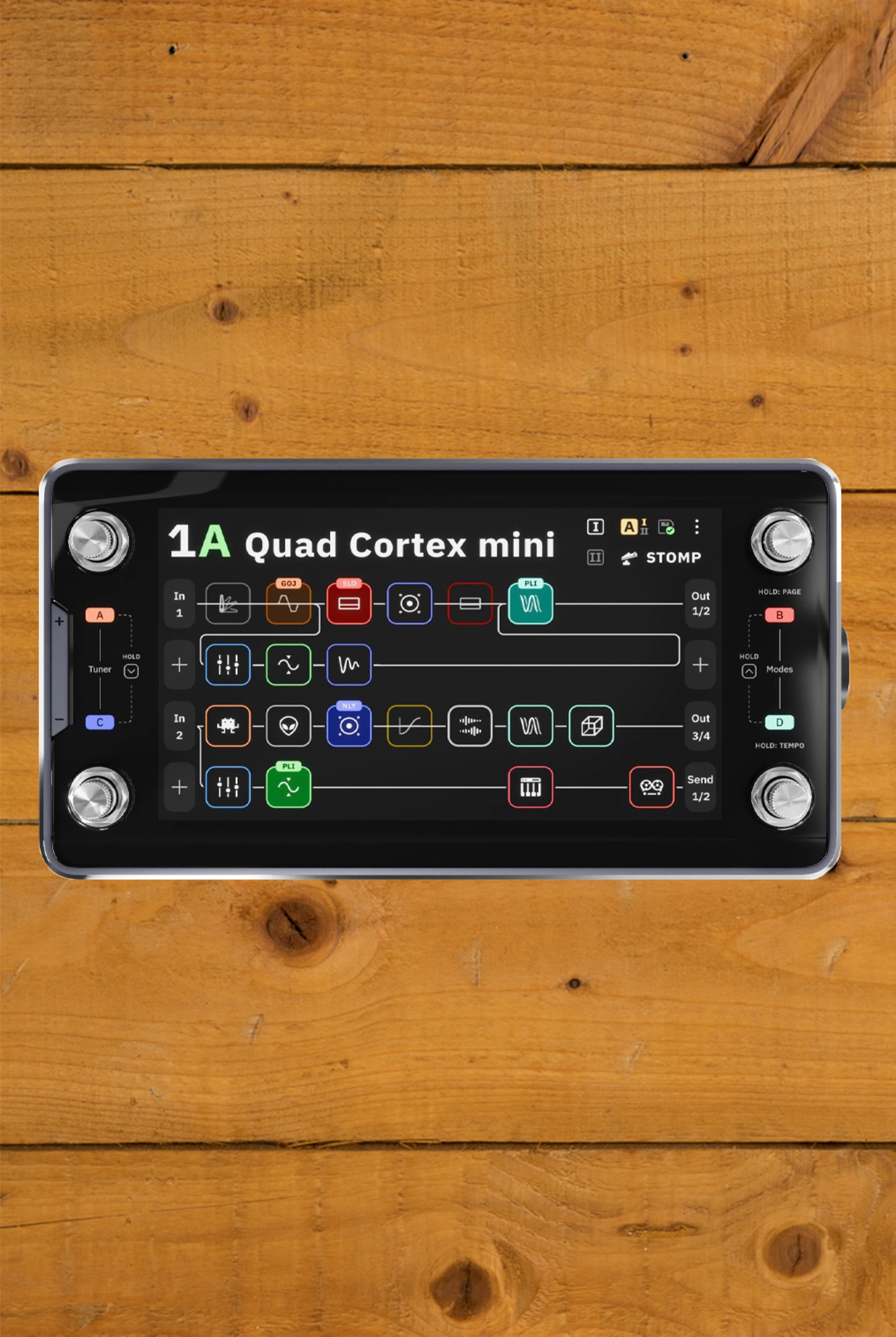 At the heart of the Quad Cortex Mini is the beautiful 7” touchscreen display, which is where you’ll find the “Tone Grid”. This grid is the visual workspace at the heart of the Quad Cortex Mini, making it easy to build, understand and modify signal chains without menu diving or hidden layers. Create rigs by placing virtual device blocks across a clear, grid-based signal flow, then freely rearrange blocks, split signals into parallel paths and route any part of your chain to different outputs with confidence and precision. When a block is selected, the rotary footswitches automatically map to the most relevant parameters, which make tweaking your tone super easy to do, there’s no need to get lost in menus.