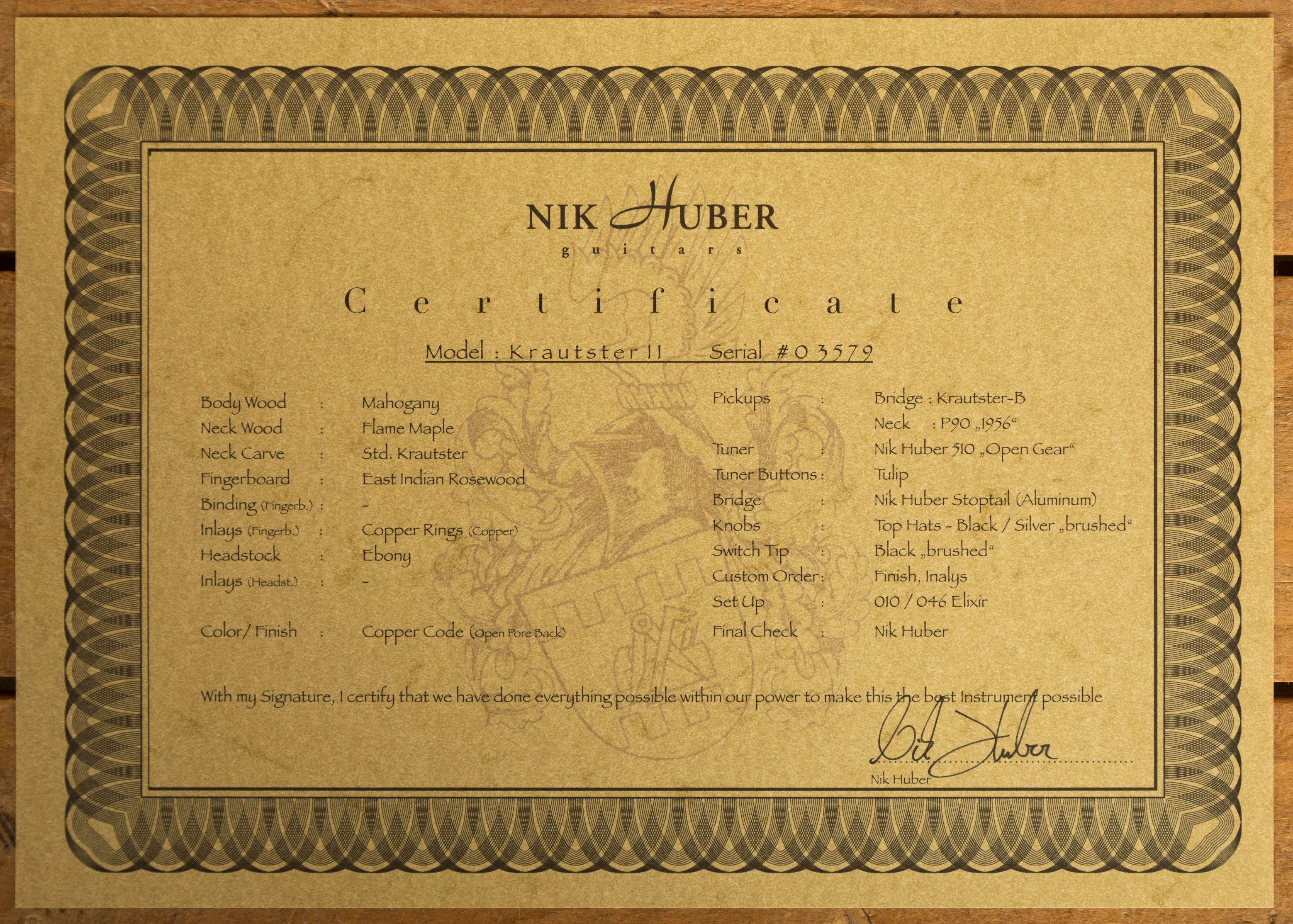 Equipped with a Custom Krautster bridge humbucker and "1956" P90, the Krautster II delivers a versatile range of vintage tones. The Aluminium Nik Huber Stoptail bridge and Nik Huber 510 "Open Gear" tuners with Tulip buttons ensure reliable tuning and precise intonation.