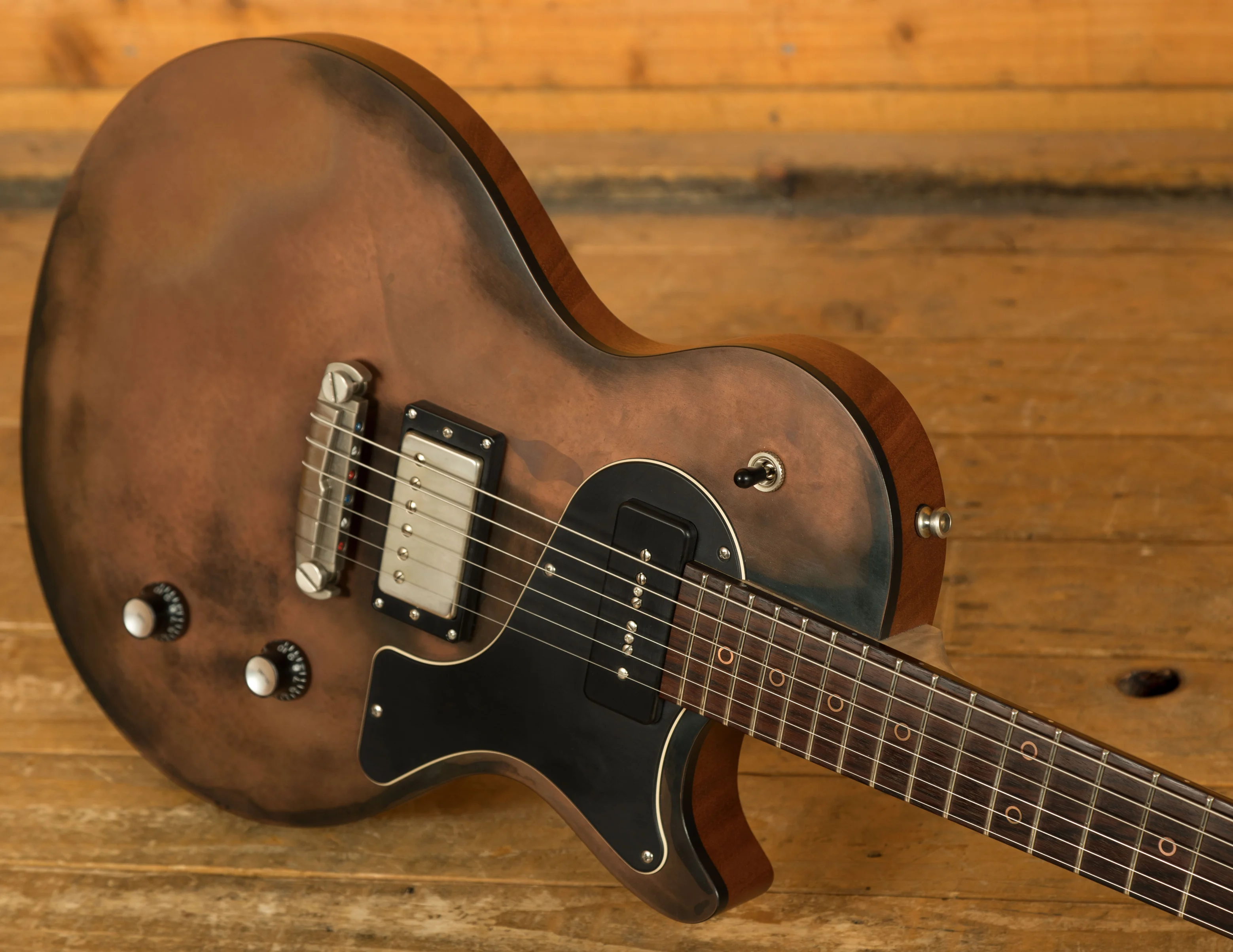 Constructed with a Mahogany body featuring a "Copper Code" top finish, the Krautster II exudes a rock and roll aesthetic. The 25" scale Flame Maple neck is adorned with an East Indian Rosewood fretboard, boasting a 10-14" compound radius and Copper ring inlays. The guitar is topped off with an Ebony headstock veneer for a sleek finish.