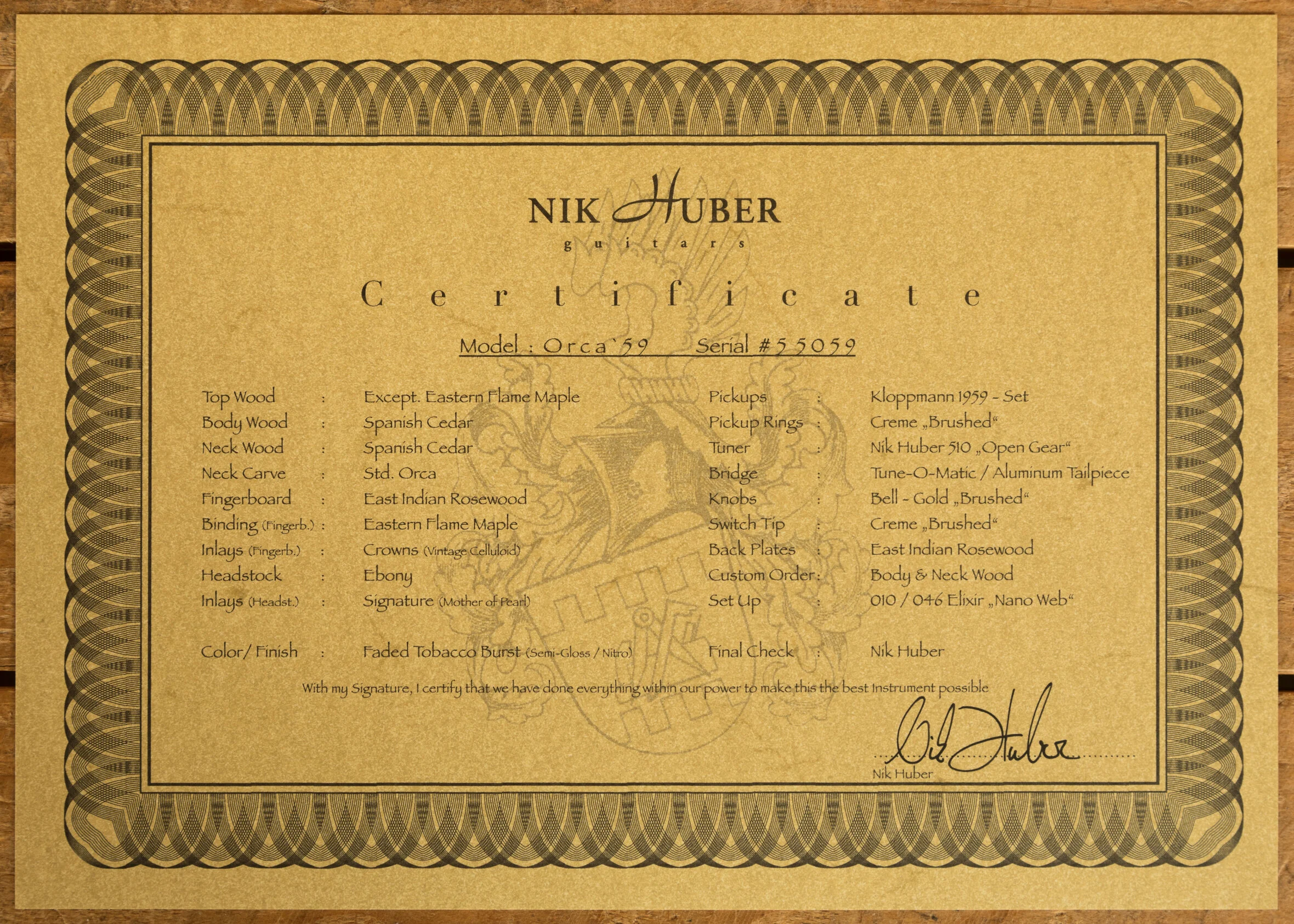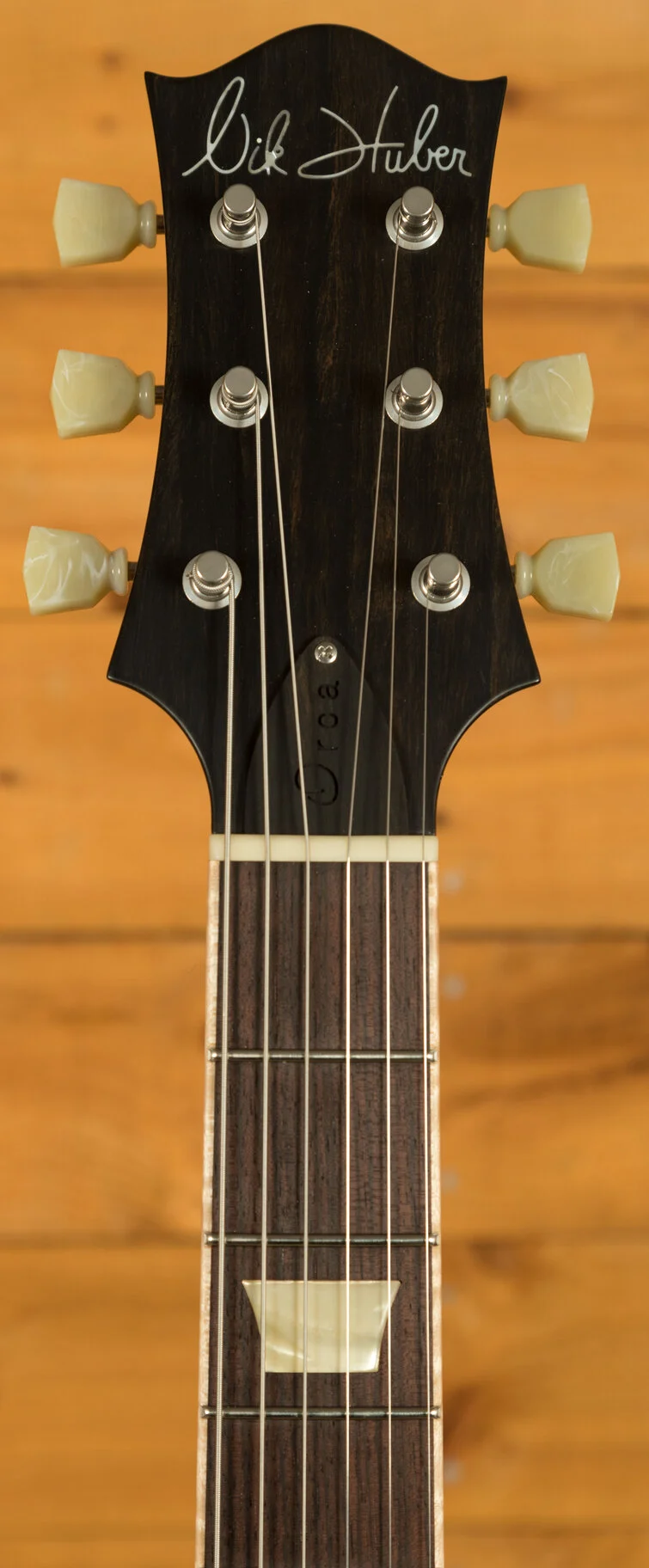 Discover the quality of this Nik Huber Orca '59, handcrafted by Nik Huber and his team in Germany. A standout in Hubers lineup, this guitar features a Spanish cedar one-piece body topped with a two-piece exceptional flame maple (Curly/Flame Maple from Eastern/Michigan), finished in a striking Faded Tobacco Burst that enhances the woods natural character. The Spanish cedar neck, carved to a fat back profile, is paired with an East Indian rosewood fingerboard featuring curly maple binding, an ebony headstock veneer, and crown trapezoid mother-of-pearl (MOP) inlays, providing a 25" scale length for a comfortable, vintage-inspired playing experience. Set up to perfection under Nik Hubers watchful eye before leaving the factory, this Orca '59 arrives ready to perform straight out of the box.