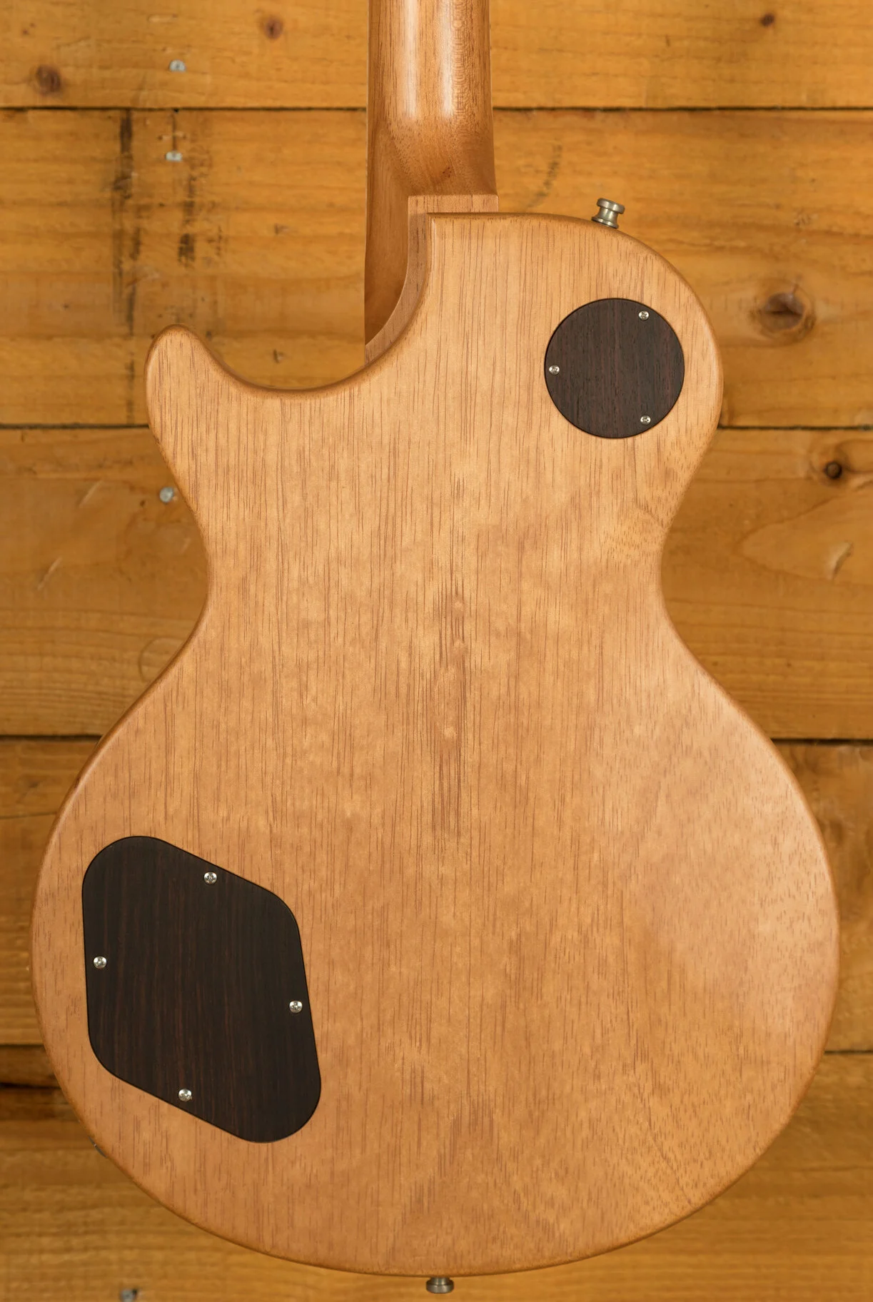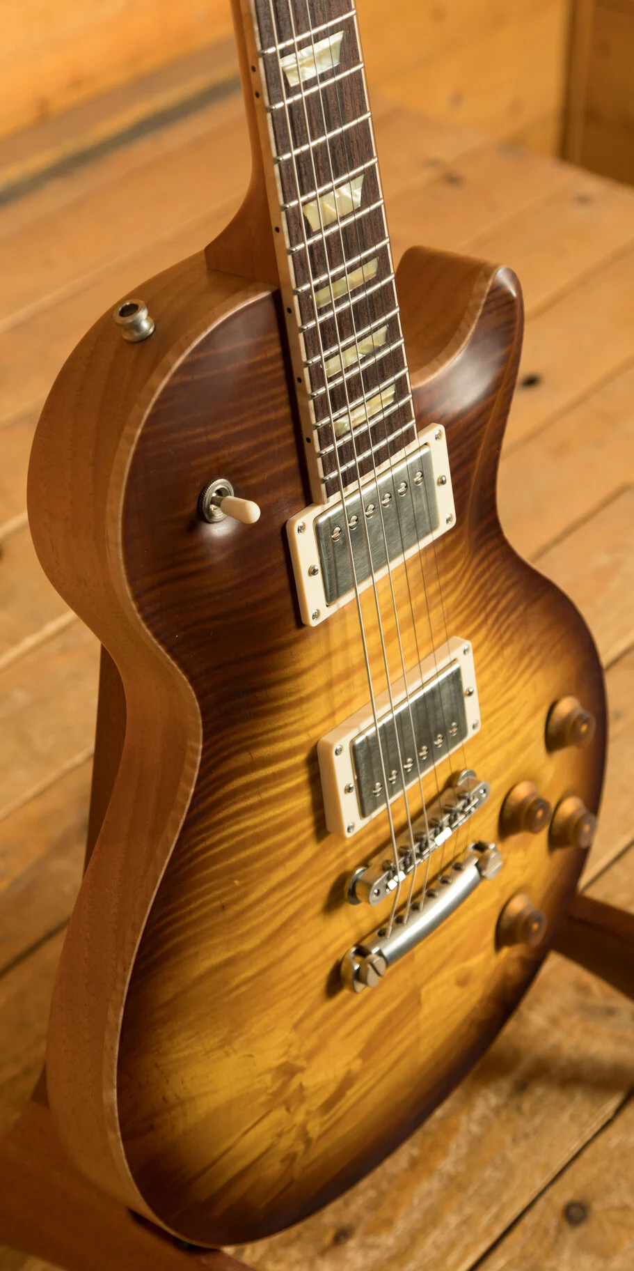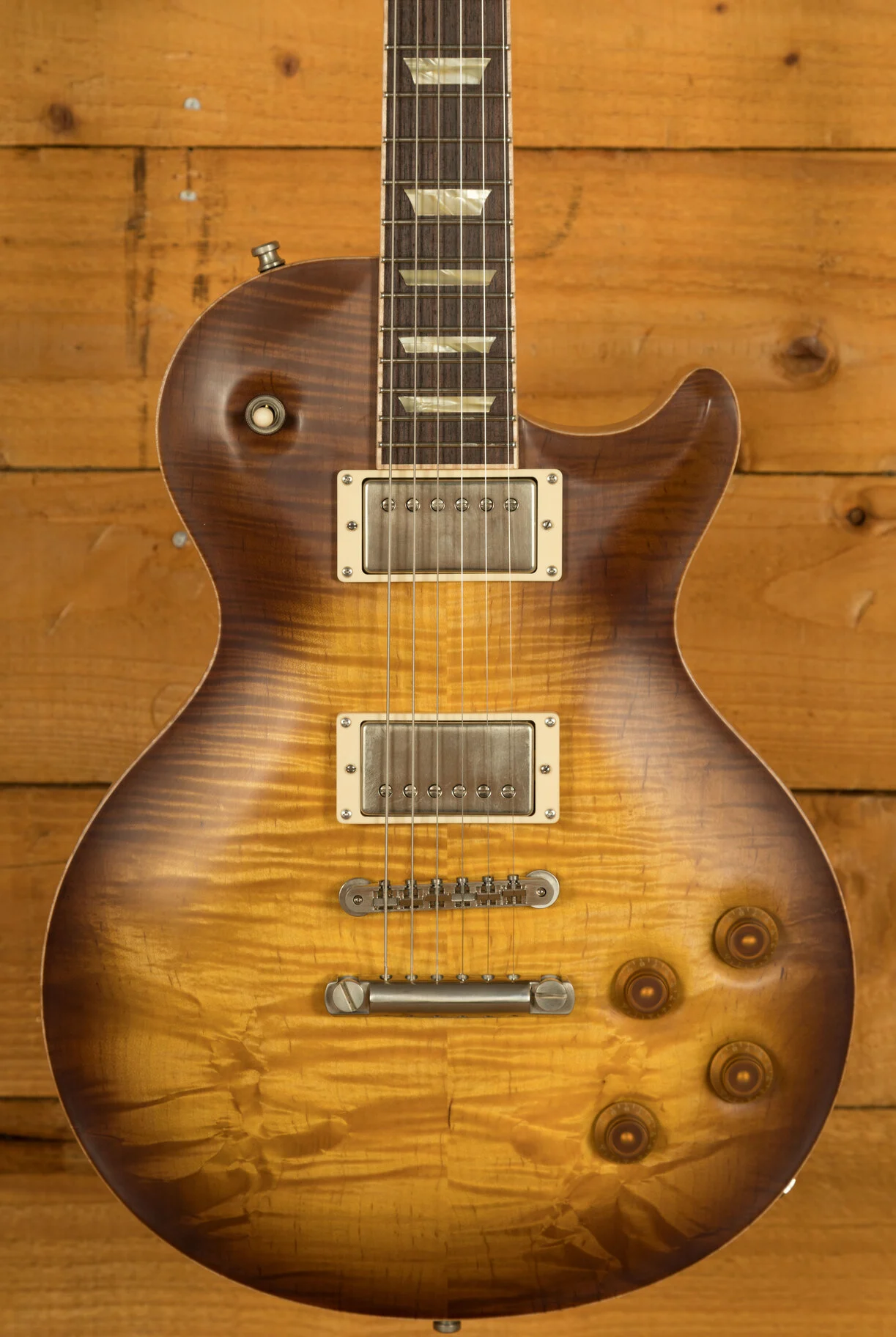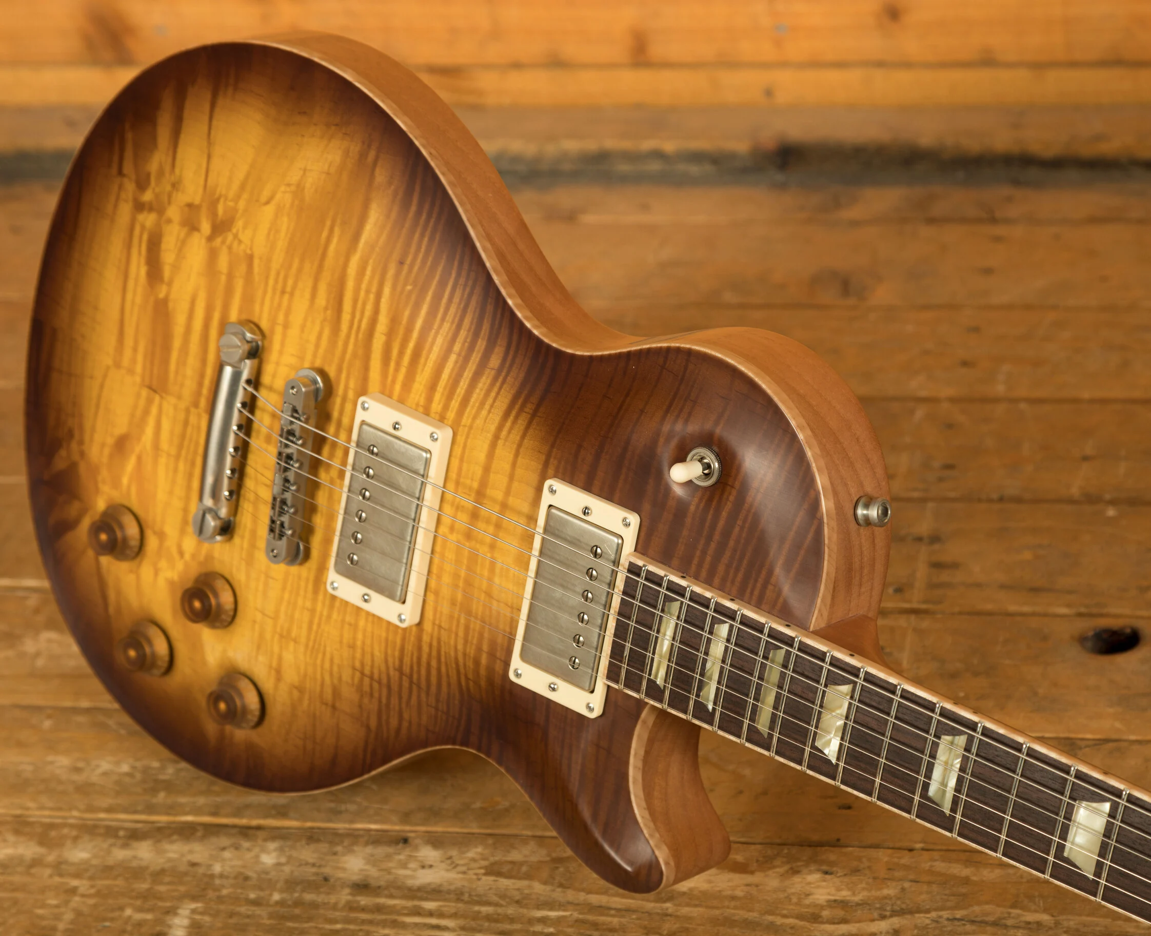 Body & Neck: Spanish cedar one-piece body with a two-piece exceptional flame maple top (Curly/Flame Maple from Eastern/Michigan) in Faded Tobacco Burst finish, paired with a Spanish cedar neck featuring a fat back profile and an East Indian rosewood fingerboard with curly maple binding, ebony headstock veneer, and crown trapezoid mother-of-pearl (MOP) inlays, offering a 25" scale length.