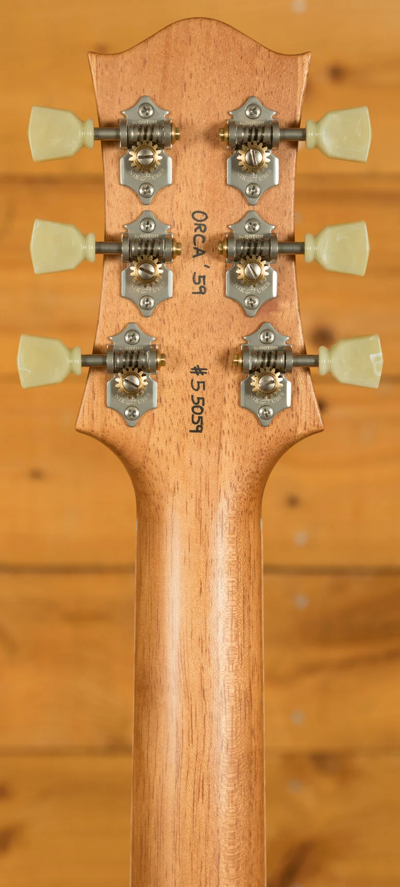 This Orca '59 is equipped with custom Set '59 Kloppmann Humbucker pickups, delivering a warm, robust tone with the classic depth and clarity of vintage humbuckers, perfect for blues, rock, and beyond. Controlled by 2 volume and 2 tone controls with a 3-way toggle switch, including a push/pull on the neck tone for coil tap, it offers versatile tonal options with a rich, organic voice. The Tune-o-matic with tailpiece ensures solid intonation and sustain, complemented by Gotoh Kluson-style tuners and nickel hardware for a period-correct look and feel.
