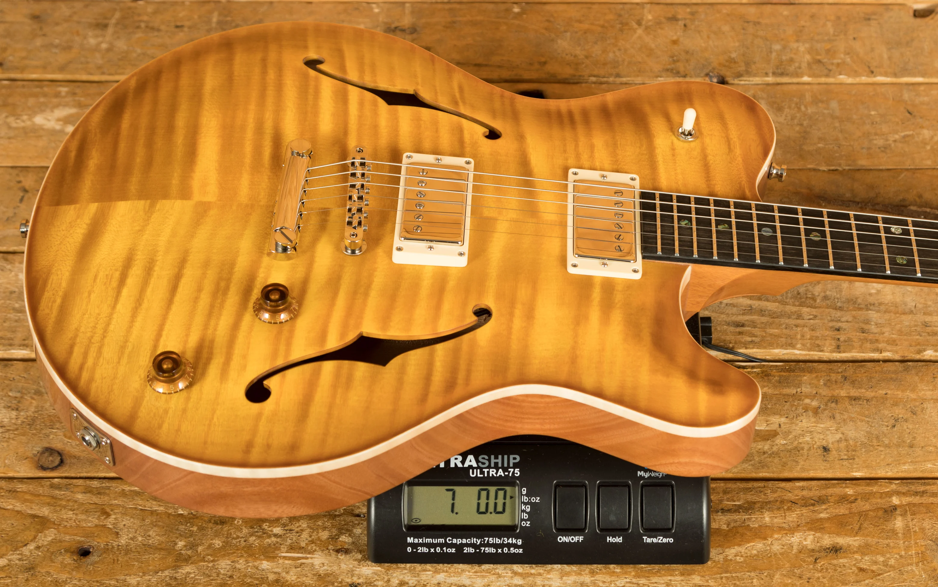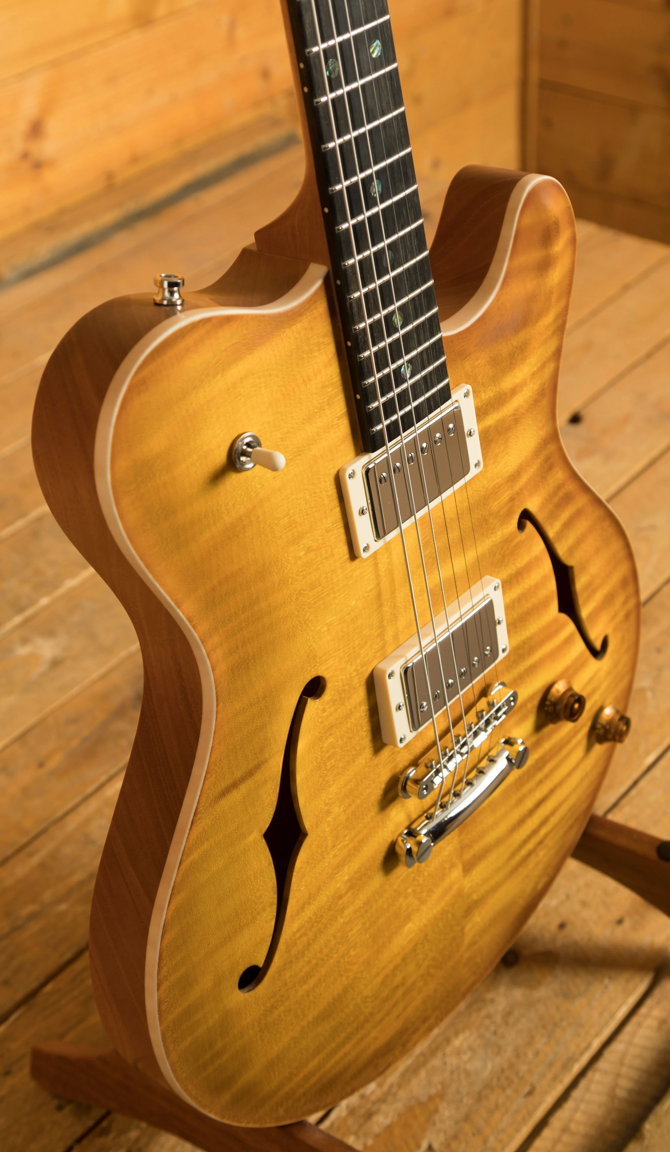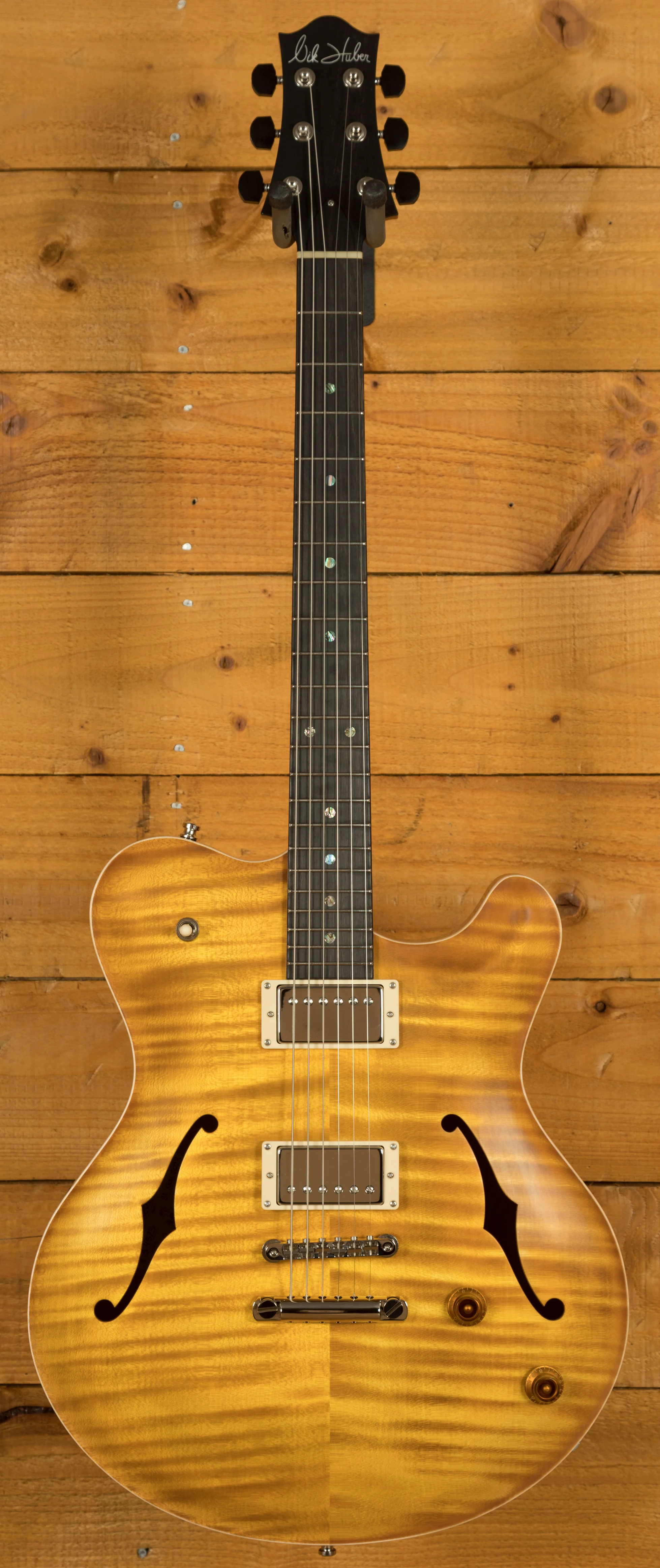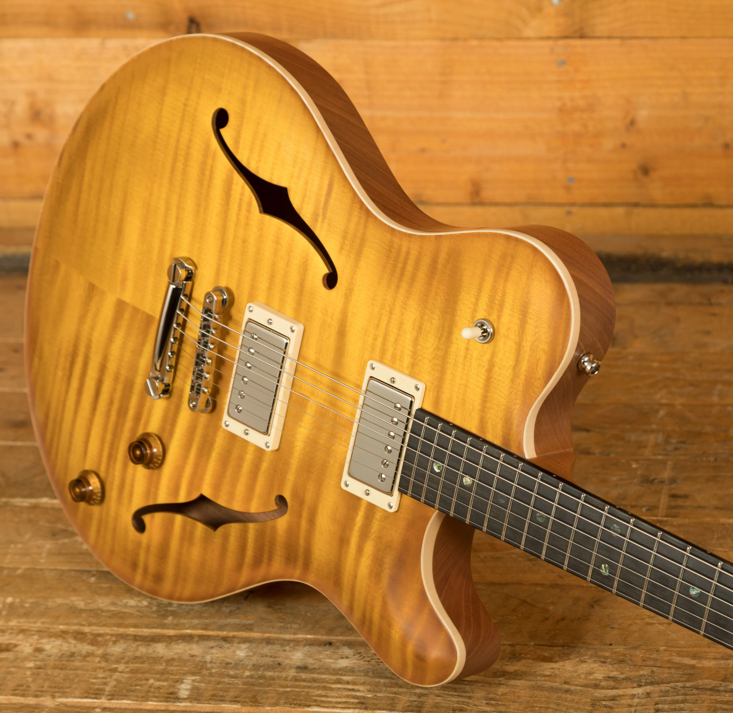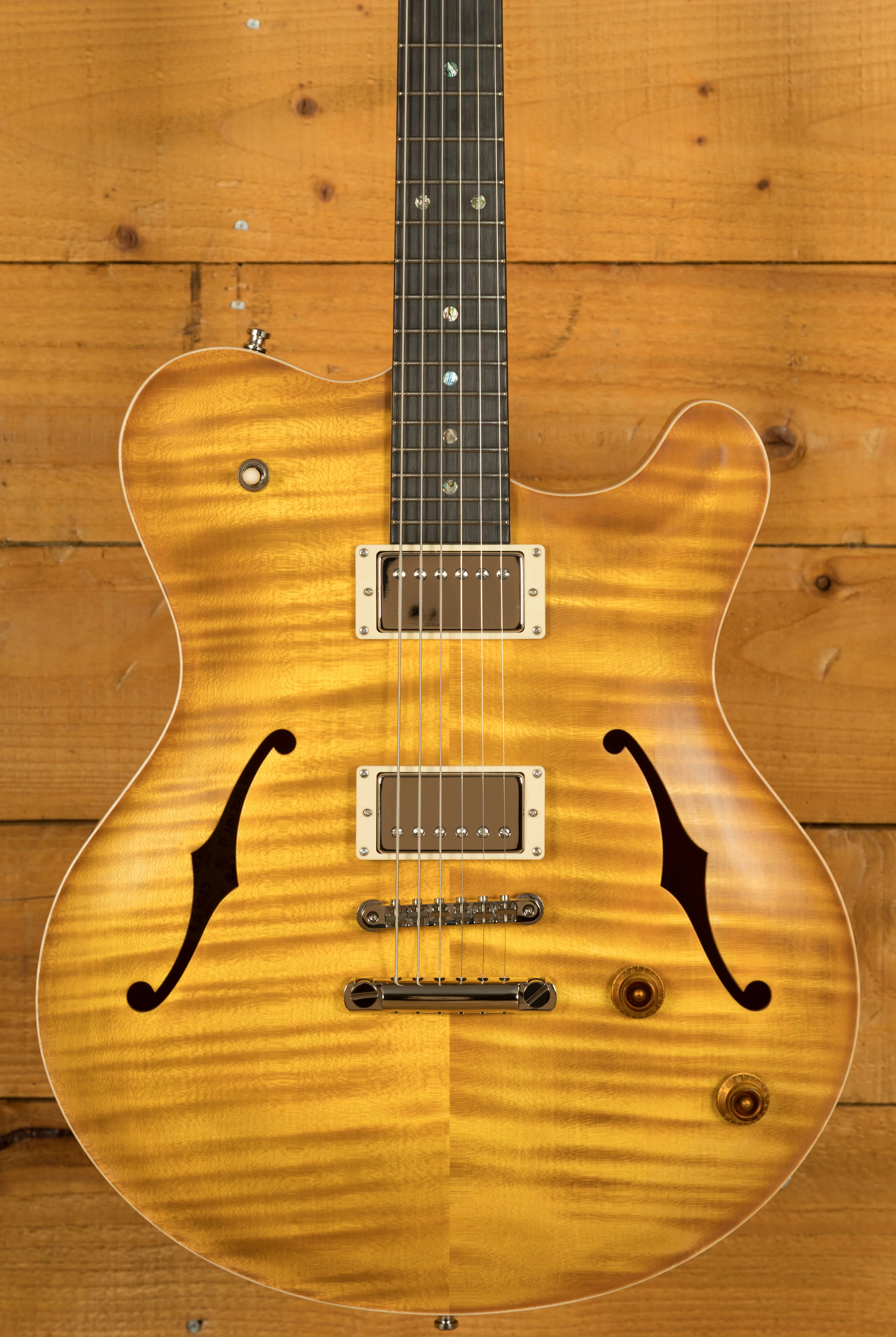 Crafted with a Mahogany hollow-body featuring a Middleblock and an Exceptional Flame Maple Top, the guitar is elegantly finished in a Faded Sunburst Semi-gloss. The Mahogany neck, paired with an Ebony fingerboard and matching Ebony headstock veneer, offers a 25.5" scale length, compound 10"-14" radius, and a polished bone nut, ensuring both exceptional tone and playability.