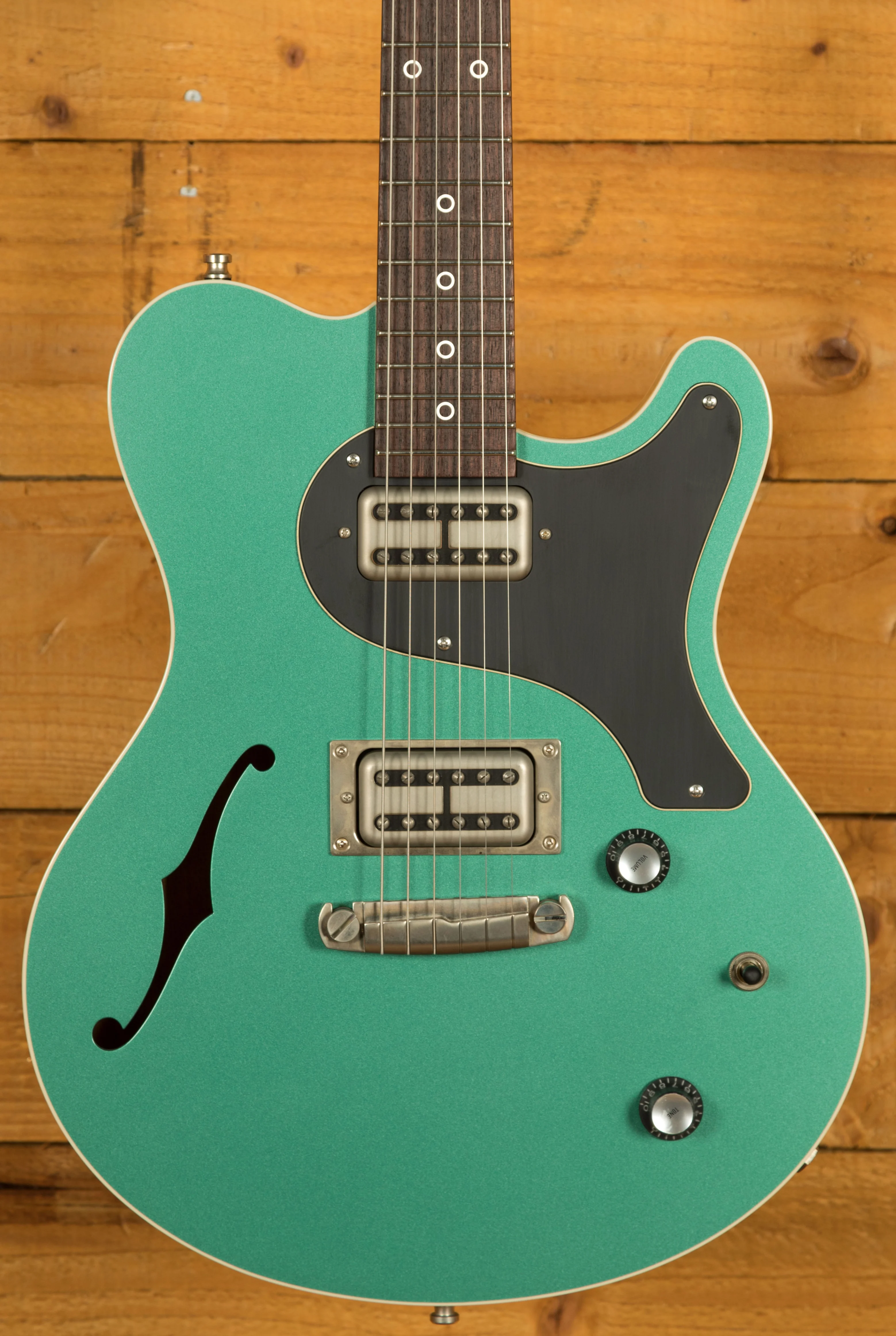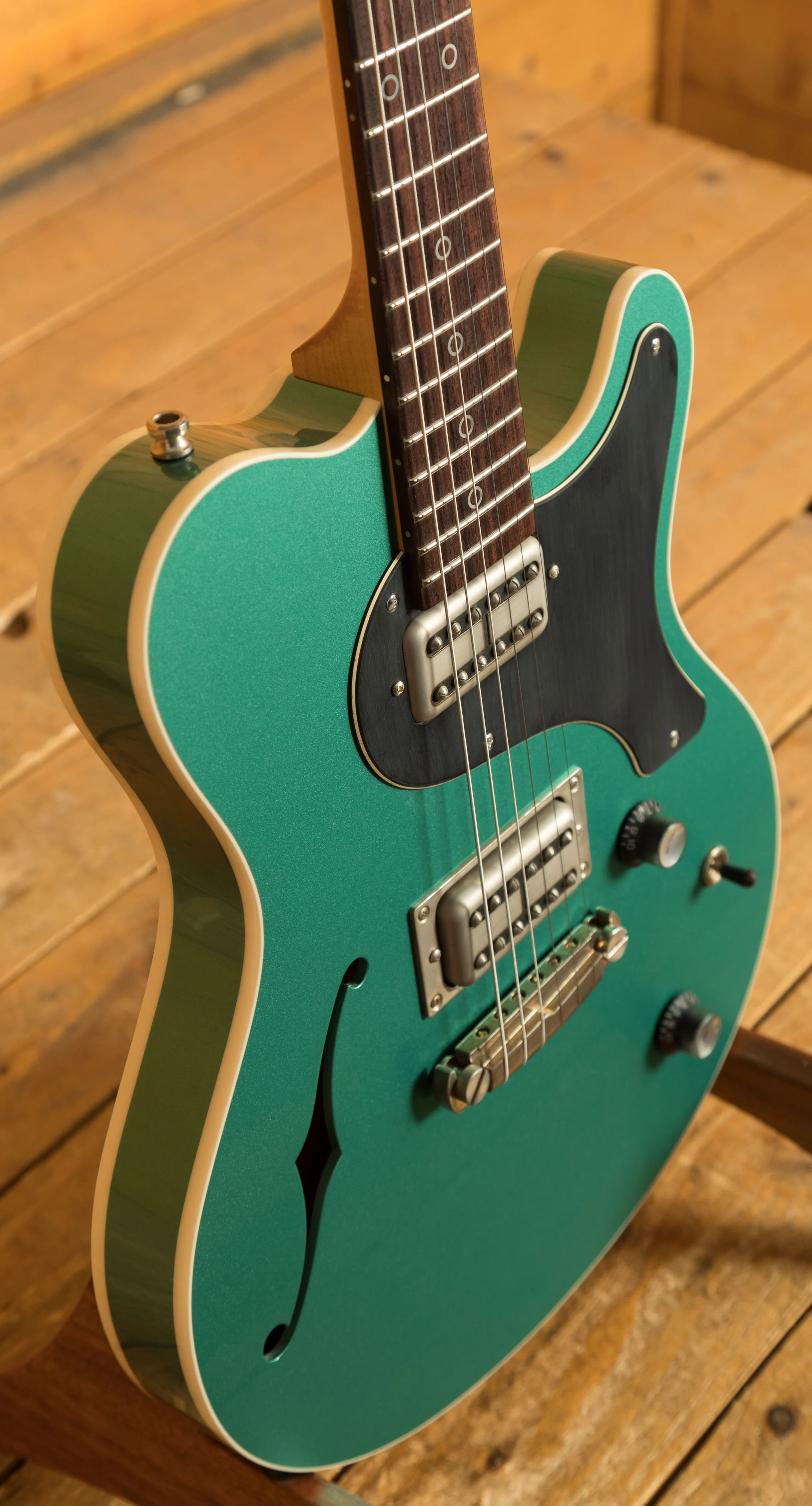 The Semi-Hollow Mahogany Body, topped with Curly/Flame Maple, brings depth and richness to its sound. The headstock is adorned with an Ebony Veneer, a subtle yet elegant detail that speaks to the guitar's meticulous craftsmanship. Moving to the neck, we find an East Indian Rosewood Fingerboard, beautifully inlaid with Sterling Silver Ring Inlays. With 22 Medium Jumbo Frets over a 25.5" Scale Length, the Surfmeister offers a versatile and comfortable playing experience. The 10"-14" Compound Radius and the Dolphin Standard Neck Profile make it effortless to navigate the fretboard, whether you're playing searing leads or gentle chords.
