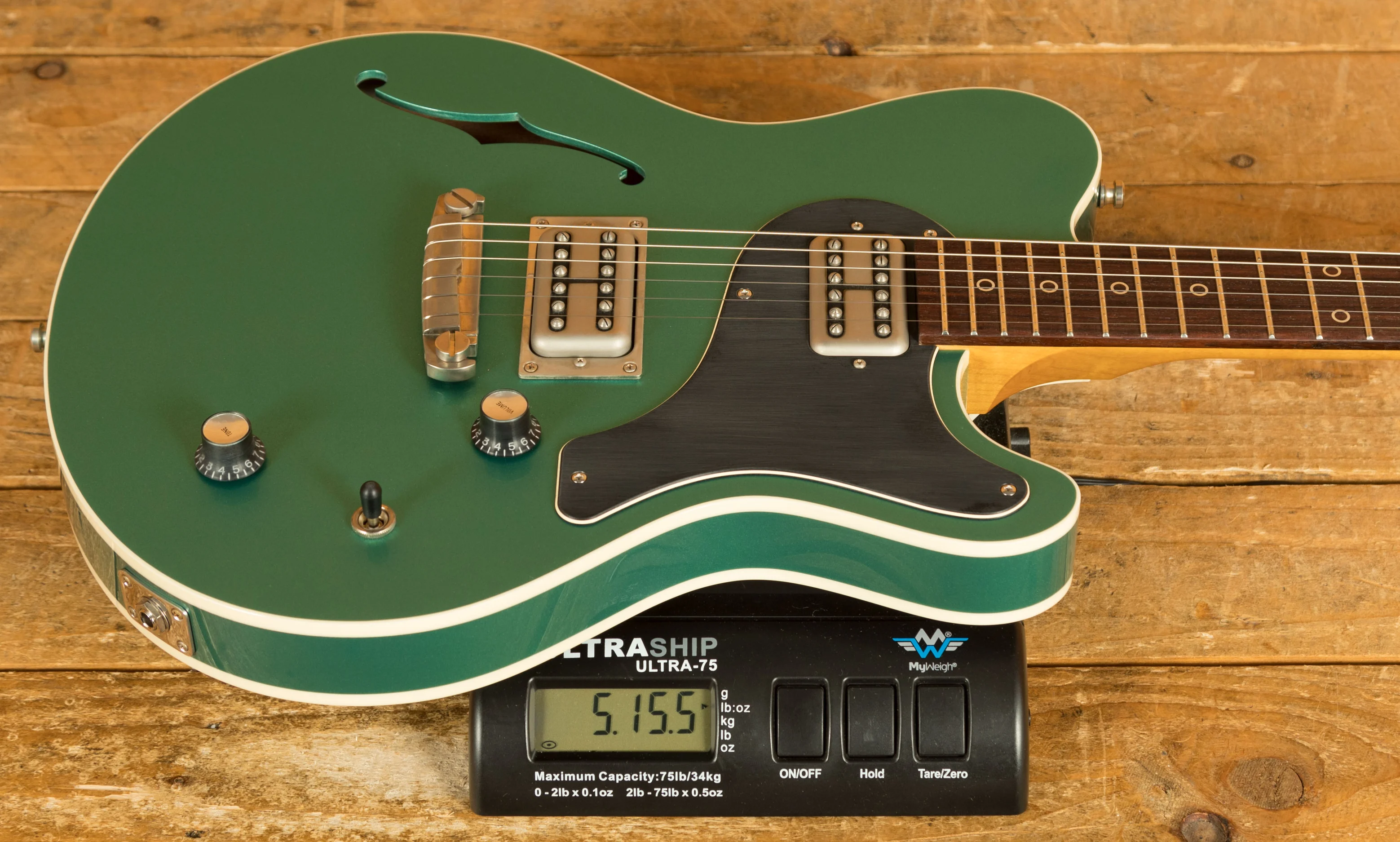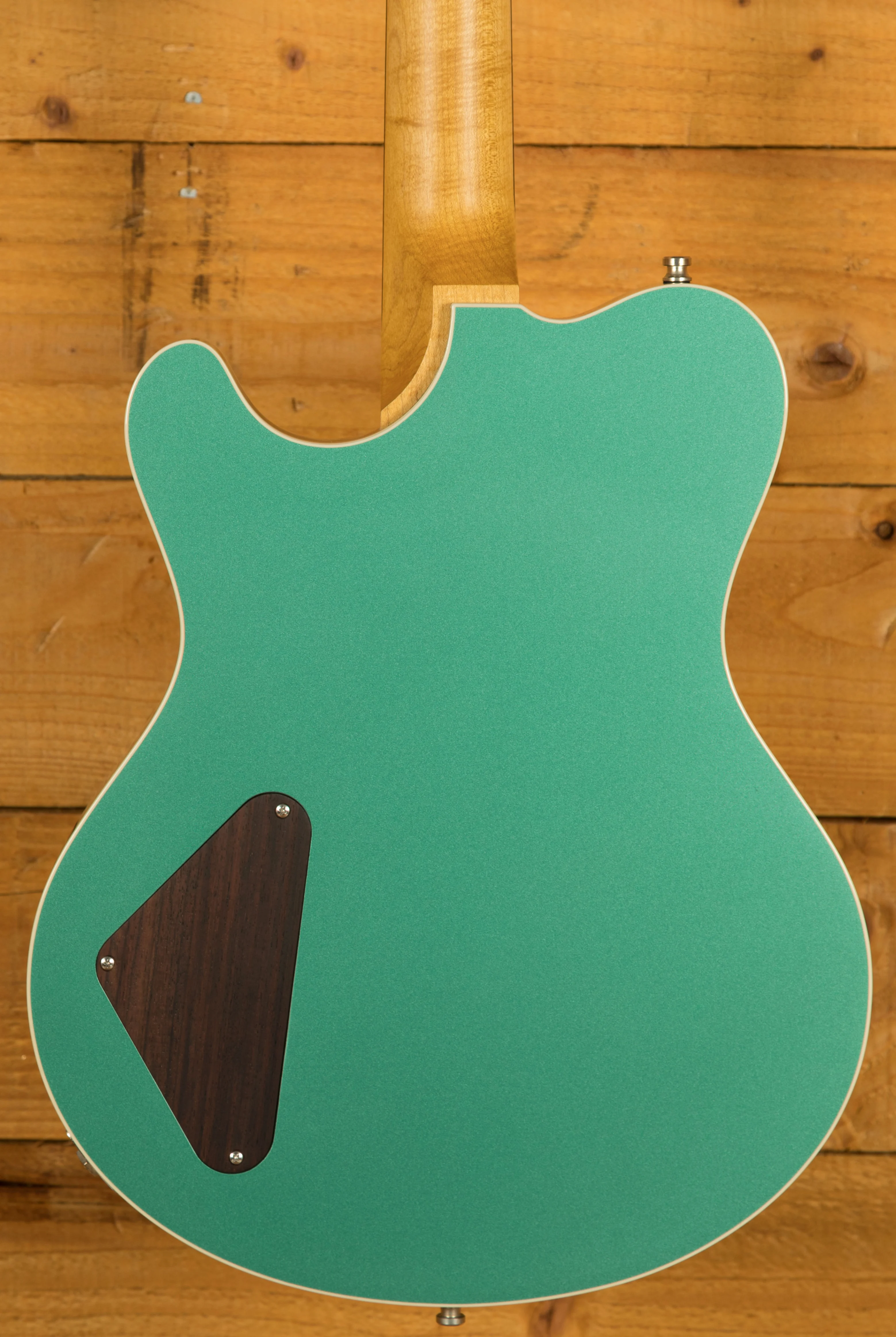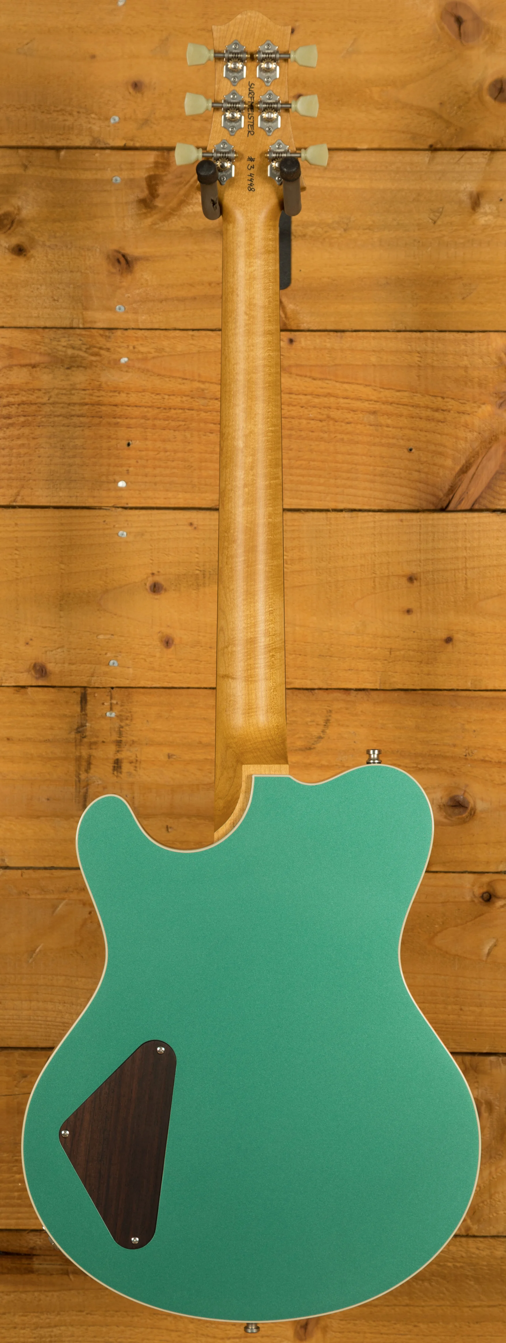 What sets this Surfmeister apart are its unique custom options. The Vintage Tinted SDF Maple Neck imparts a sense of nostalgia, while the Sherwood Green High Gloss Finish adds a dash of sophistication. The Body Top and Back Creme Binding not only provides an aesthetic touch but also contributes to the instrument's overall character.