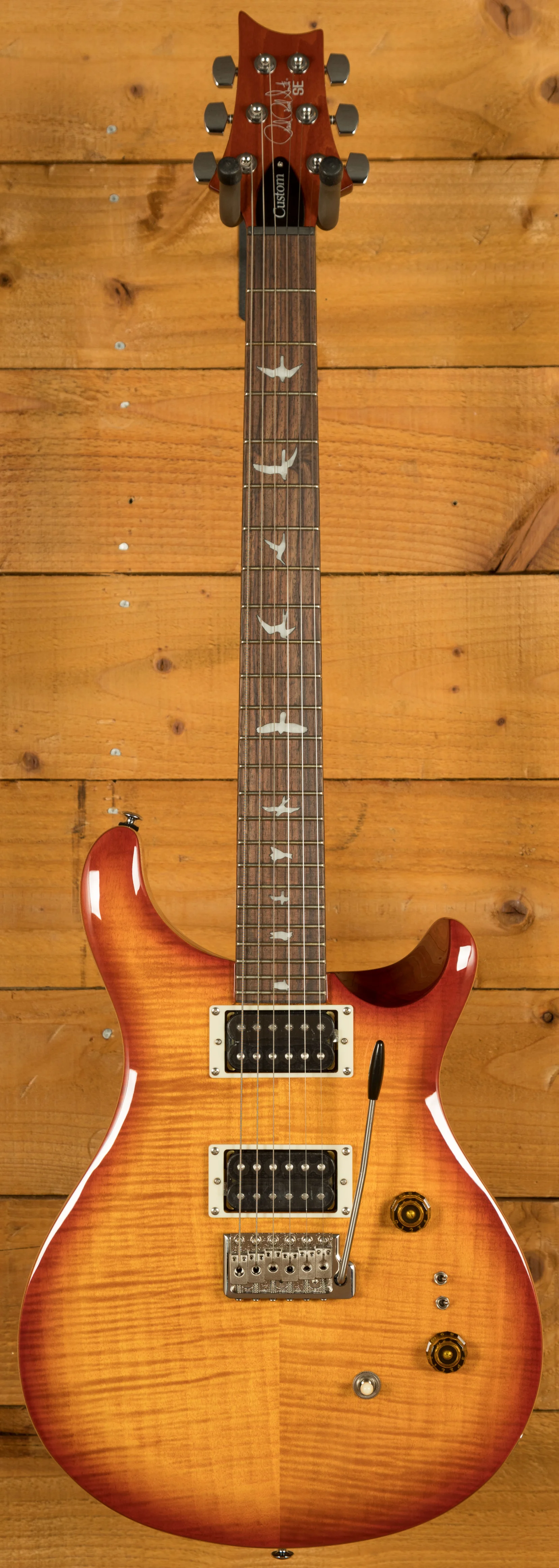 The SE Custom 24-08 retains classic design elements, including a maple top, mahogany back, rosewood fretboard, 24 frets, 25” scale length, bird inlays, signature headstock logo, and PRS patented moulded tremolo. The patented design of the tremolo system provides tonal fidelity, player comfort, and tuning stability that is second to none. You can play with confidence knowing that your tuning will remain stable no matter how much you use the tremolo arm.