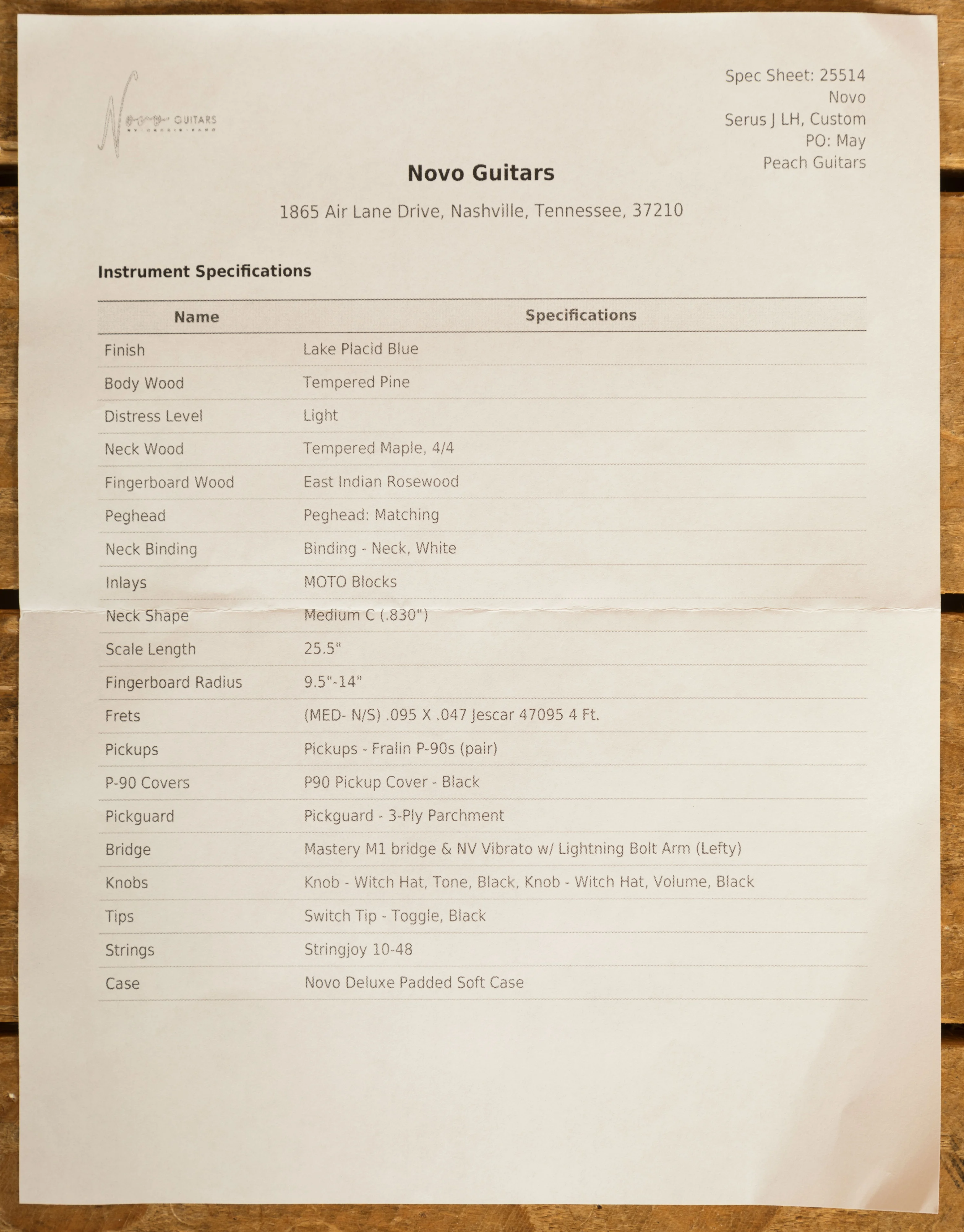 The Novo Serus J in Lake Placid Blue is a stunning showcase of boutique craftsmanship and sonic character, handbuilt in Nashville with a meticulous blend of vintage influence and modern precision. Every detail has been considered - from its tonewood selection to the finish distressing - resulting in a guitar that feels broken-in from day one, but shines like a showpiece.