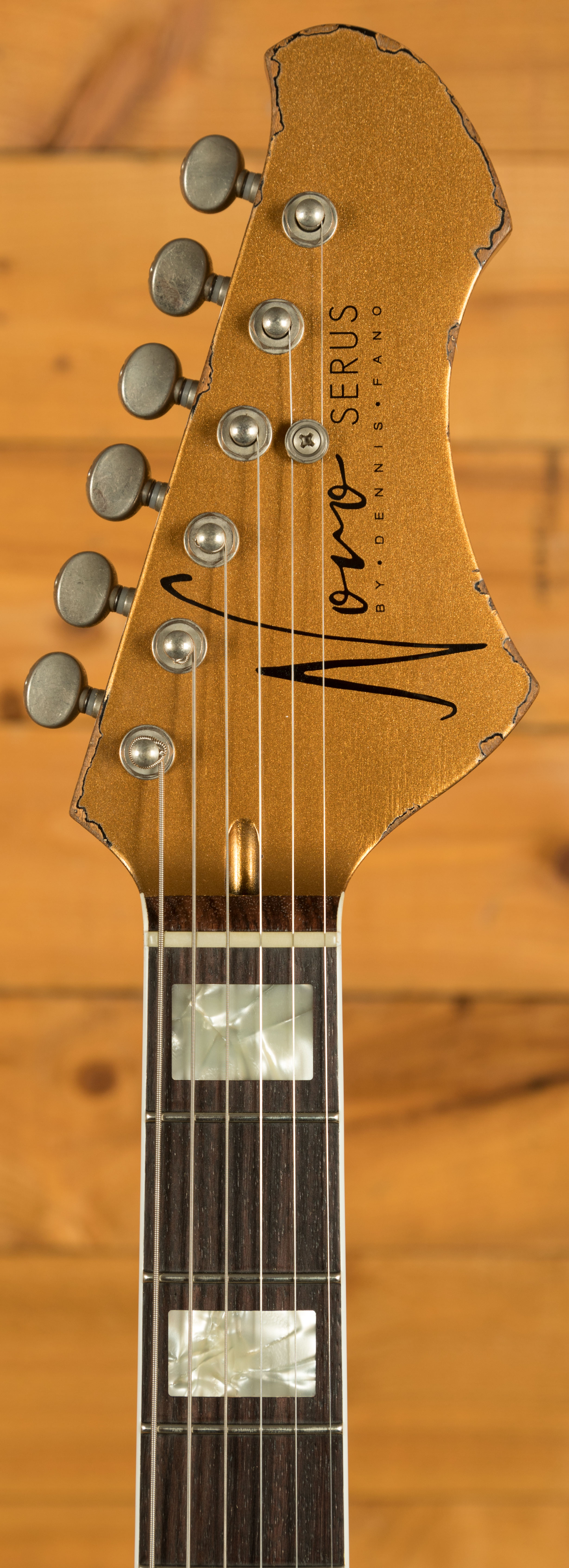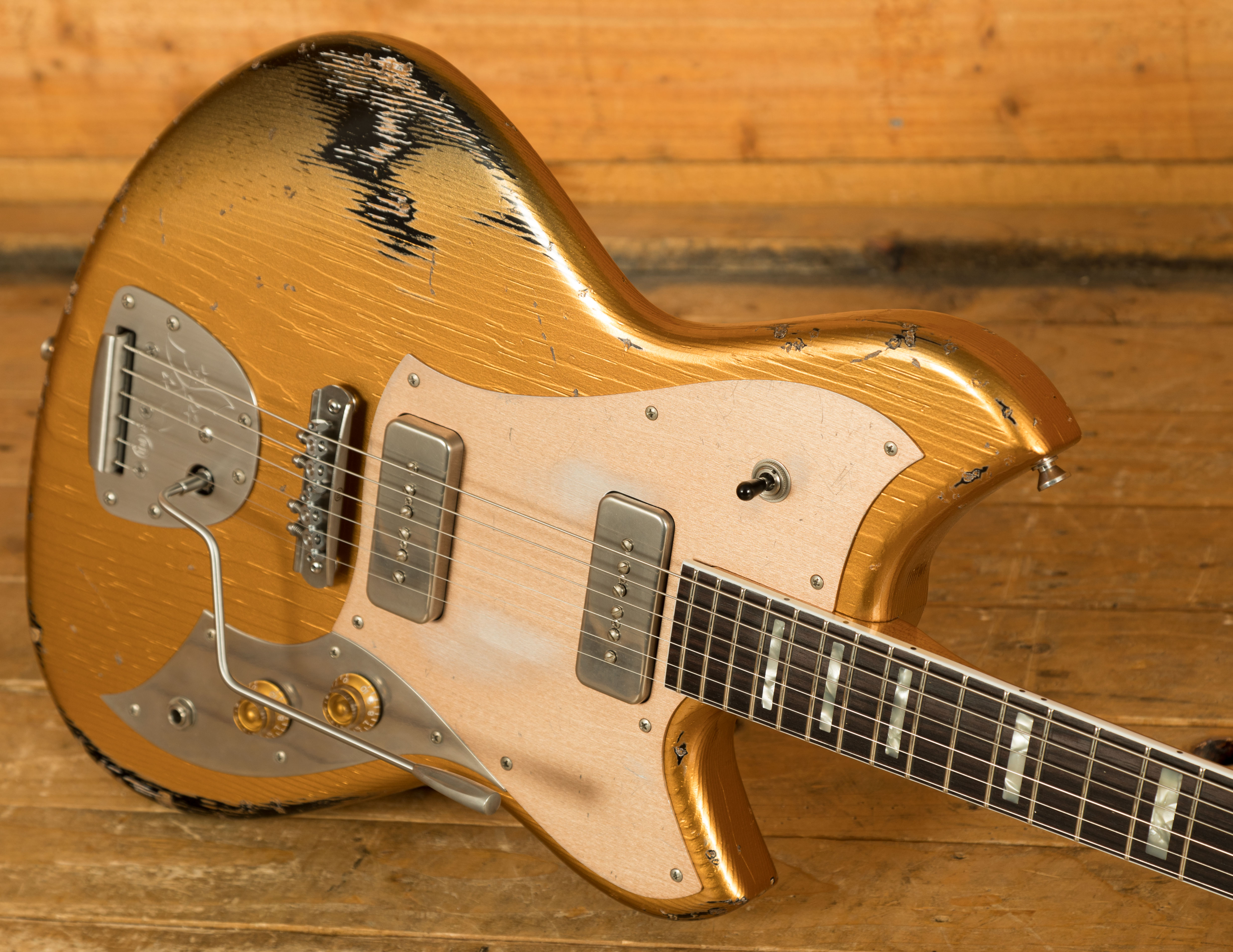 Visually, Aztec gold over Bull Black finish with medium distressing and MOTO block inlays lend classic elegance with attitude. The Mastery M1 bridge and NV vibrato system with Lightning Bolt arm provide fluid pitch control and rock-solid stability, making this a truly performance-grade instrument.