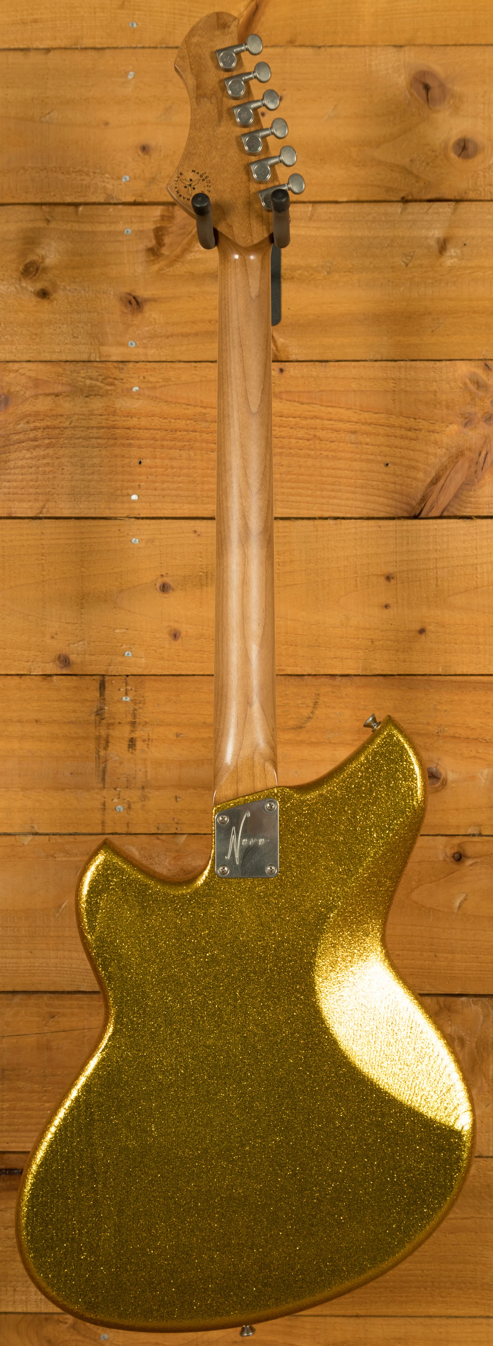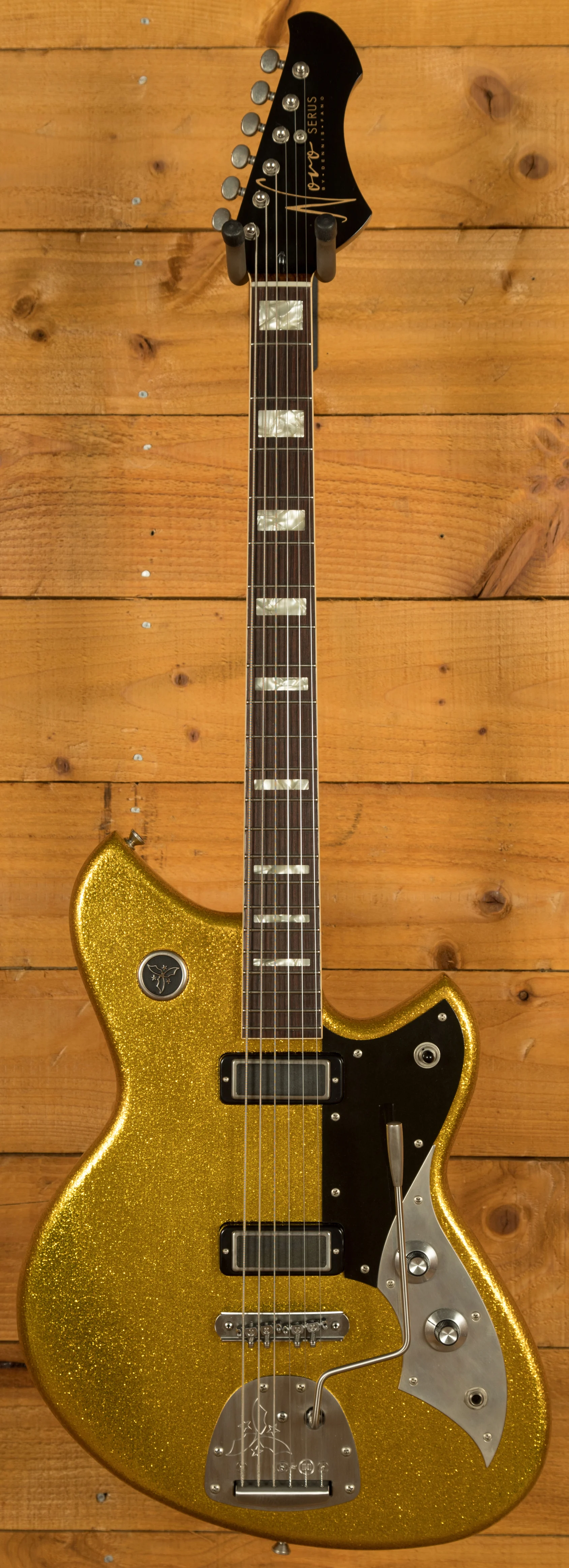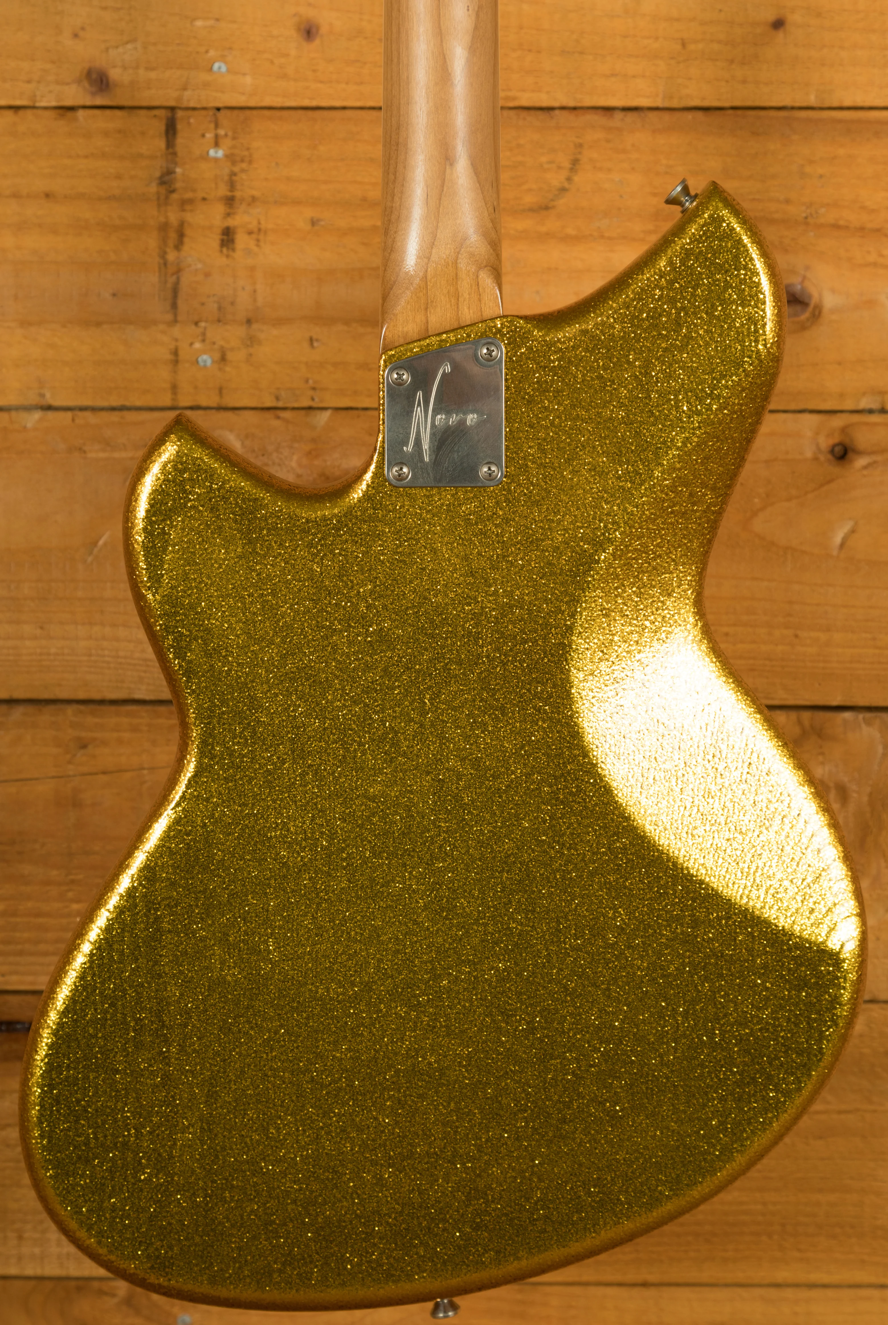 The Novo Serus J Baritone is a custom-built offset designed for players who want extended-range depth without sacrificing Novo's signature feel, resonance and personality. Finished in an amazing Your Gold Dress Sparkle with an extra light distress level and a Bull Black peghead, it has a bold, boutique aesthetic that stands out immediately. Cream neck binding and MOTO block inlays add a refined, vintage-inspired touch that complements the shimmering finish beautifully.