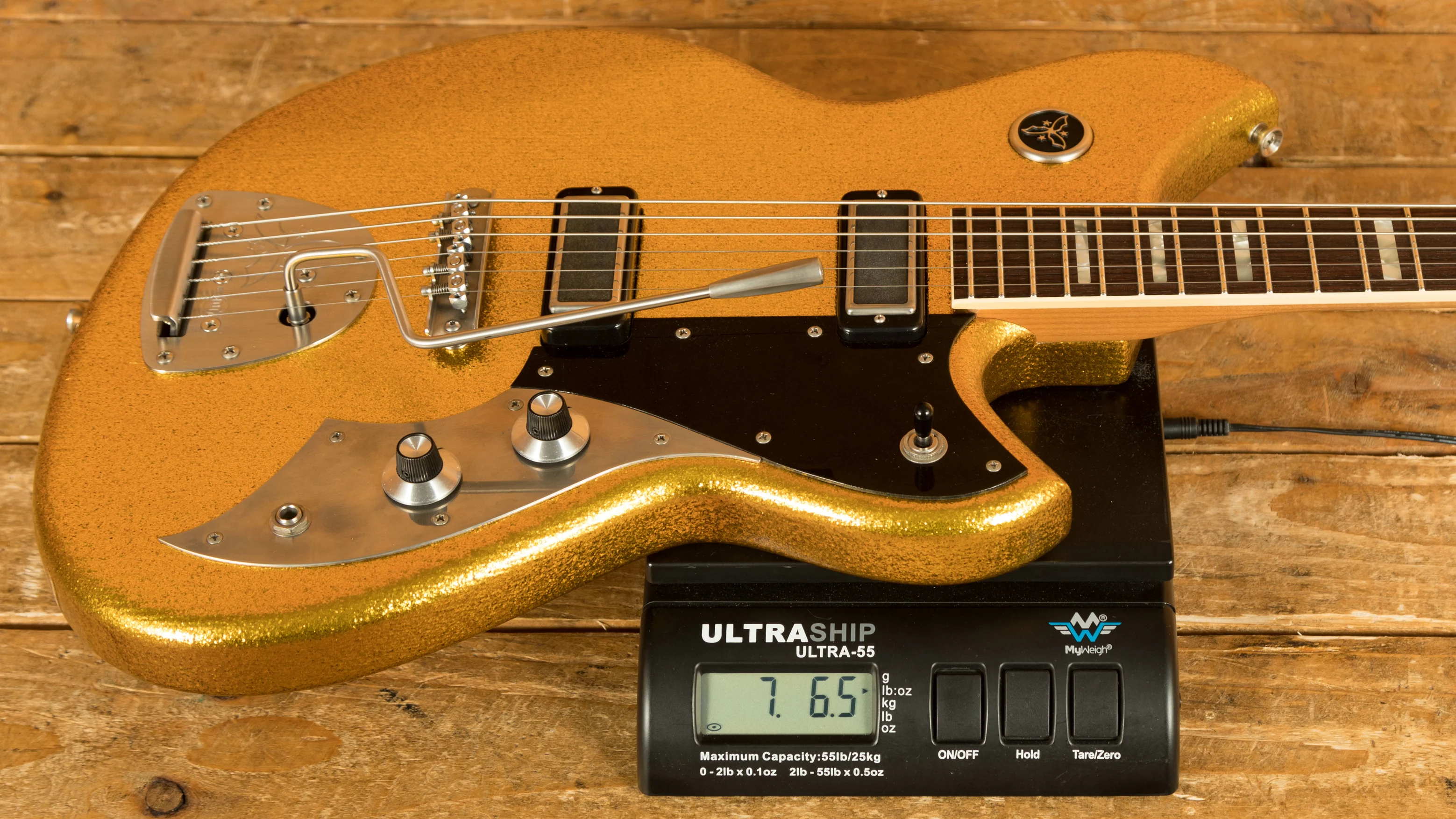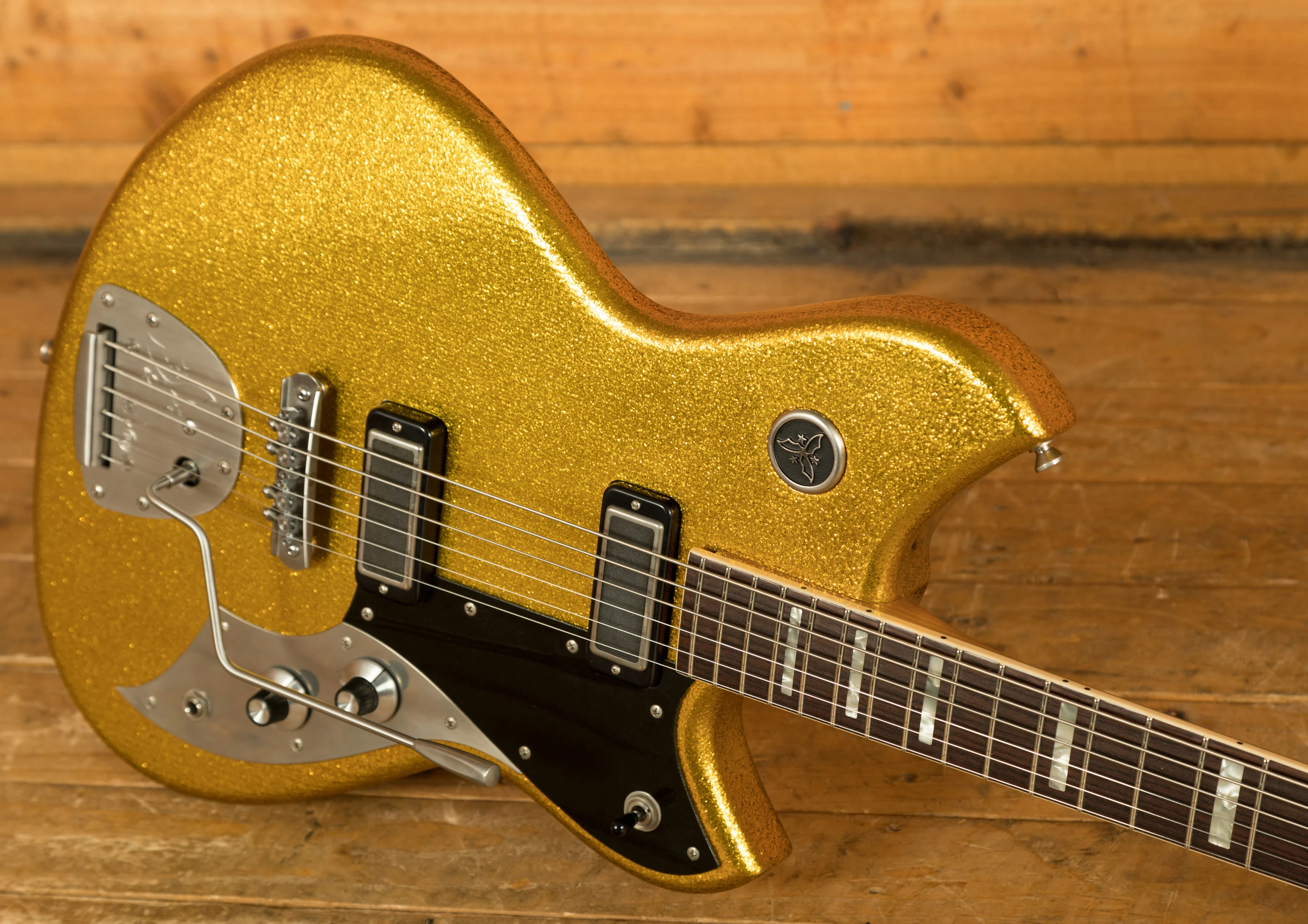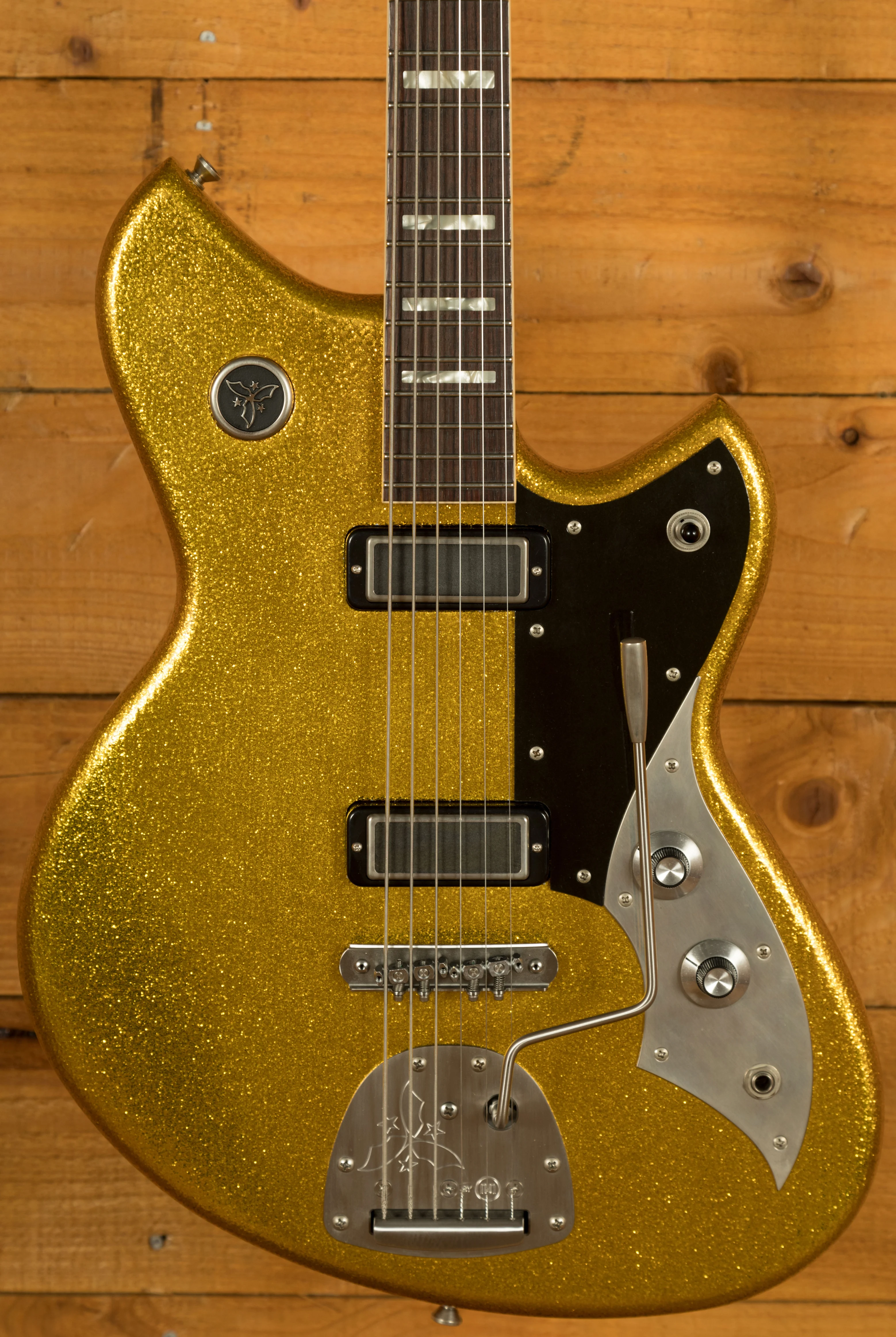 The Novo Serus J Baritone is a custom-built offset designed for players who want extended-range depth without sacrificing Novo's signature feel, resonance and personality. Finished in an amazing Your Gold Dress Sparkle with an extra light distress level and a Bull Black peghead, it has a bold, boutique aesthetic that stands out immediately. Cream neck binding and MOTO block inlays add a refined, vintage-inspired touch that complements the shimmering finish beautifully.