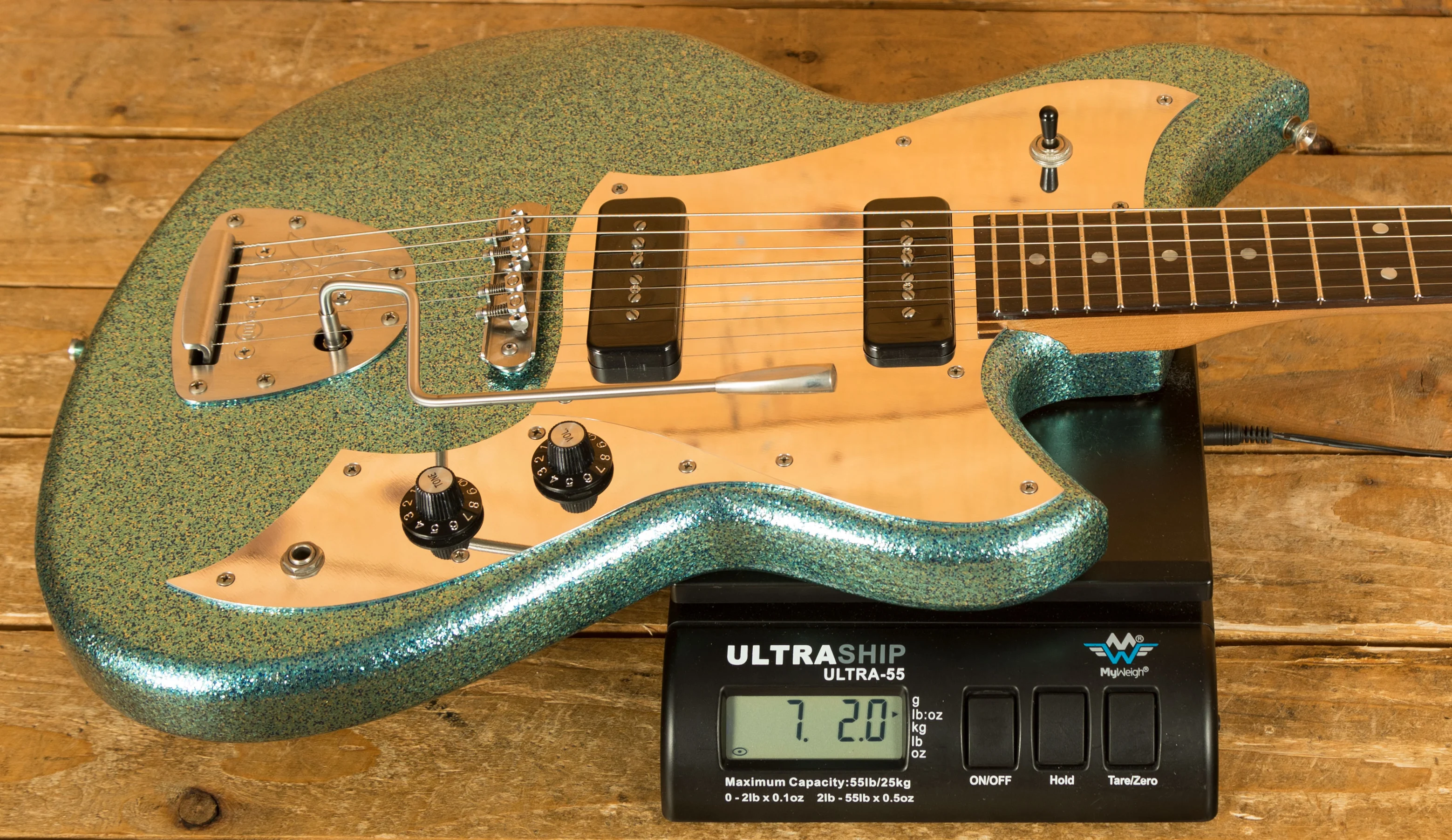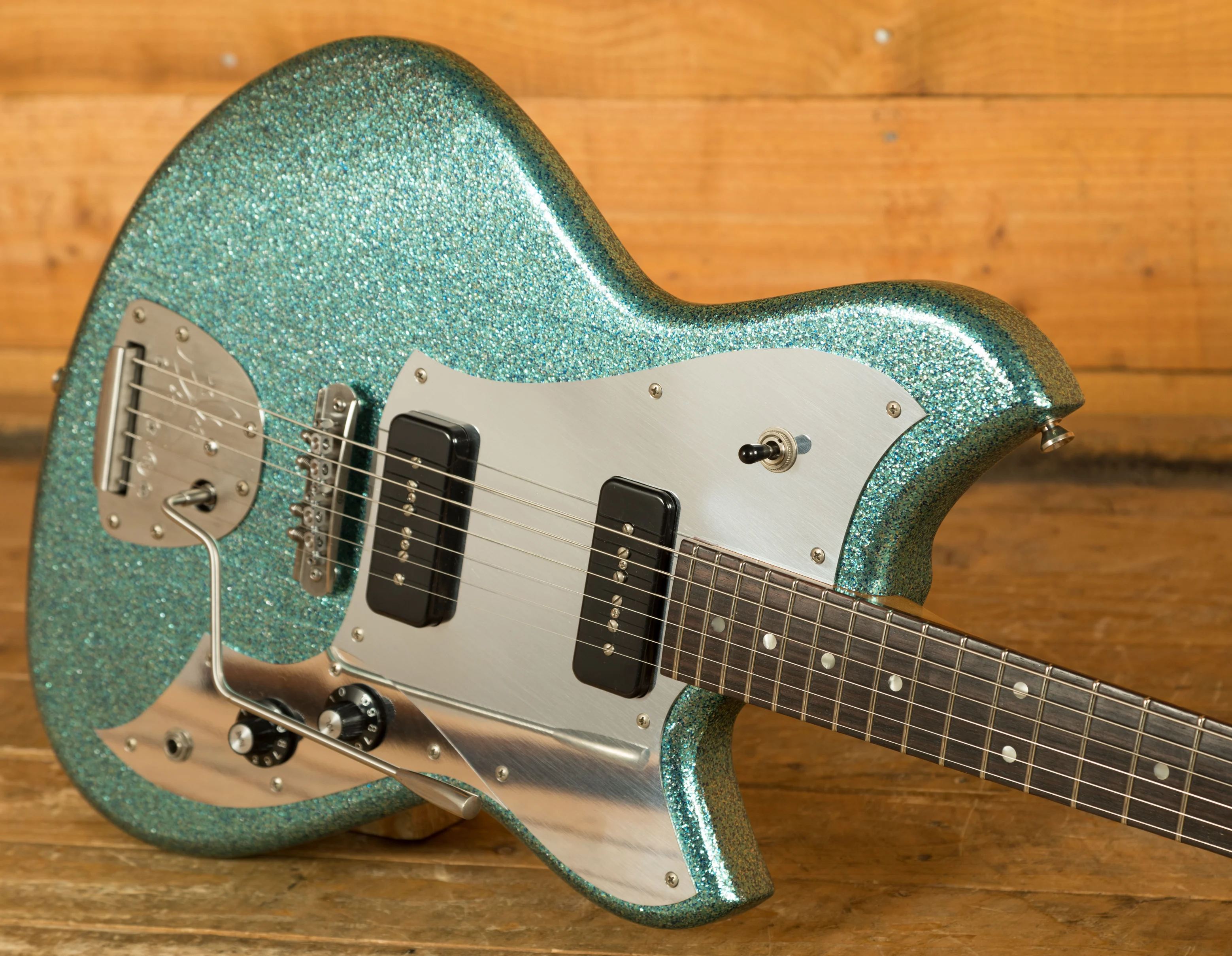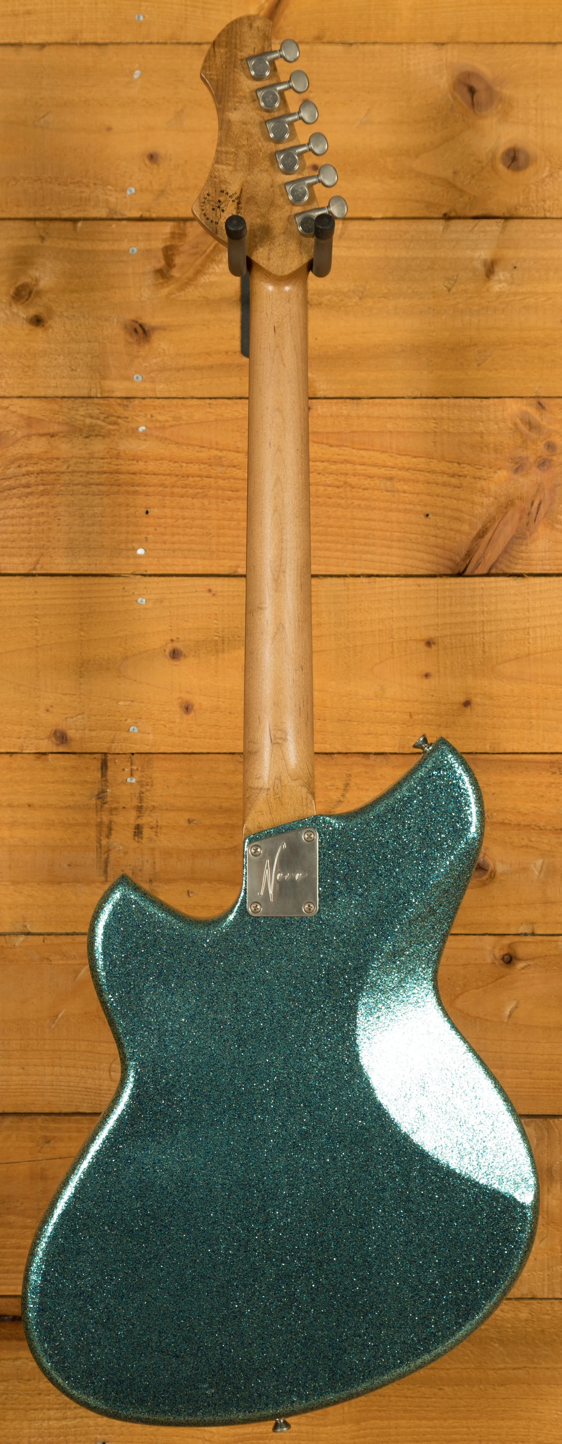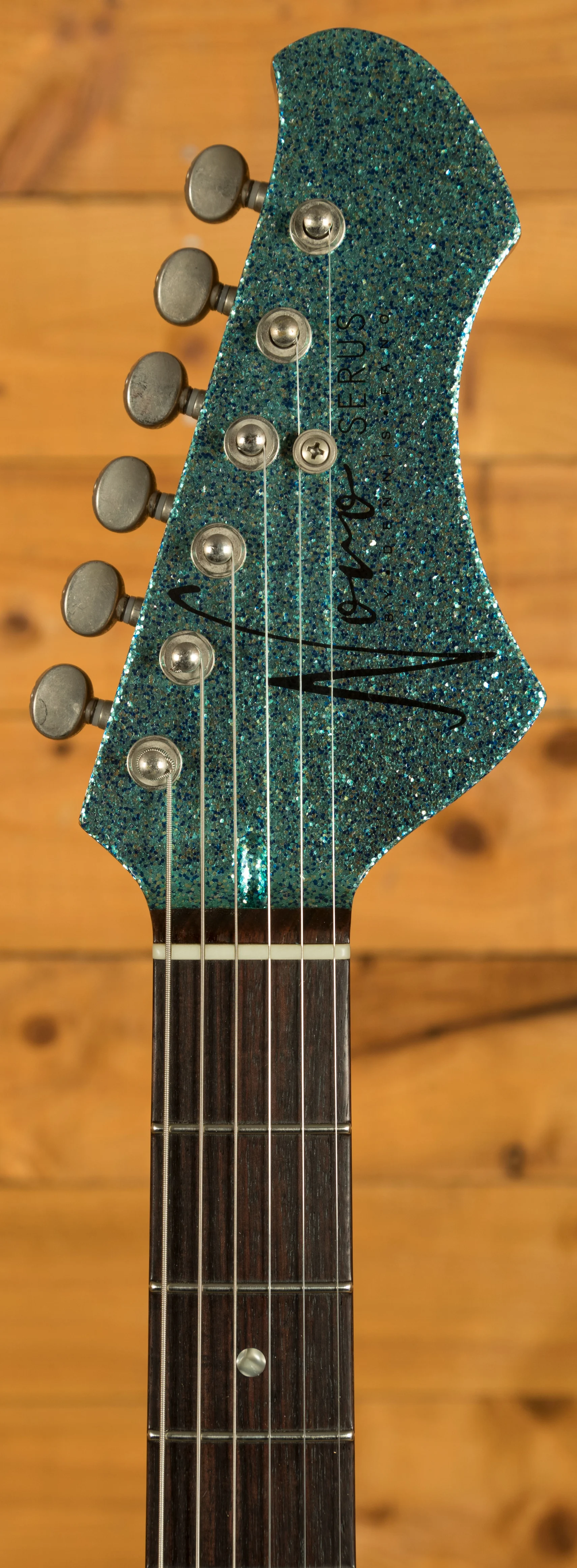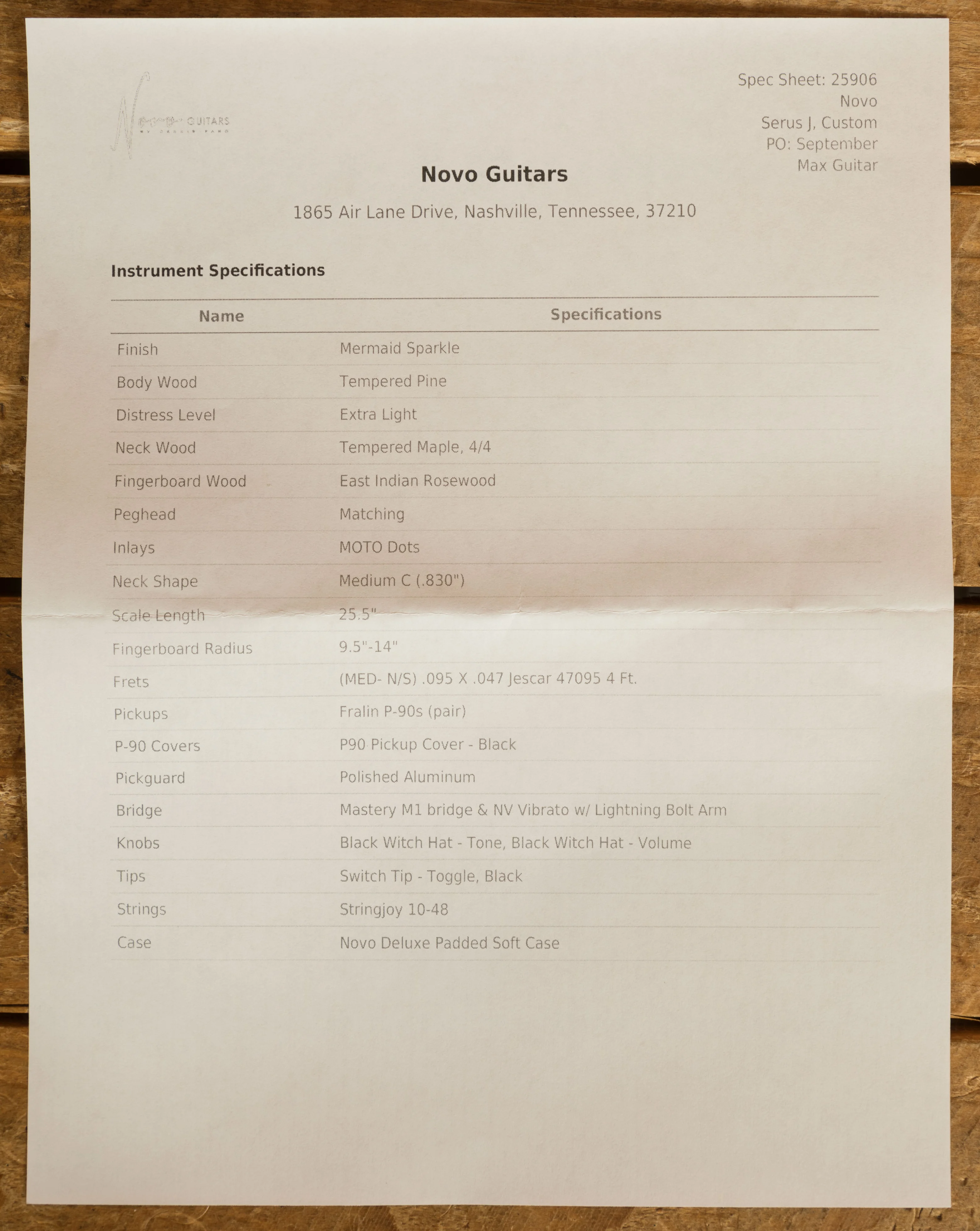 The Novo Serus J in Merman Sparkle is a stunning showcase of boutique craftsmanship and sonic character, handbuilt in Nashville with a meticulous blend of vintage influence and modern precision. Every detail has been considered - from its tonewood selection to the finish distressing - resulting in a guitar that feels broken-in from day one, but shines like a showpiece.