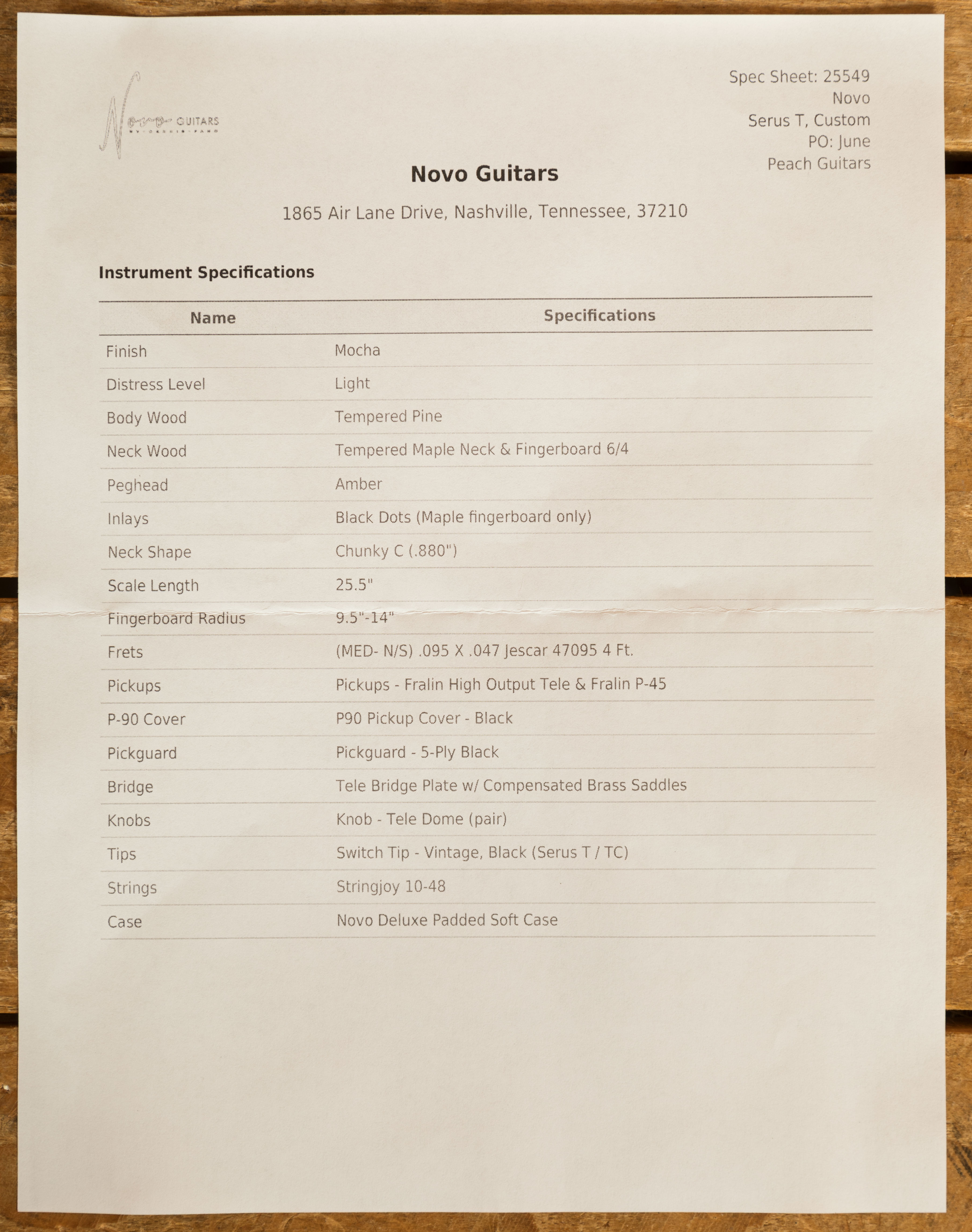 The Novo Serus T in Mocha is a stunning showcase of boutique craftsmanship and sonic character, handbuilt in Nashville with a meticulous blend of vintage influence and modern precision. Every detail has been considered - from its tonewood selection to the finish distressing - resulting in a guitar that feels broken-in from day one, but shines like a showpiece.