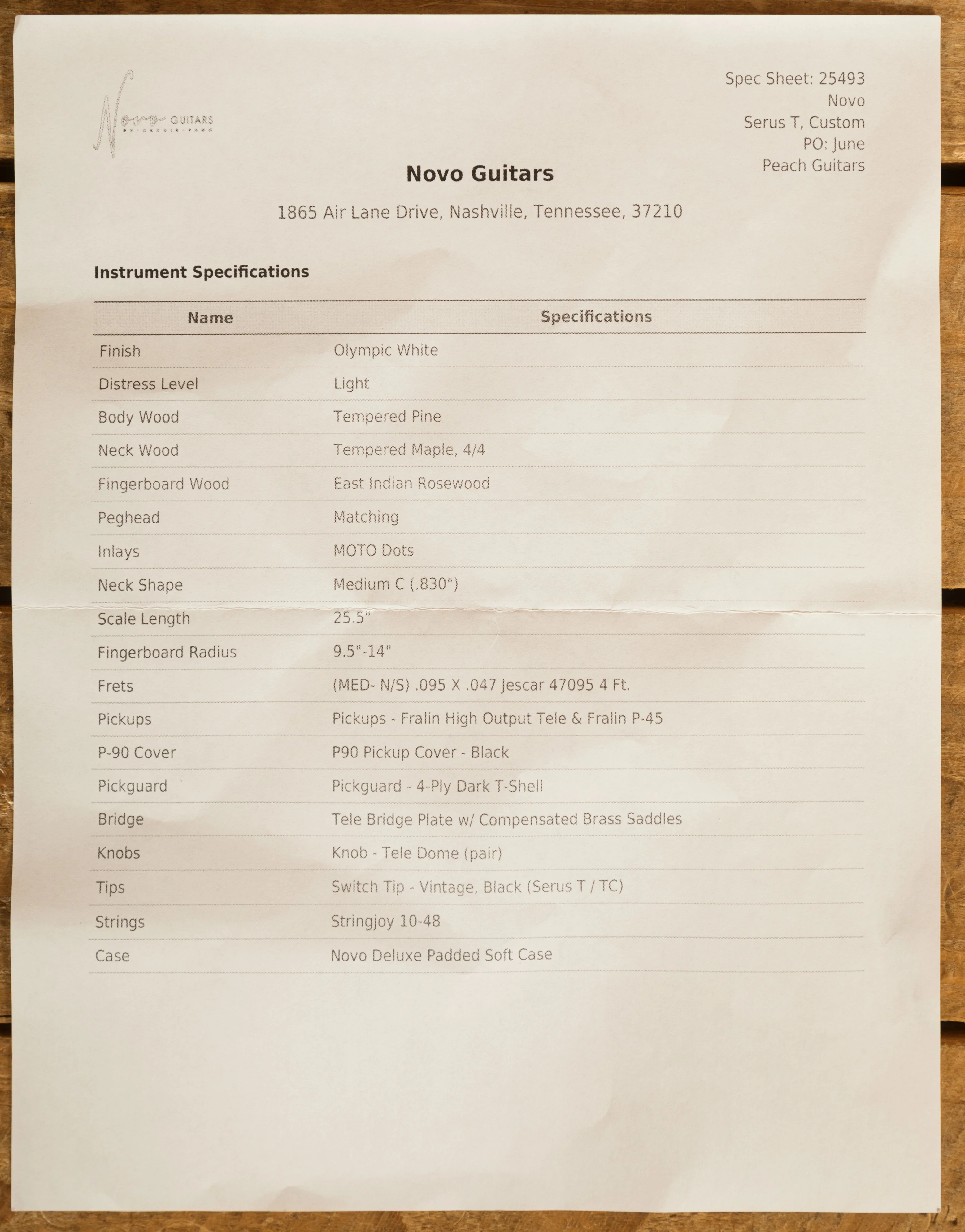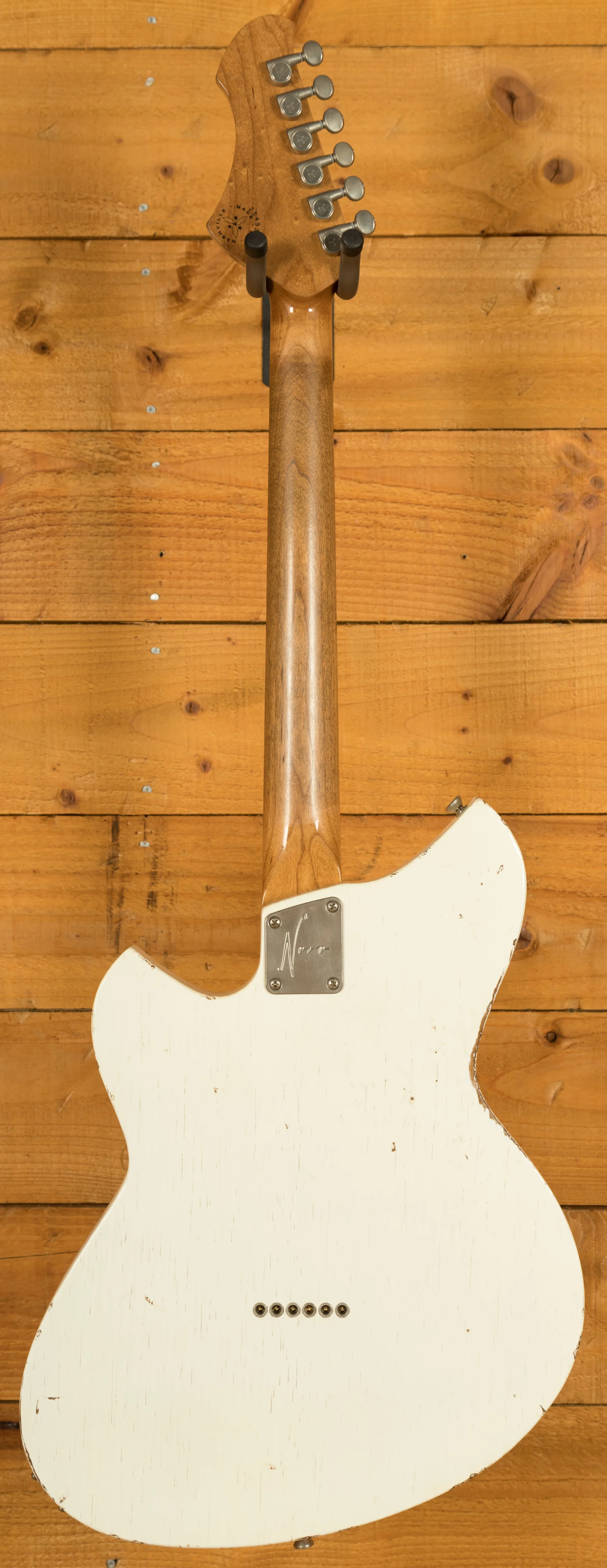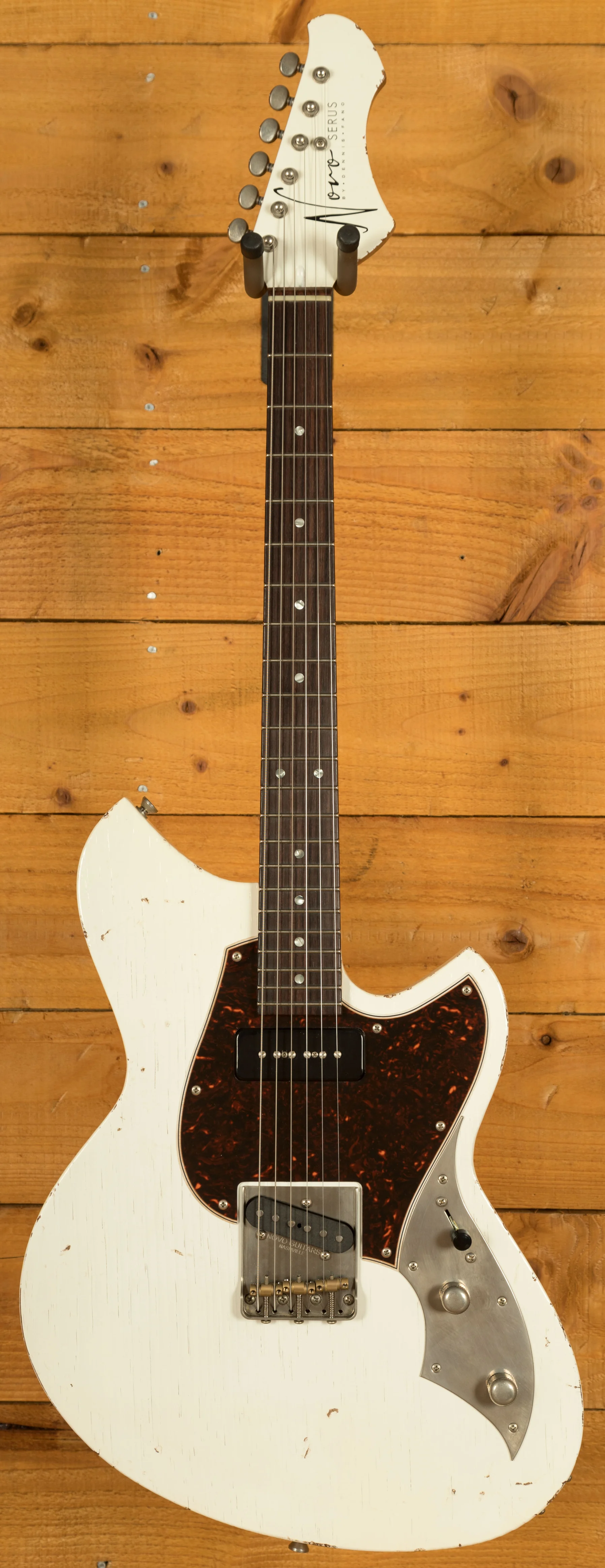 The Novo Serus T in Olympic White is a stunning showcase of boutique craftsmanship and sonic character, handbuilt in Nashville with a meticulous blend of vintage influence and modern precision. Every detail has been considered - from its tonewood selection to the finish distressing - resulting in a guitar that feels broken-in from day one, but shines like a showpiece.