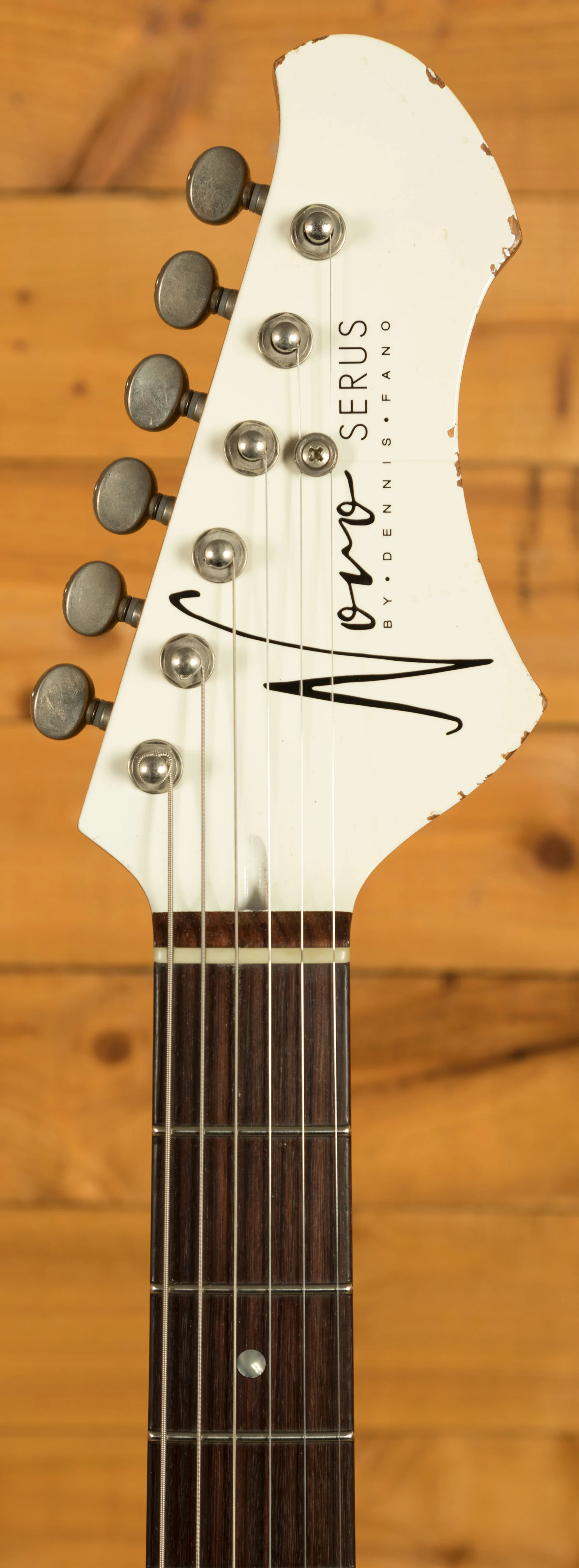 Visually, the Olympic White finish with light distressing, matching peghead, and MOTO dot inlays lend classic elegance with attitude. The bridge of the Serus T is a Tele bridge with compensated brass saddles, ensuring precise intonation and optimal sustain.