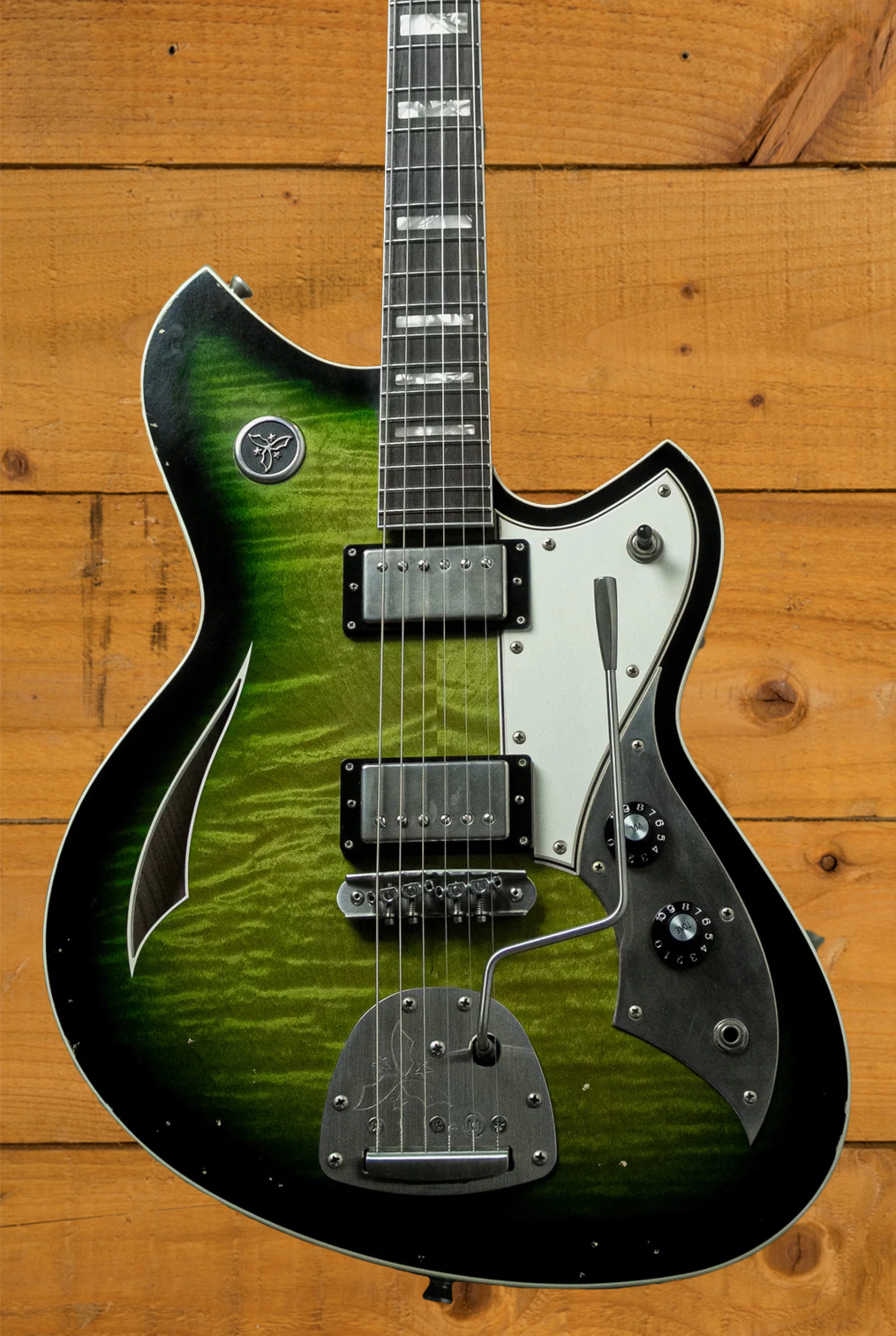 This guitar is loaded with a pair of Lollar Imperial humbuckers, which are some of the finest high end pickups you can buy. Its their take on the classic P.A.F. pickup, so if you love those classic 50s & 60s humbucker tones, you’re going to love these. It also features a Mastery M1 bridge & NV Vibrato, and a set of Novo 18:1 Non Locking tuners.