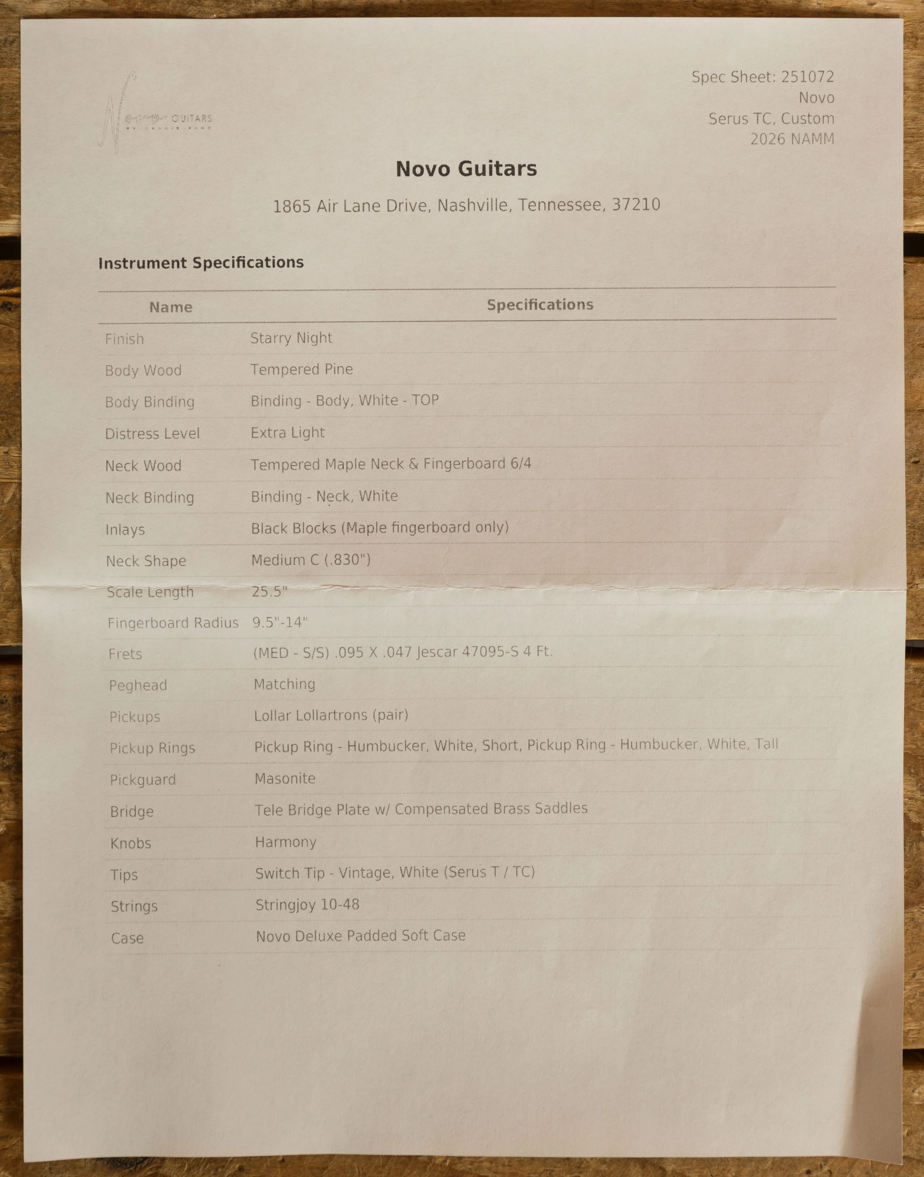 This seriously cool instrument was built for and displayed at the 2026 NAMM show in Anaheim, California. Back in early January 2026, we were given a sneak peak at some of Novo’s NAMM display guitars as they were going through their final quality control process before shipping of to California. This stunning Serus TC in Starry Night was one of the many awesome instruments that caught our eye. We are thrilled to have secured this awesome and historic NAMM build.