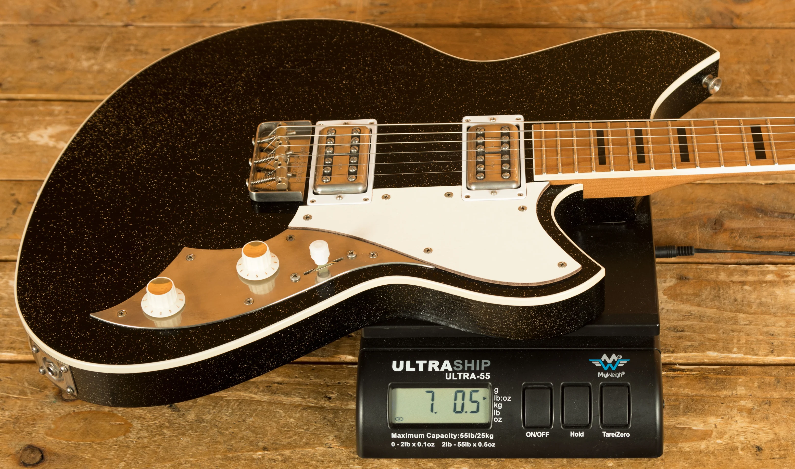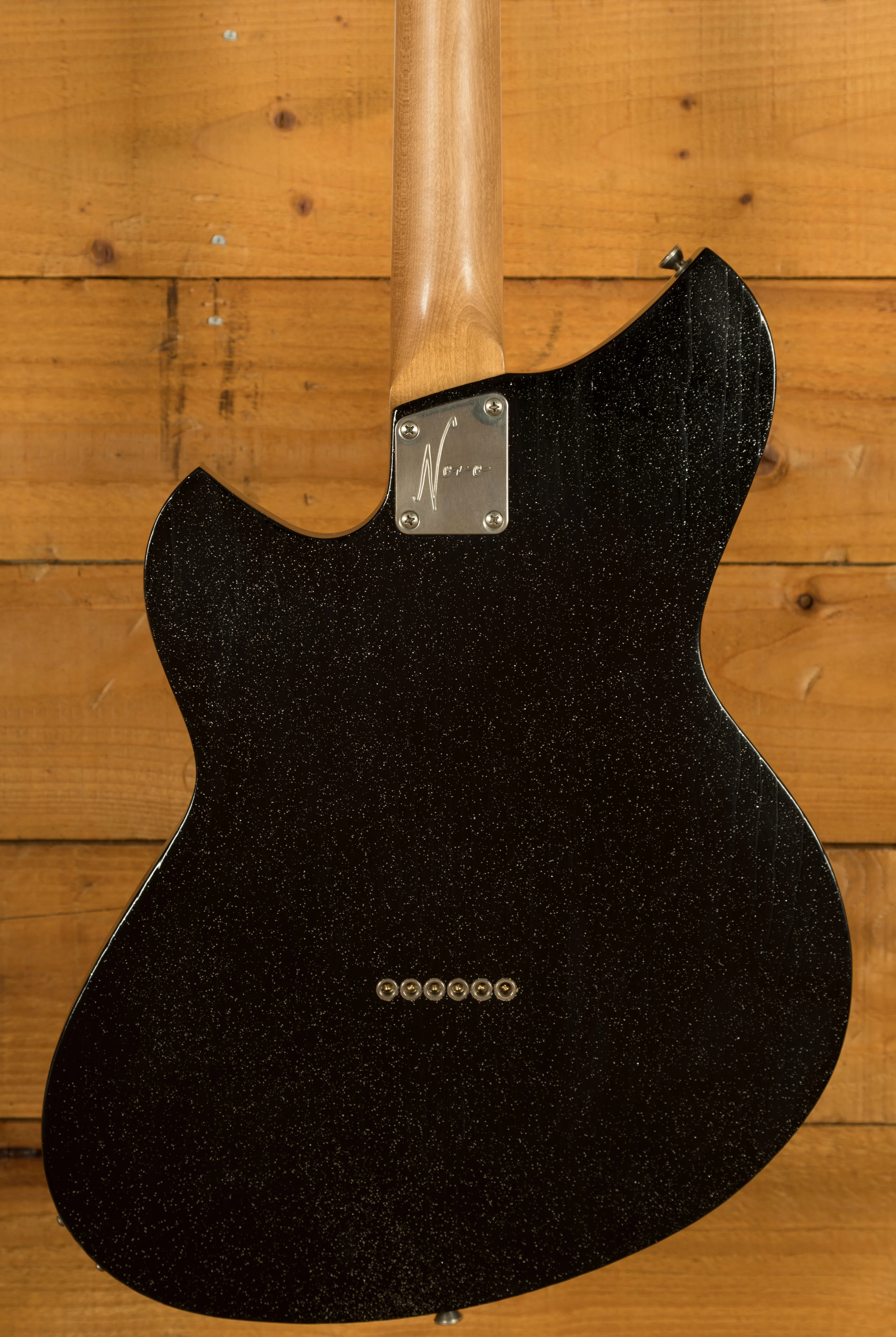 This Serus TC features Novo’s trademark Tempered Pine body, which makes it lightweight, super resonant, and tonally rich! The full body Starry Night finish just looks incredible. The dark base colour contrasts beautifully with the light sparkle flakes within the finish. They’ve got the colour name spot on with this one, it really does look like a dark night sky filled with bright stars. Novo’s are also known for the awesome wood grain which shows through in their finishes, and that is very much a part of this model as well. The body also features white top binding, and an extra light distressed finish, which further add to the premium look and feel.