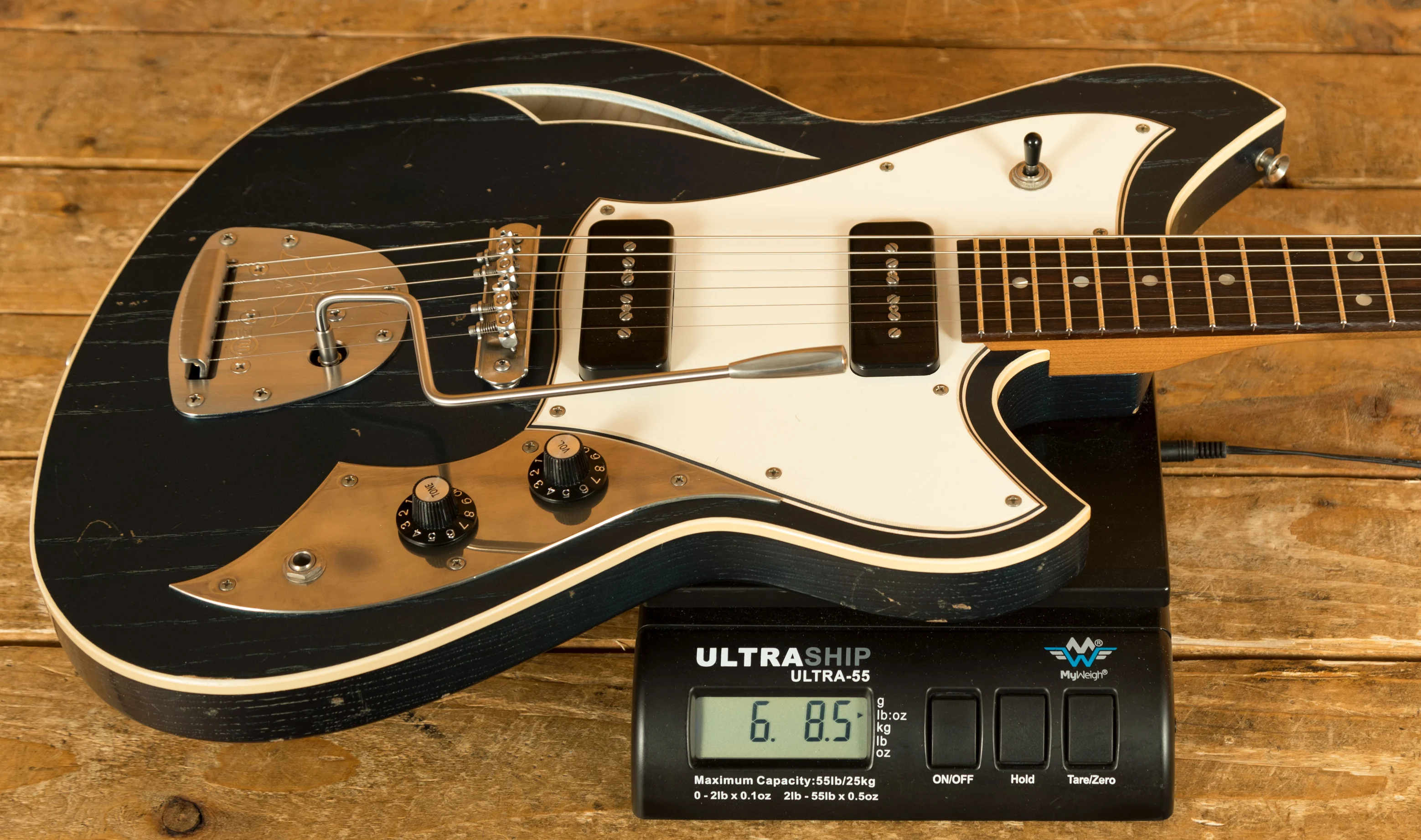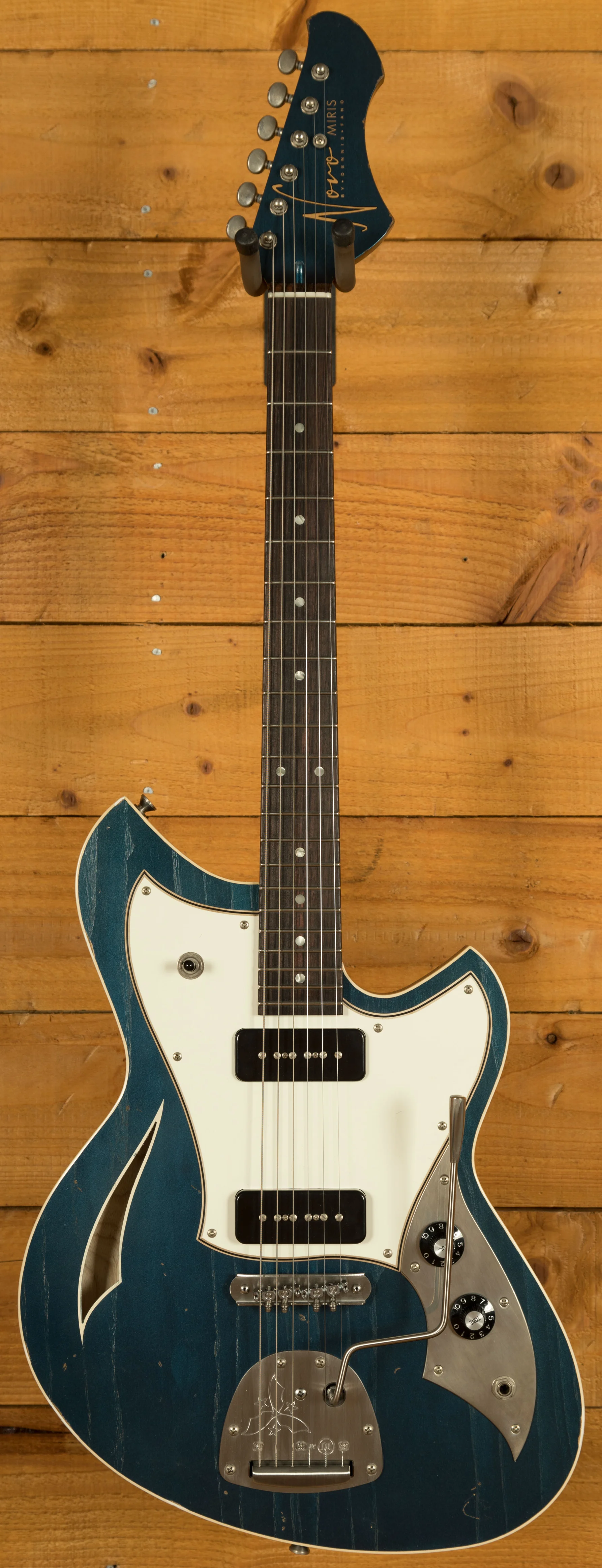 Previously available only as a custom-made model, the Miris J is the only semi-hollow model in the Nucleus range. The guitar incorporates a redesigned sound hole, departing from the traditional S-hole design, and features a new pickguard and control plate style.
