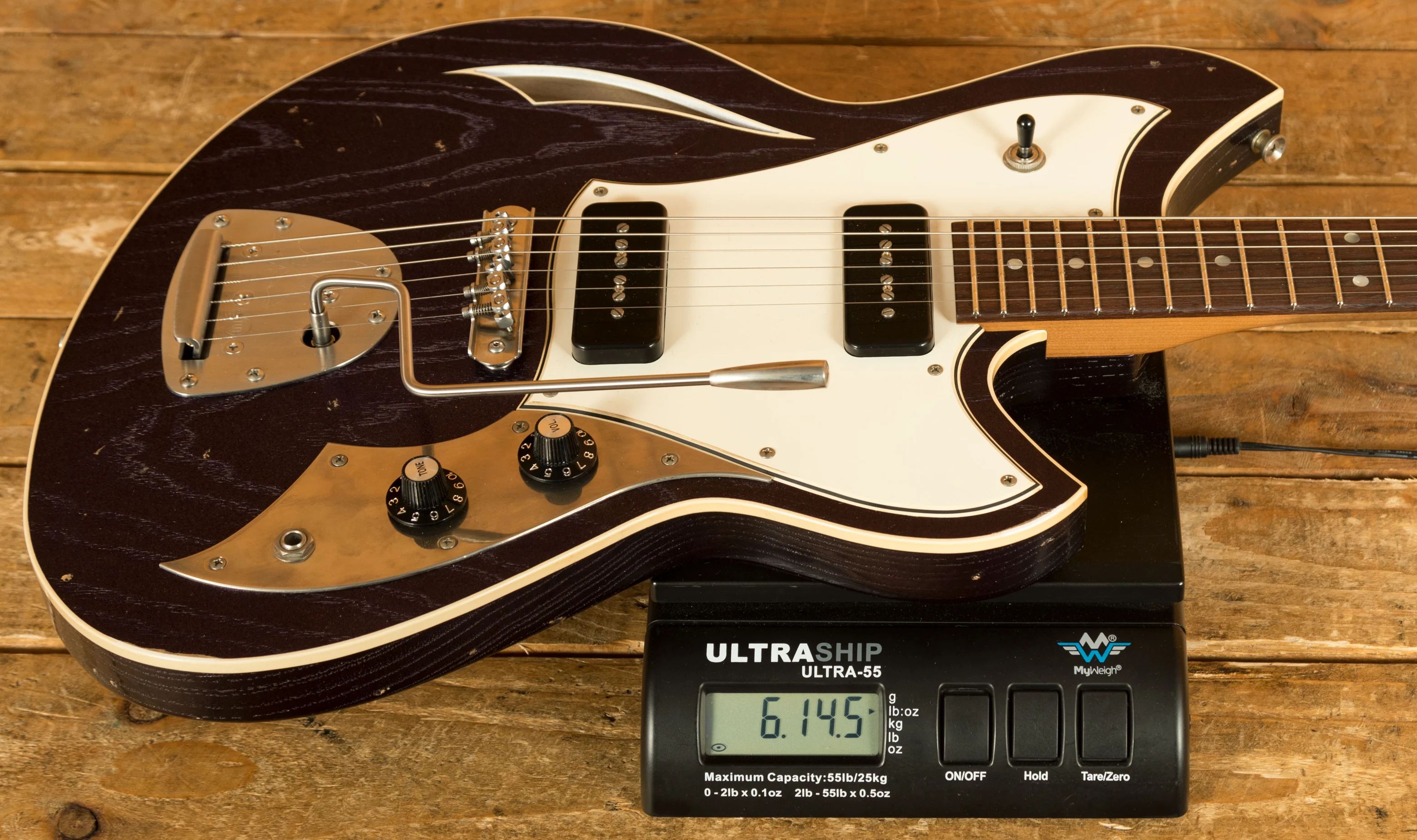 Previously available only as a custom-made model, the Miris J is the only semi-hollow model in the Nucleus range. The guitar incorporates a redesigned sound hole, departing from the traditional S-hole design, and features a new pickguard and control plate style.