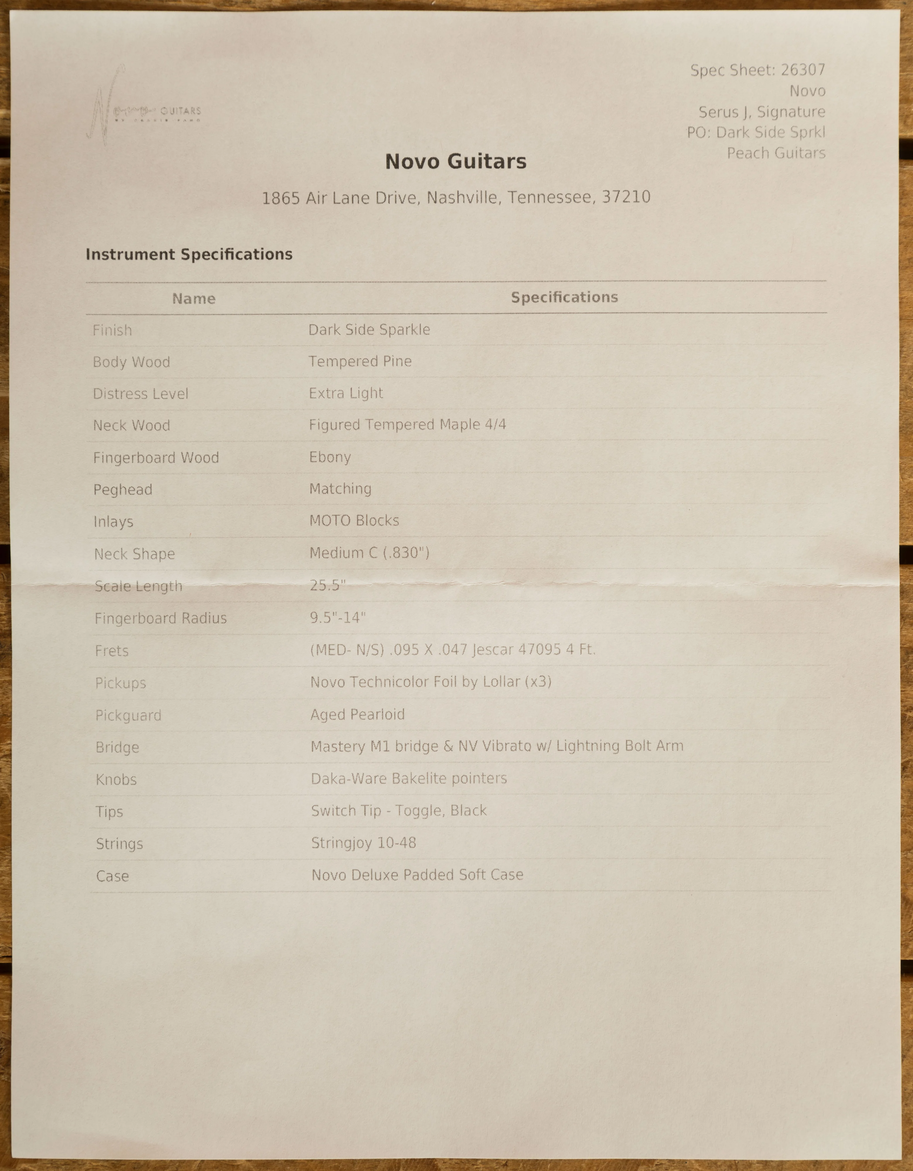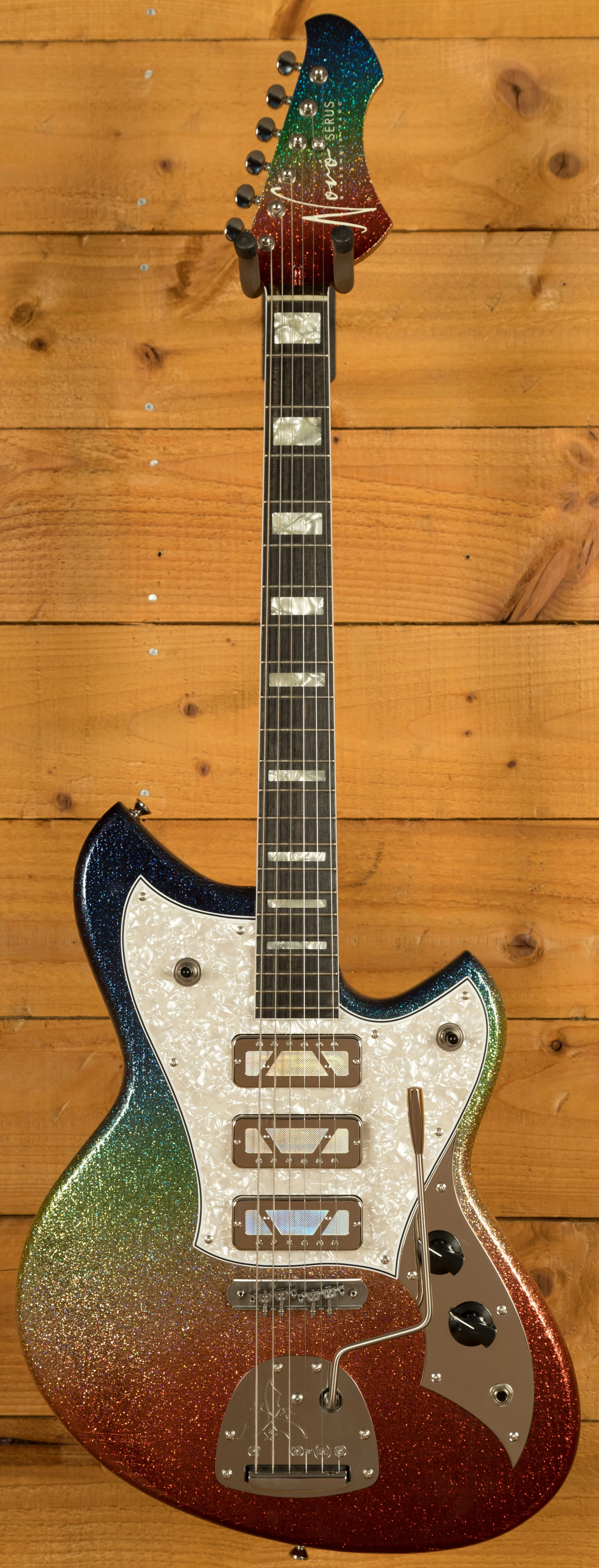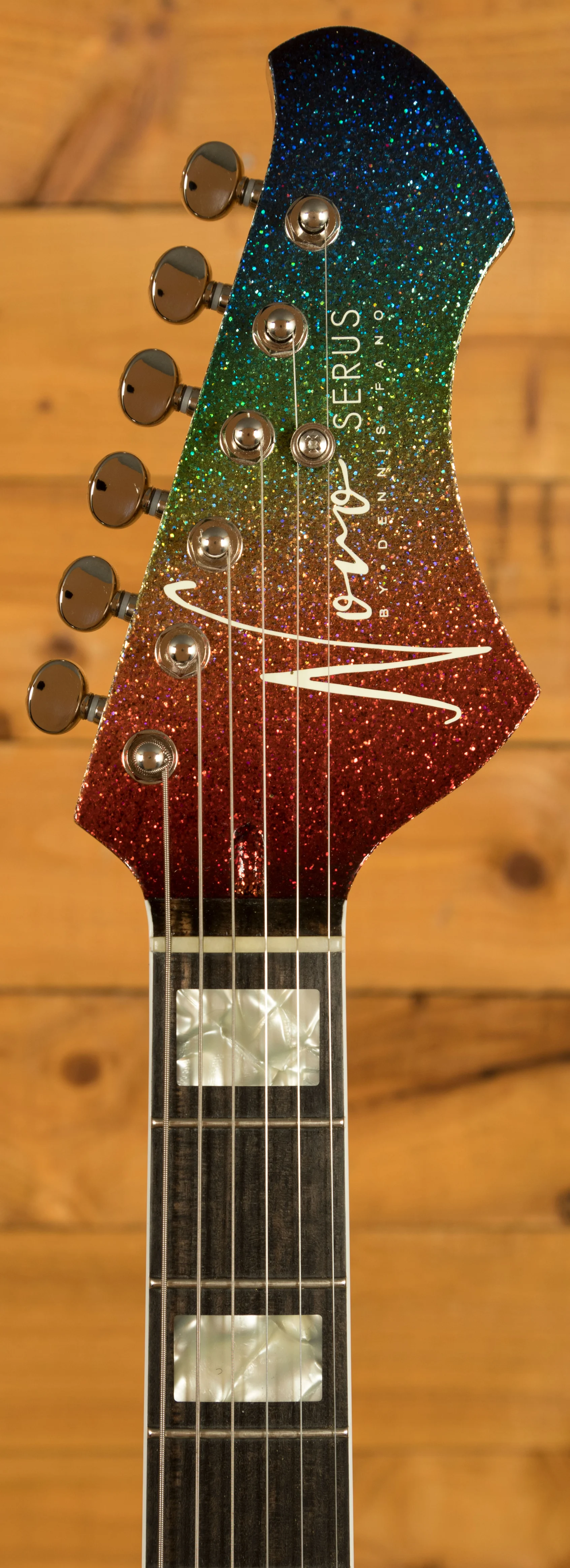 The response online to this guitar was incredible, in fact, its probably the most sought-after Novo guitar ever made. Were thrilled to announce that another small run of this awesome guitar has been created by the Novo team, and were thrilled to have one here at Peach Guitars.This special Novo Signature Series Serus J features a lightweight Tempered Pine body. This is one of the most popular and common body woods found on Novo guitars, so was the perfect starting point for this guitar. The body is then finished with an gorgeous Dark Side Sparkle flake finish which in classic Novo fashion, is slightly distressed for that worn in look and feel. The Dark Side of the Moon by Pink Floyd is one of Dennis Fano's all-time favourite records and was instrumental in helping him begin his guitar journey. This guitar is a fitting tribute to one of the greatest records ever produced by one of the guitar worlds greatest minds.