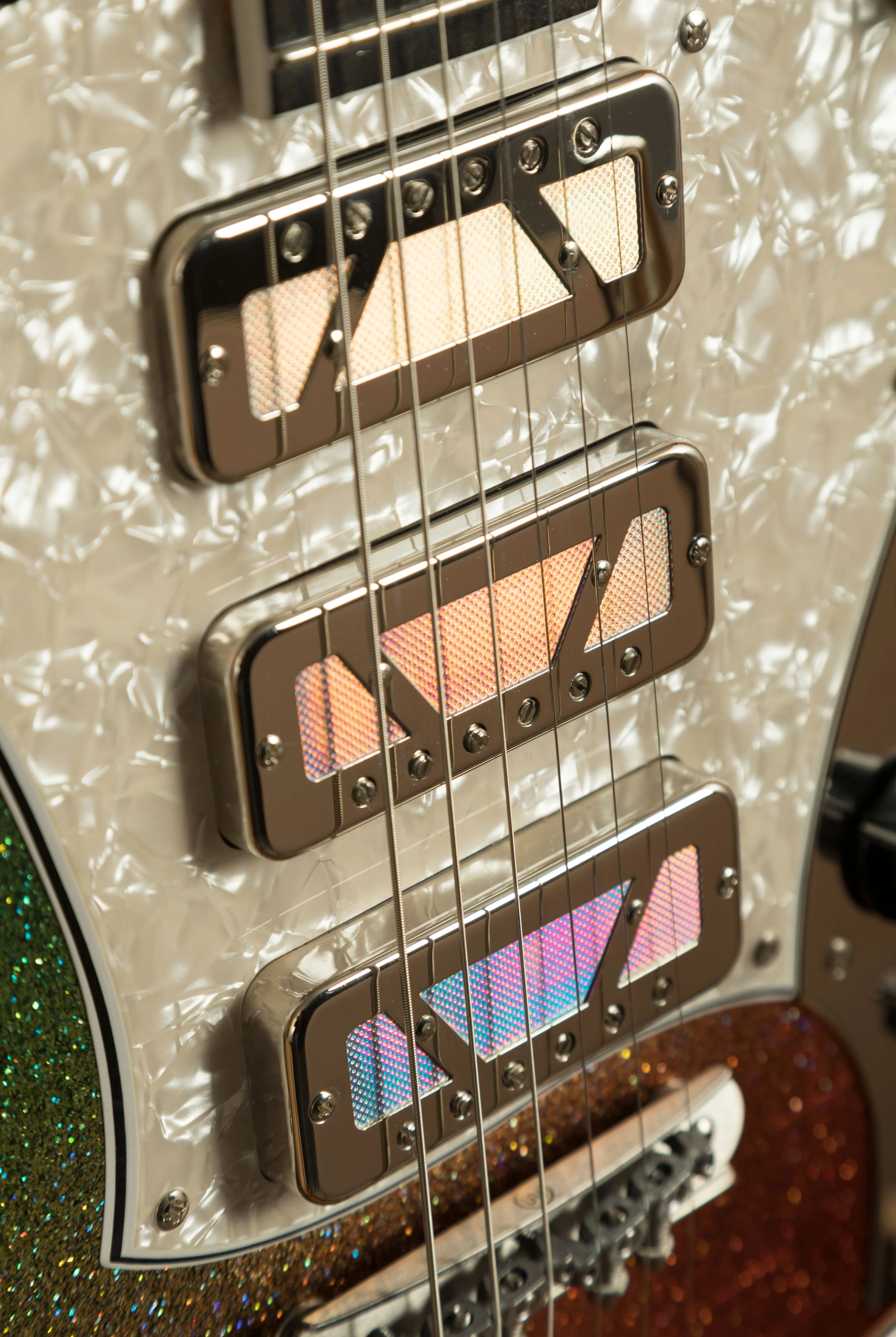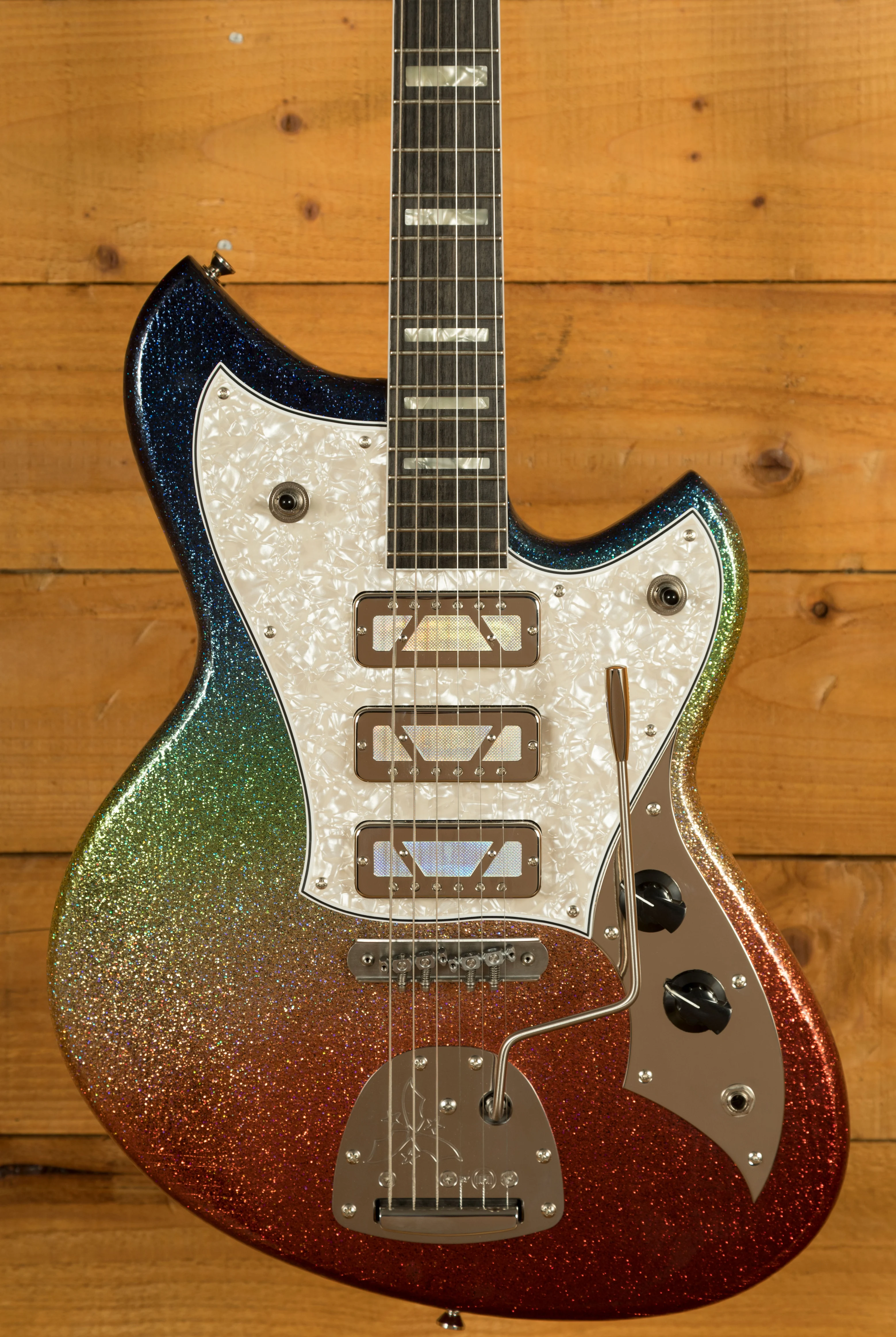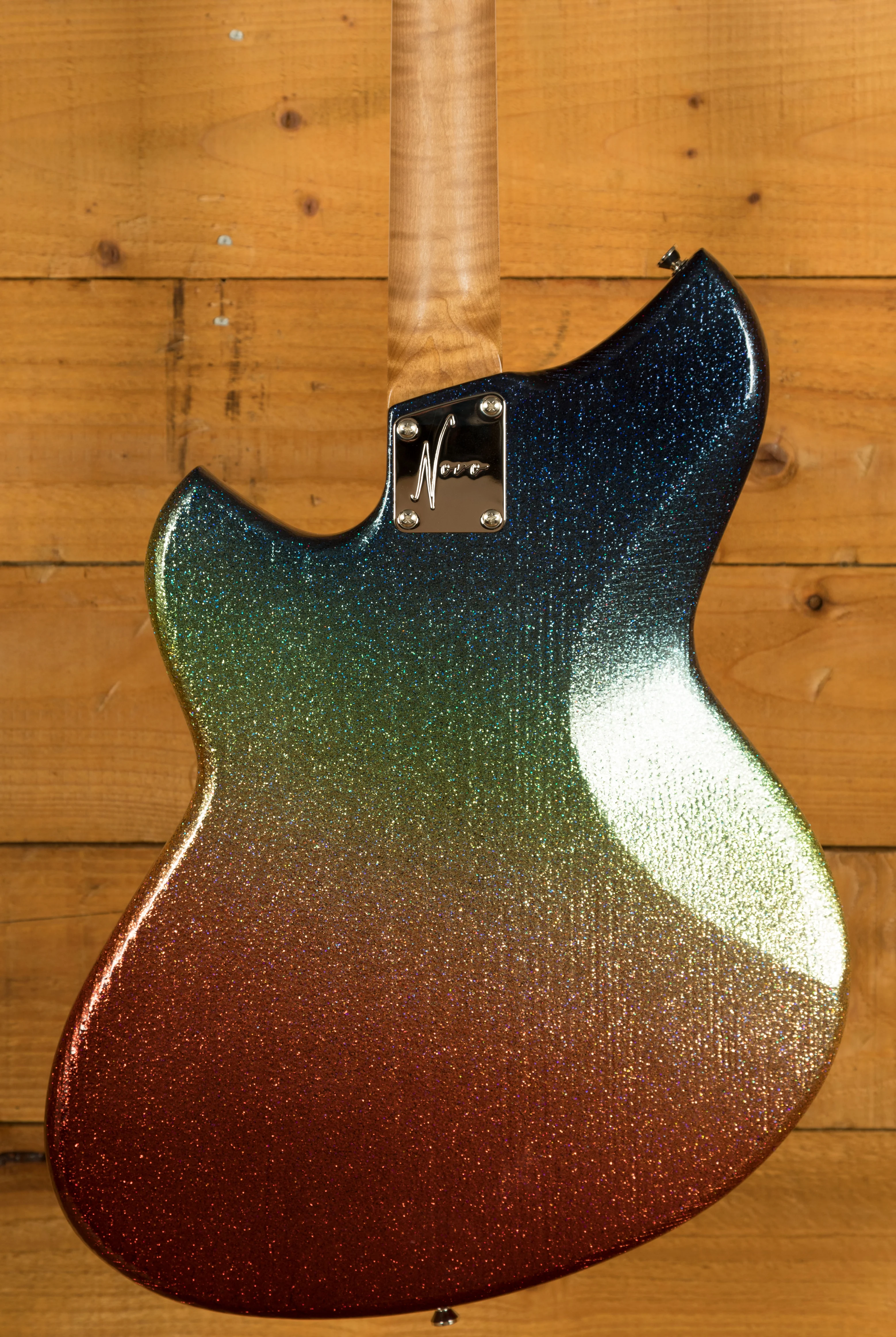 This is one of the most unique Novo guitars on the market, and one which has a rather special story. Dennis Fano is known to be one of the most creative and innovative minds in the guitar world. His designs are always extremely eye-catching and instantly recognisable. Back in July 2025, Dennis Fano teased an exciting instrument that he was working on at the time. This instrument was totally unique and featured a stunning Dark Side Sparkle finish alongside Technicolour Foil pickups. This guitar instantly caught the eye of Peach Guitars Director, John Priest, and is now in his personal collection of Novo guitars.