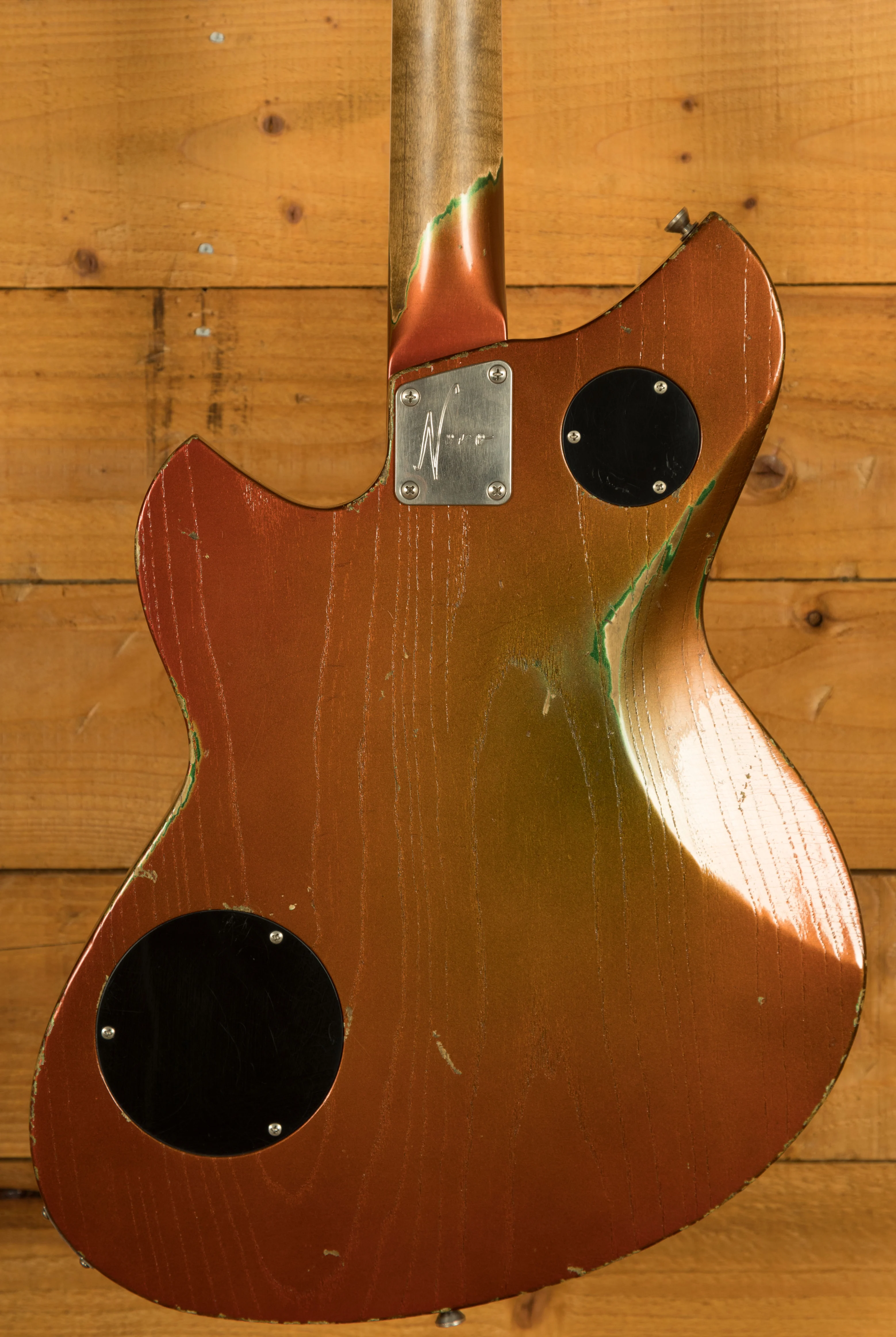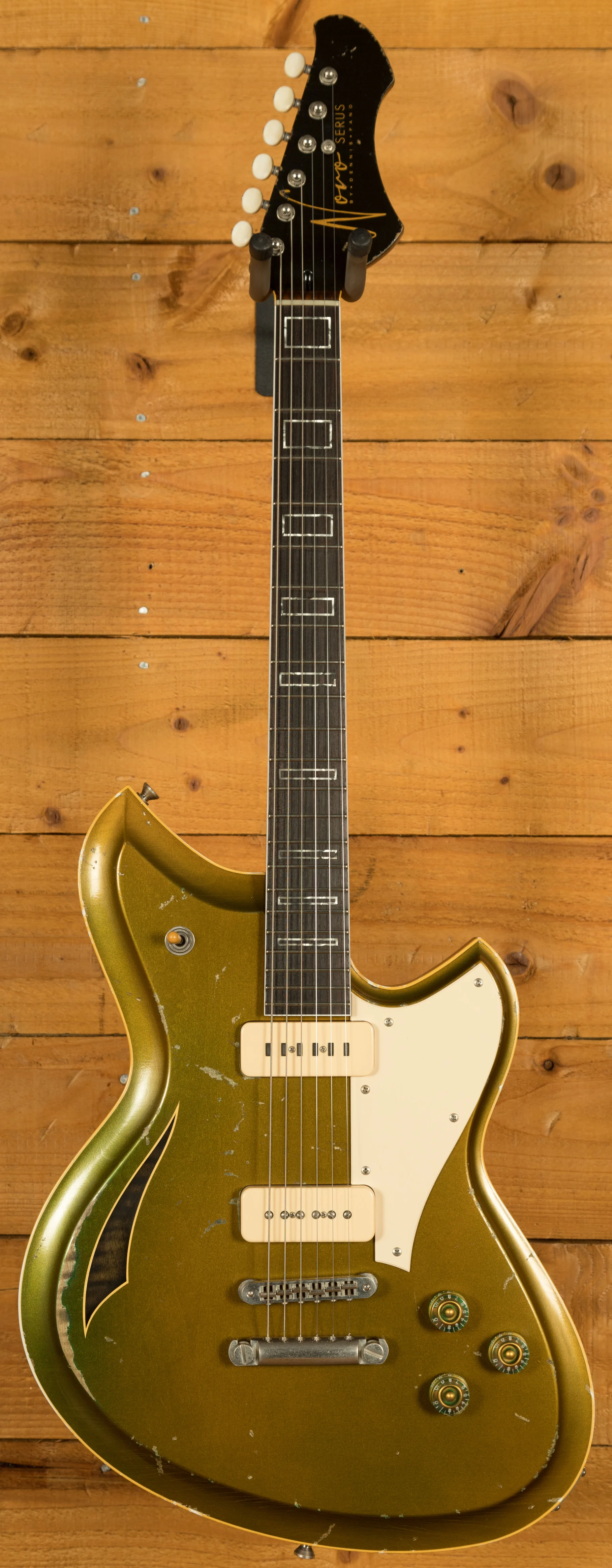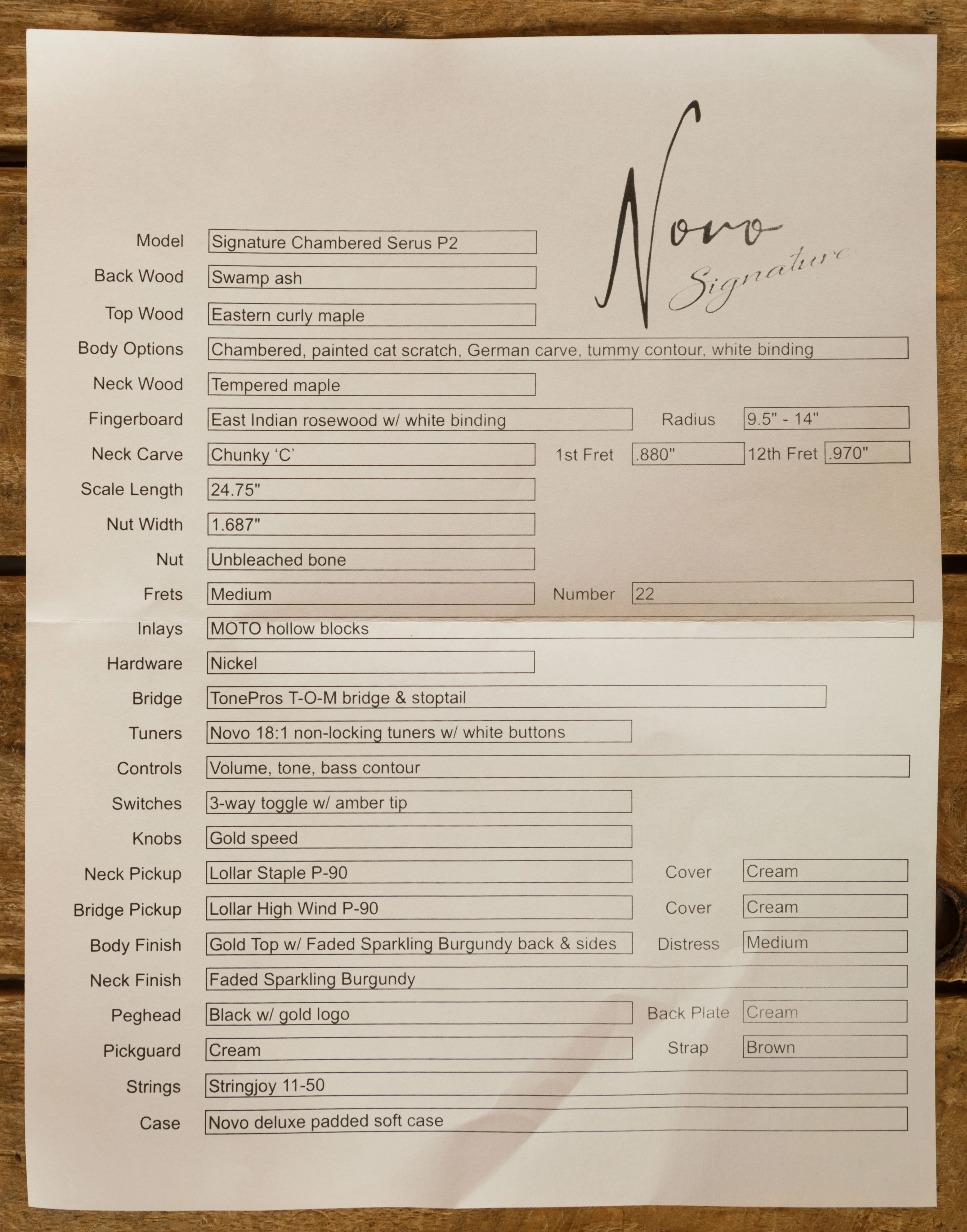 The Novo Signature Series Serus P2 has some very exciting build details which include a Chambered Swamp Ash body, Eastern curly maple top and a "painted cat scratch". Other key body specs include German Carve and a tummy counter, rounded off with white binding