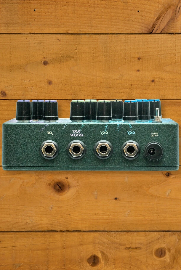 Versatile Routing: The Beam Splitter starts with a mono input, but it doesn't stop there. You can route your signal to the Purple, Green, and Blue drive sections in parallel. Plug into the Purple Out Jack, and all three sections join in parallel mono at that output. Alternatively, you can route Green and Blue to their dedicated outputs for even more tonal possibilities.