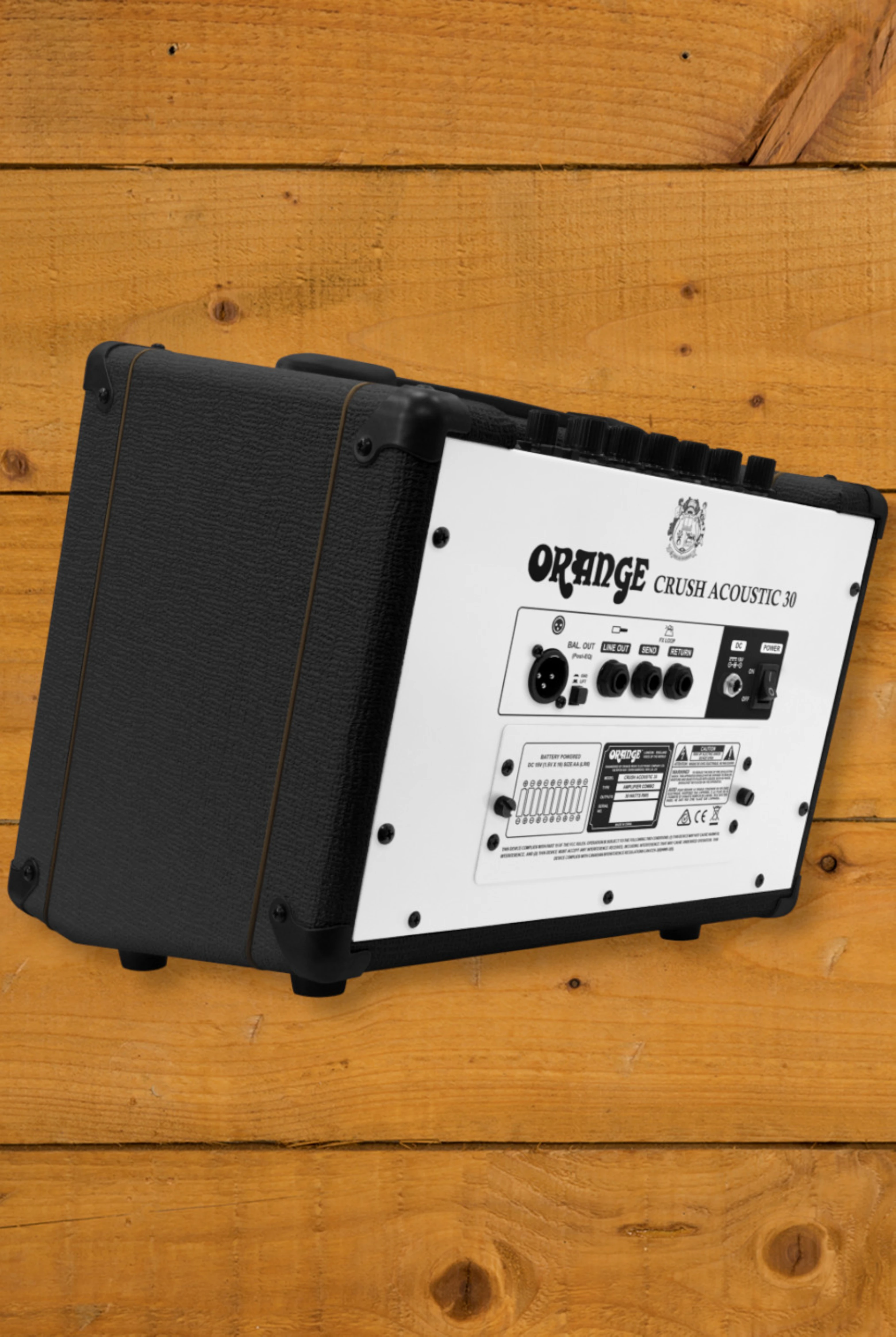 The Crush Acoustic 30 is the perfect amp to use on the go. The battery compartment takes 10 AA batteries, giving you 3 hours of power at full volume, 5 hours at 50% volume and 8 hours at low volume. The Crush Acoustic 30 can also be powered by the supplied DC adaptor, which disconnects the batteries when in use.