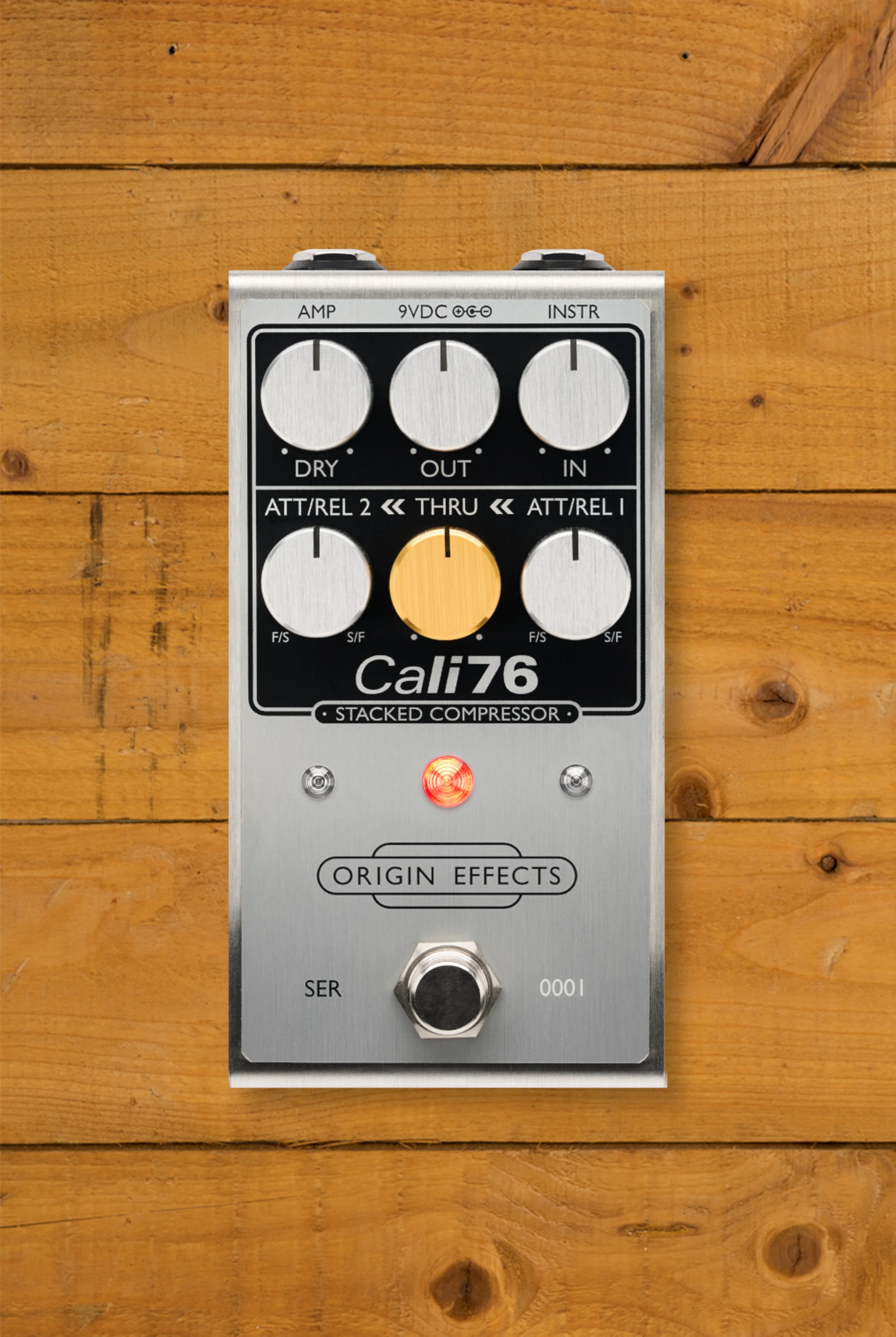 The Origin Cali76 Stacked Compressor is a dual-stage compressor pedal designed for guitarists seeking a wide range of compressed tones, from subtle to extreme. This pedal replaces the previous Cali76 Stacked Edition and SlideRIG Compact Deluxe MK2, incorporating improvements seen in the recent Cali76 FET and Bass Compressor models. The Cali76 Stacked Compressor utilises two compressors cascaded in series. This configuration allows for more dramatic compression effects, capable of super-squashed clean tones, singing slide tones, and long-sustaining lead lines. It offers independent controls for each of the two compression stages, giving users precise control over their sound. A dry level control enables parallel compression, blending the uncompressed signal with the compressed signal for more nuanced effects. Each compressor stage features its own LED gain reduction indicator, providing visual feedback on the amount of compression applied. Internally, the pedal boosts the incoming 9V power supply to 24V, resulting in increased headroom and cleaner operation, even with heavy compression settings. The Cali76 Stacked Compressor also boasts an ultra-high input impedance and a high-quality buffered bypass. It is housed in a smaller enclosure, a 17% reduction in footprint compared to the previous model. The pedal is designed and built in England, using premium components.