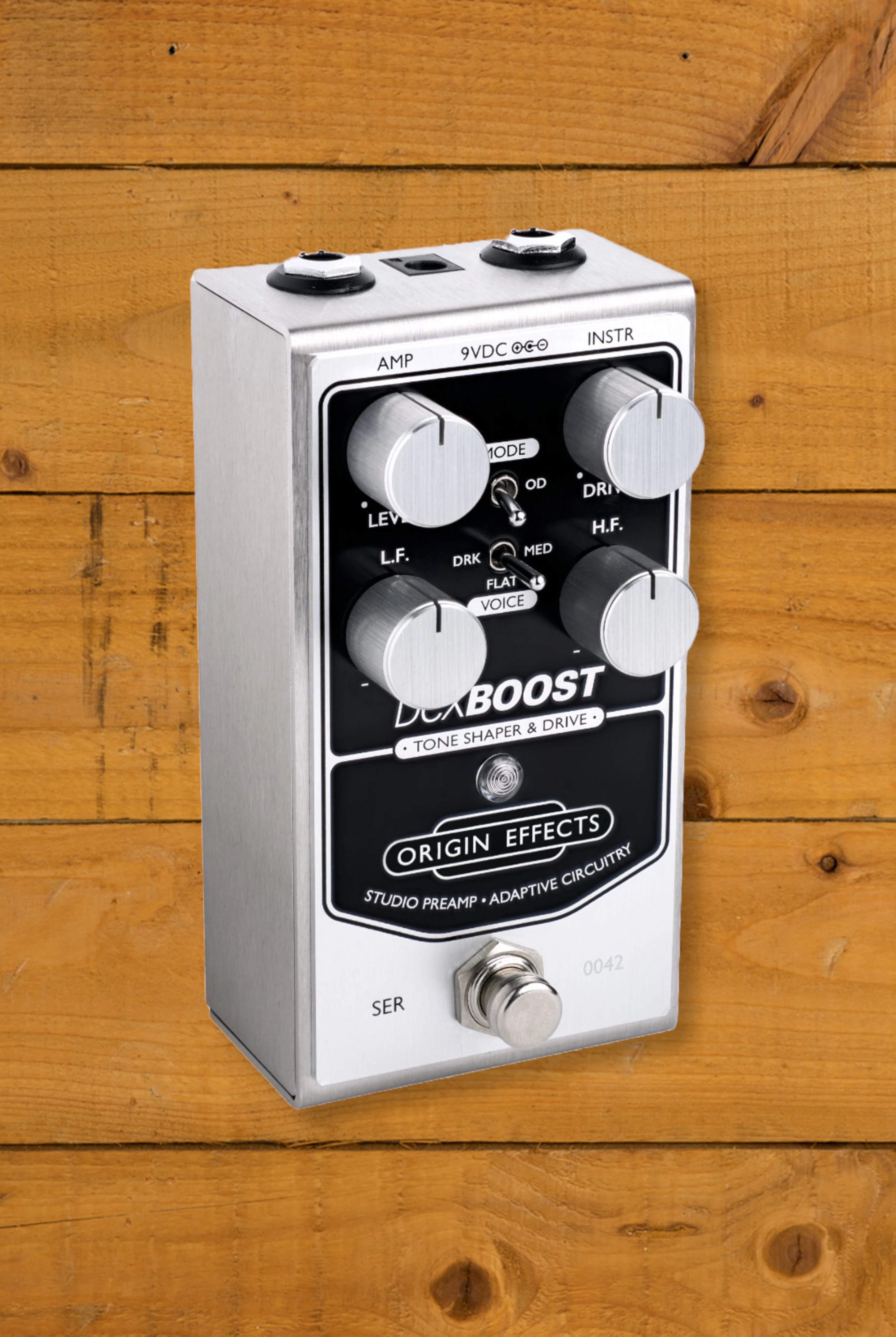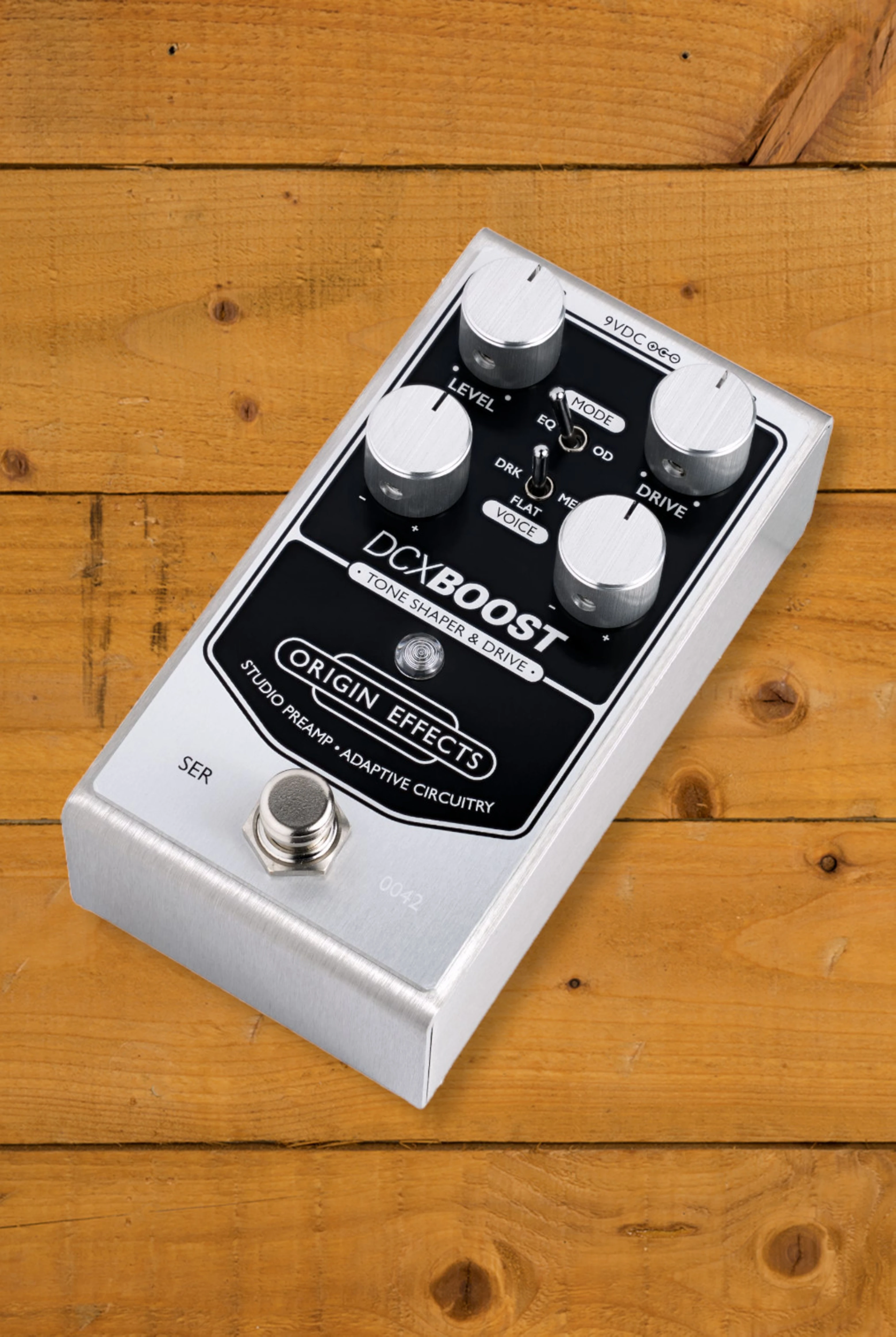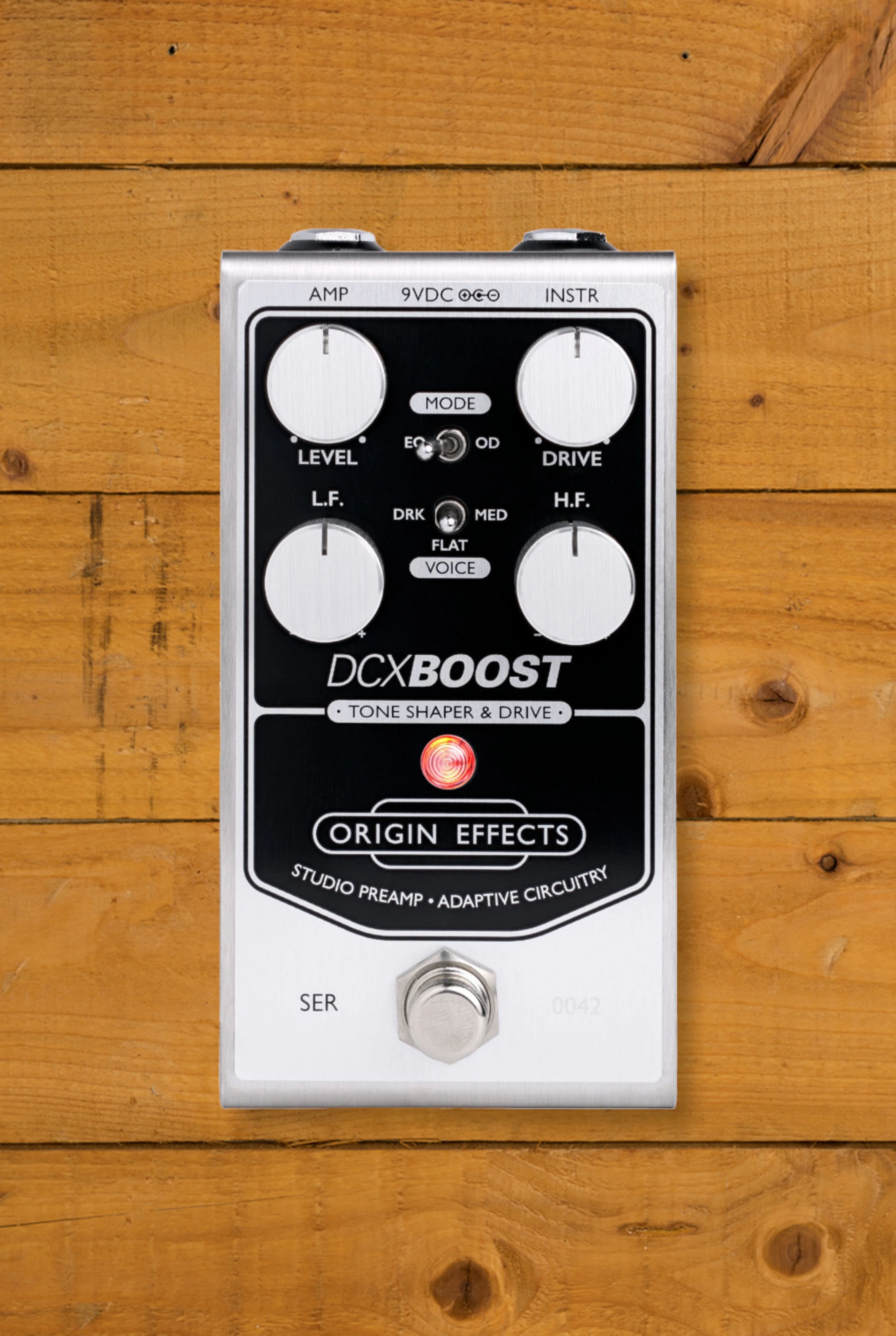 Looking to add some vintage, analogue colour to your guitar tone? Introducing the DCX BOOST - a tone shaper and drive pedal inspired by the iconic UA 610 recording preamp. This pedal is perfect for anyone looking to add some retro character and warmth to their signal chain. The pedal caters to guitar players, with EQ controls designed for maximum clarity and precise control of level and EQ. From subtle boosts and tone-tweaking to fuzz-like "cranked console" saturation, the DCX pedal can enhance anything that passes through the circuit, just like you'd expect from a great retro recording preamp. Plus, the EQ and OD modes provide a versatile gain range, while the Voice control fine-tunes treble response with Origin's Adaptive Circuitry, previously seen on the Halcyon Green Overdrive and M-EQ Driver. With all-analogue, studio-derived circuitry and a sophisticated balance of precision and character, these pedals can craft the perfect clean boost, mimic classic "direct to console" tones or serve up saturated vintage overdrive. Crafted with high-quality components throughout and designed and built in England, the DCX BOOST is a must-have for any guitarist looking to add some vintage character to their sound.