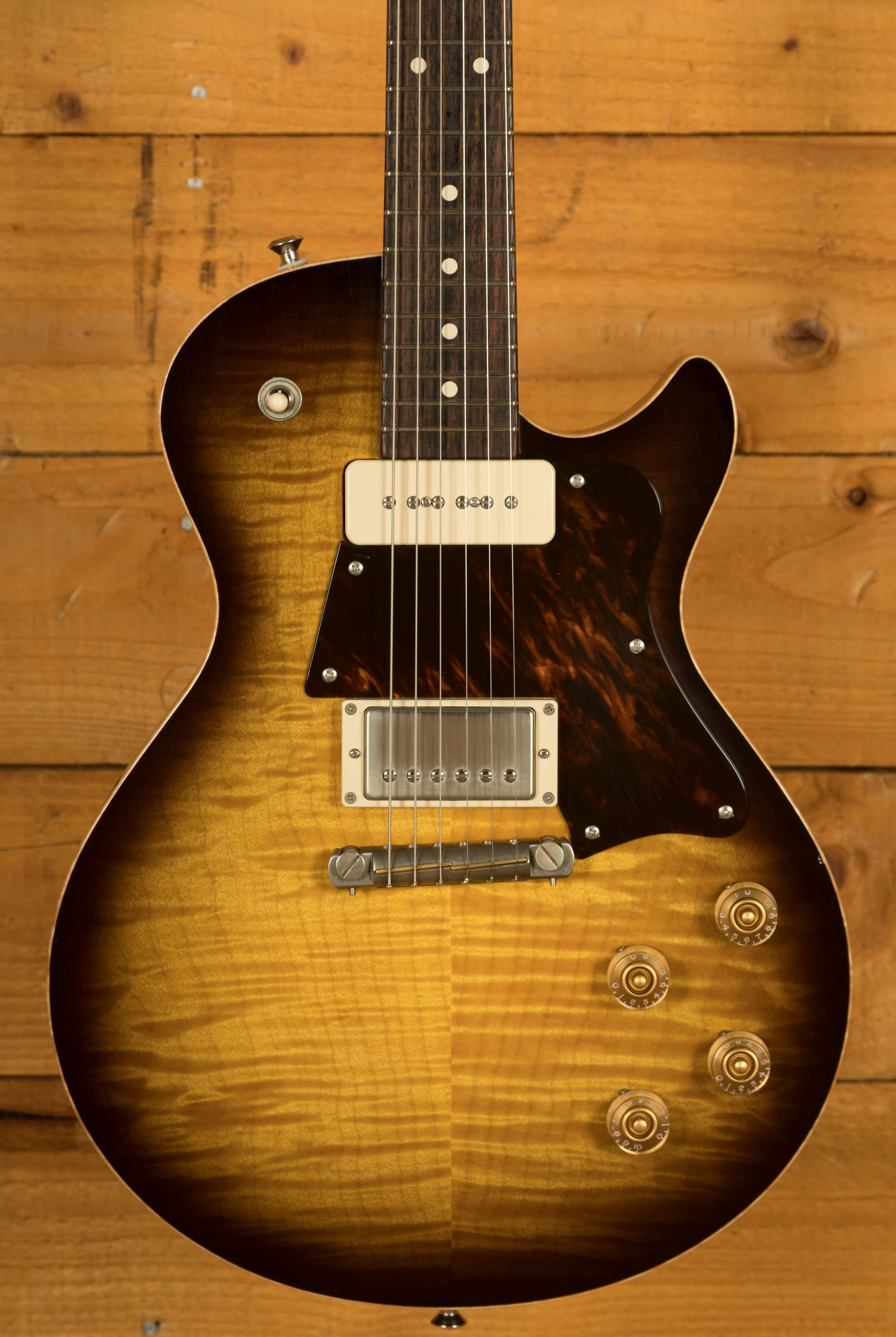 A stunning guitar with a breathtaking top. There is a small lacquer crack on the heel of the neck, a couple of small dings to the body and some light scratches to the headstock.