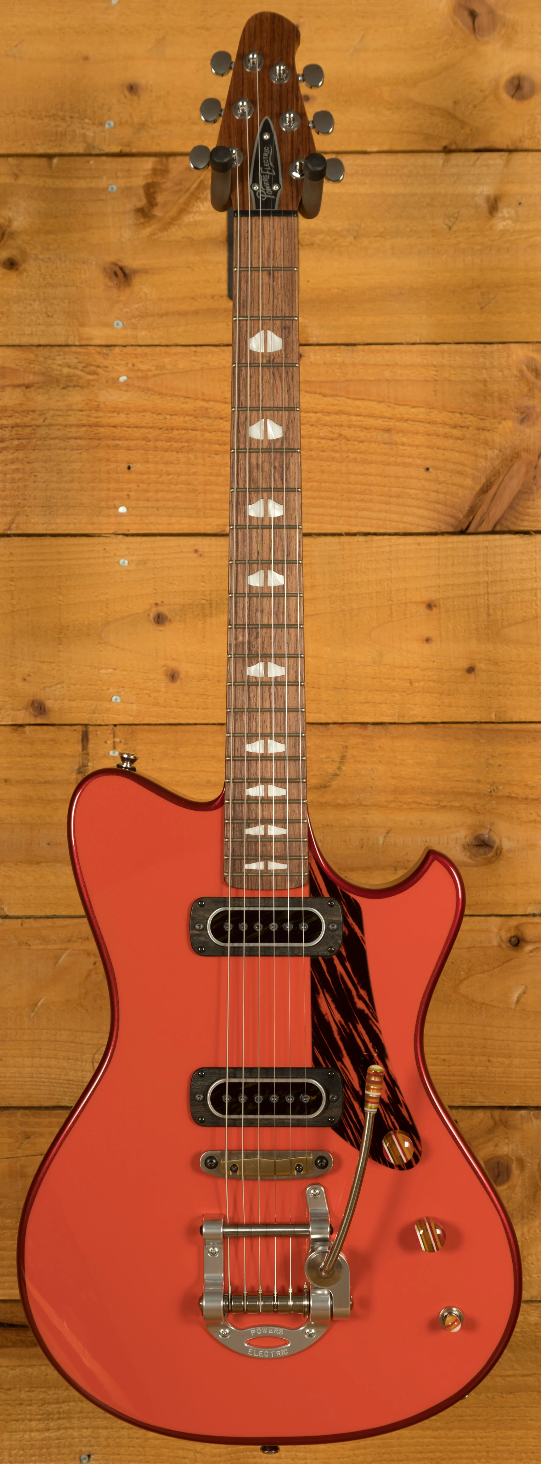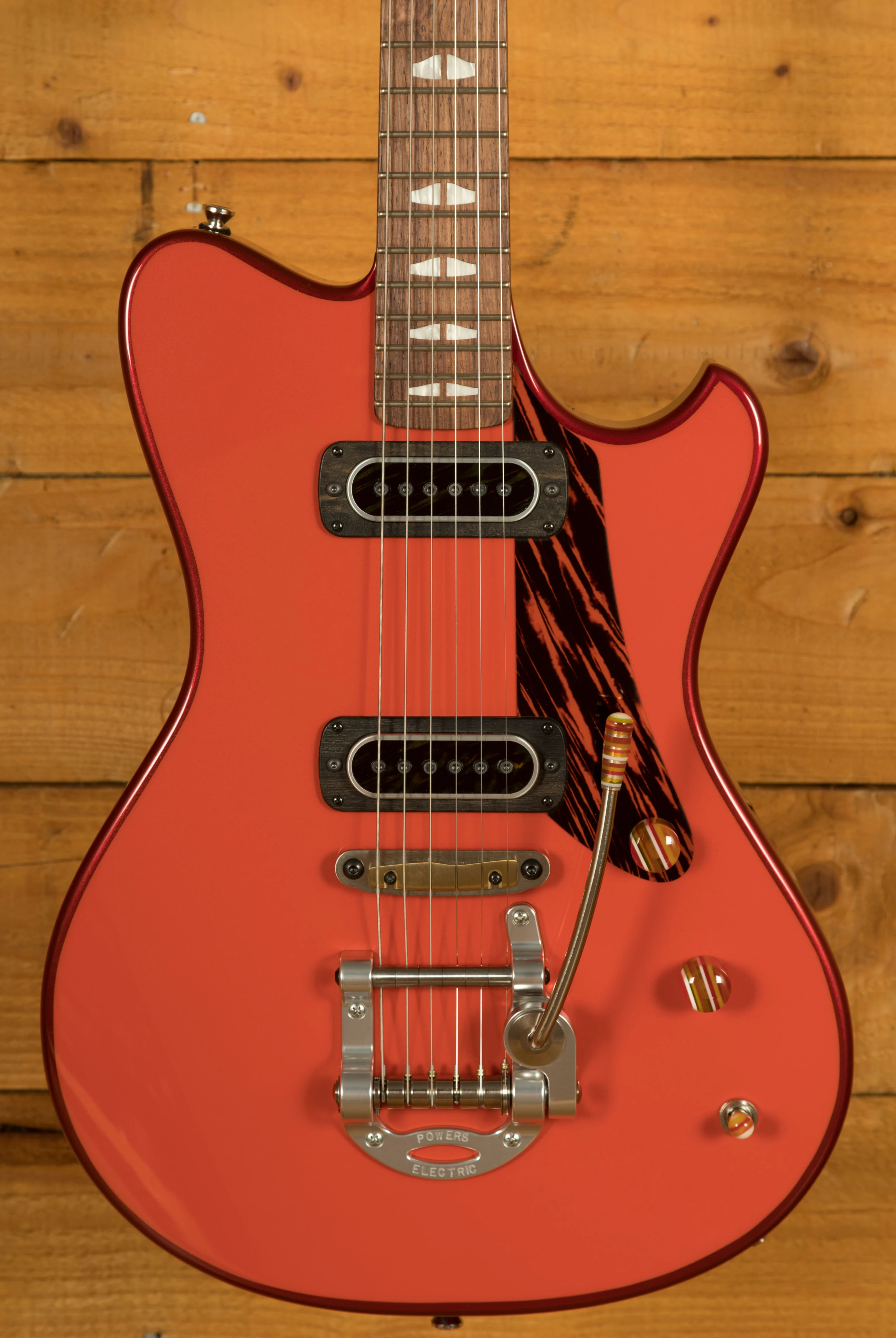 In a nod to classic styling, the guitar is finished in a solid colour, instead of the select maple option. The Firestripe pickguard adds a striking visual contrast, giving the guitar a unique, vintage-inspired look. Each component, aside from the tuners and strings, is meticulously crafted in-house, emphasising the exclusivity and craftsmanship of the Powers Electric A-Type.