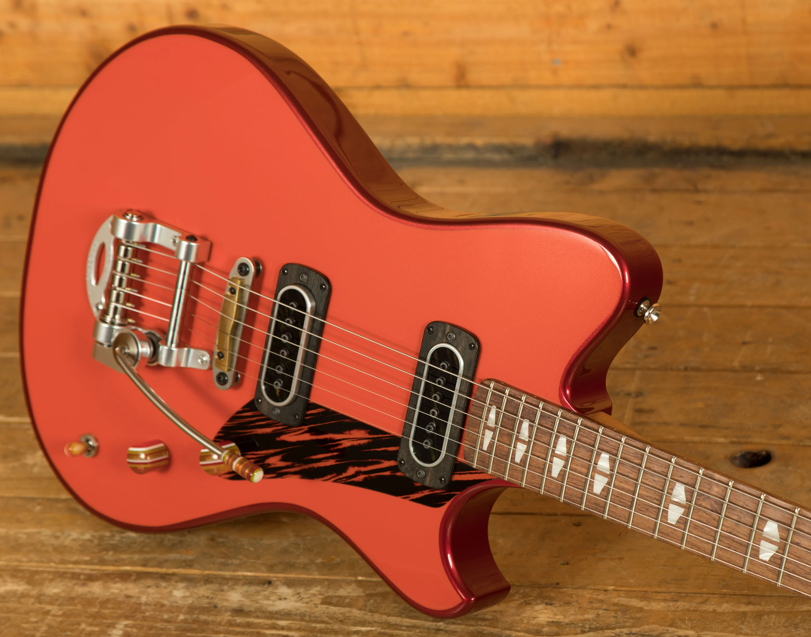 The A-Type draws its aesthetic inspiration from the classic lines of vintage cars, hot rods, and surfboard design, reflecting Powers' upbringing in the vibrant cultural environment of San Diego's North County. This guitar showcases an asymmetrical shape that maintains visual balance, ensuring it looks stunning from every angle. The fully enclosed, slim hollowbody design is not just a visual treat but also a feat of engineering aimed at maximising resonance and minimising feedback.