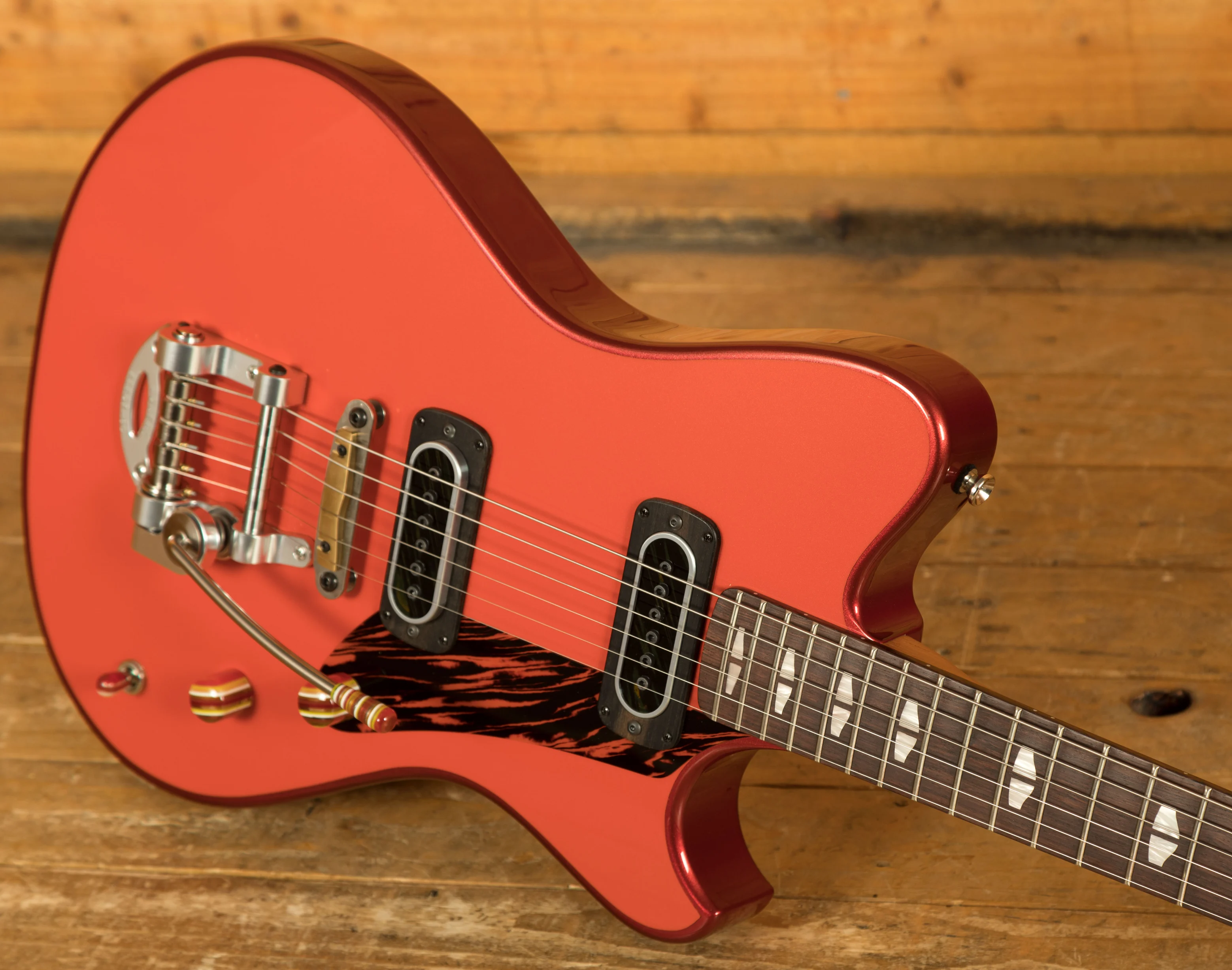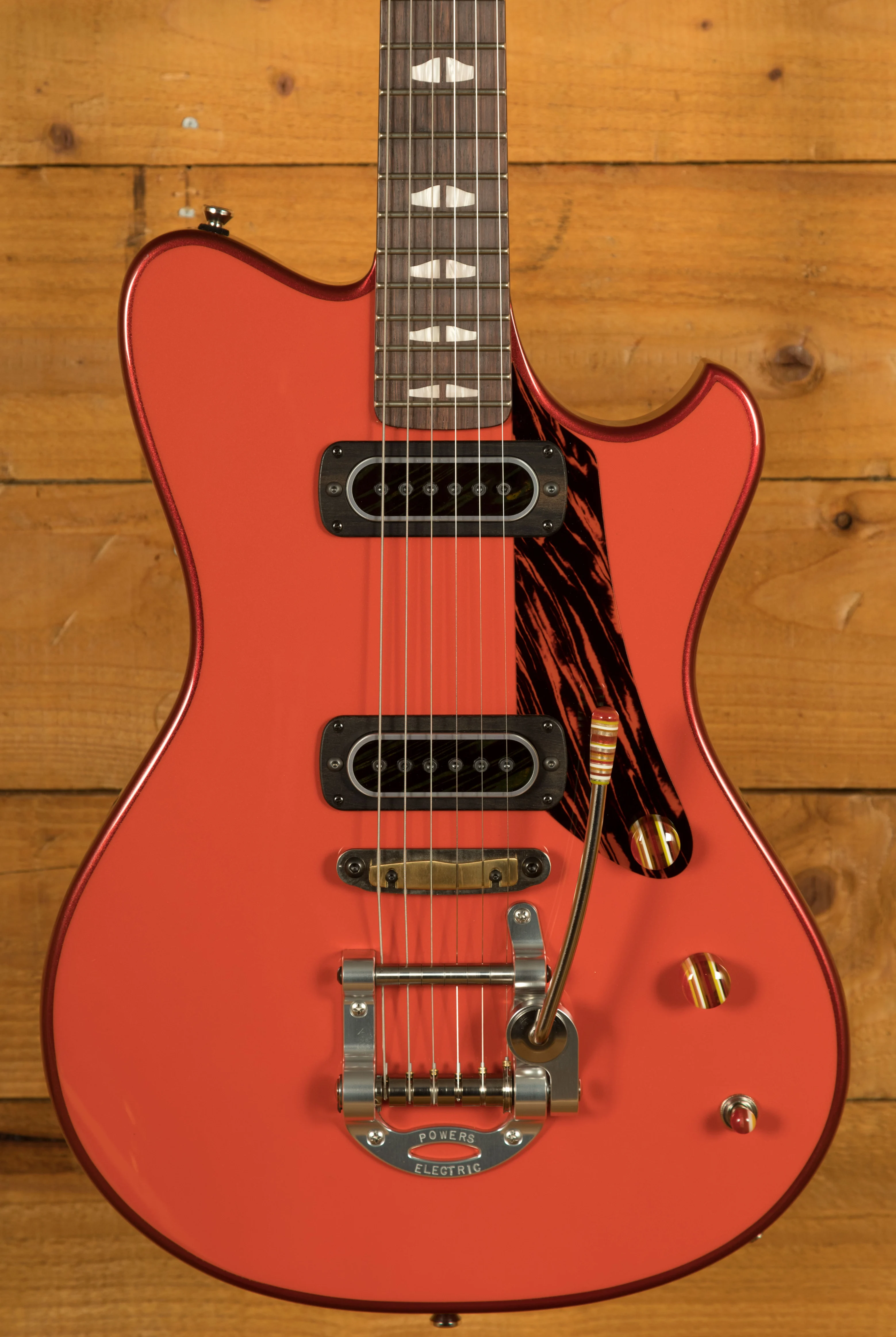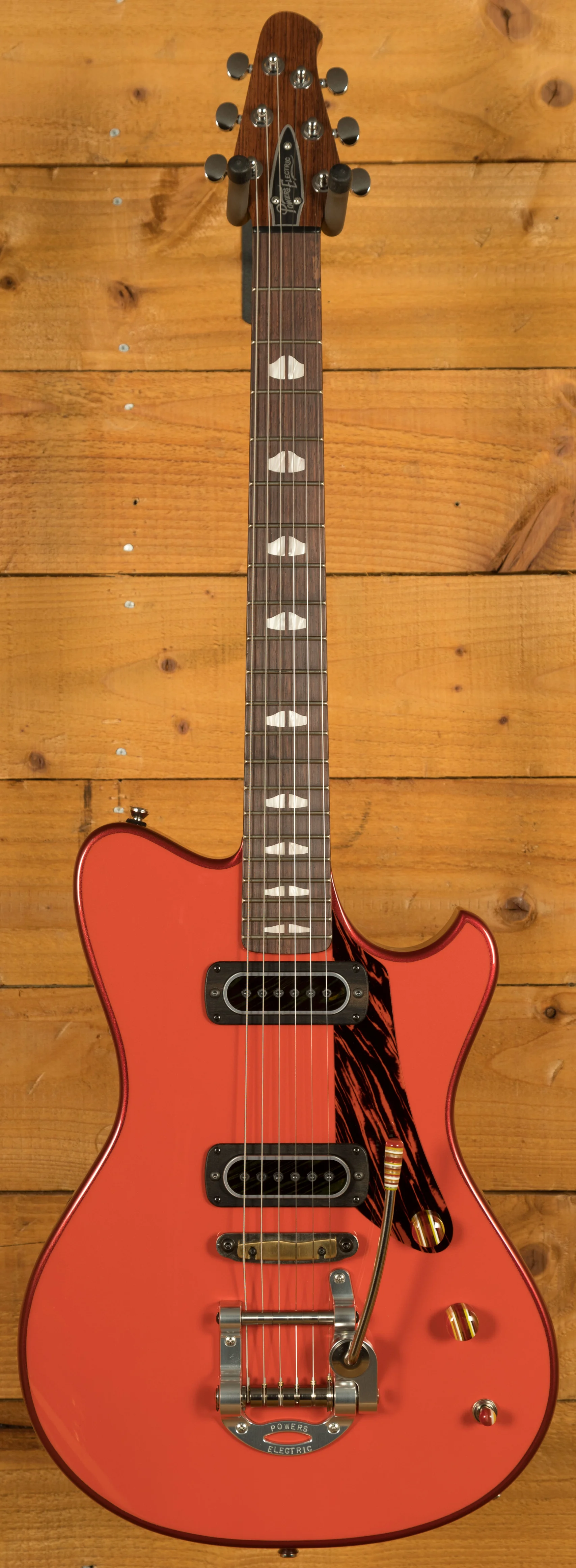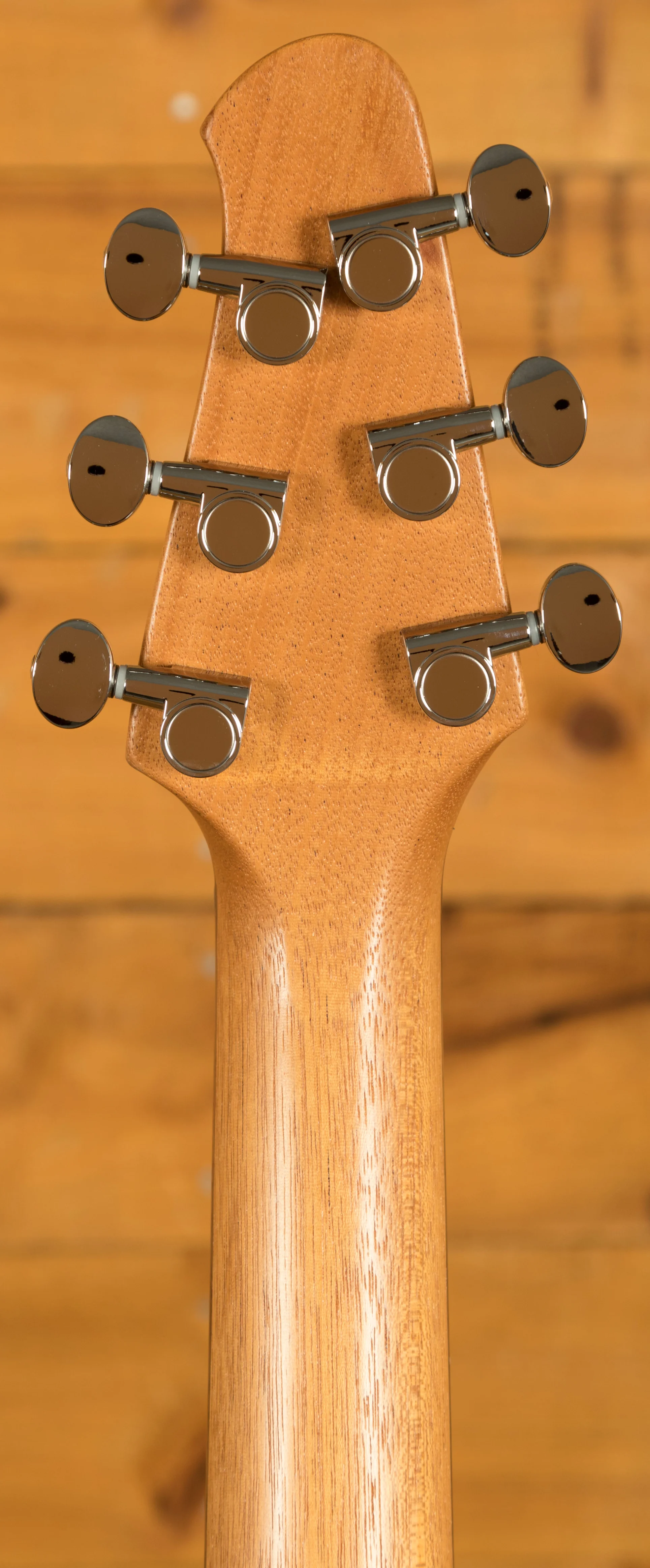 The A-Type's design draws heavily from the sleek lines of classic cars, hot rods, and surfboards, reflecting the vibrant cultural milieu of San Diego's North County. This region's rich mix of surfing, skateboarding, auto craft, music, art, and architecture profoundly influenced Powers' creative process. The result is an asymmetrical yet visually balanced guitar that looks stunning from every angle. This fully enclosed, slim hollowbody design combines timeless styling with modern embellishments, making it as beautiful as it is functional.