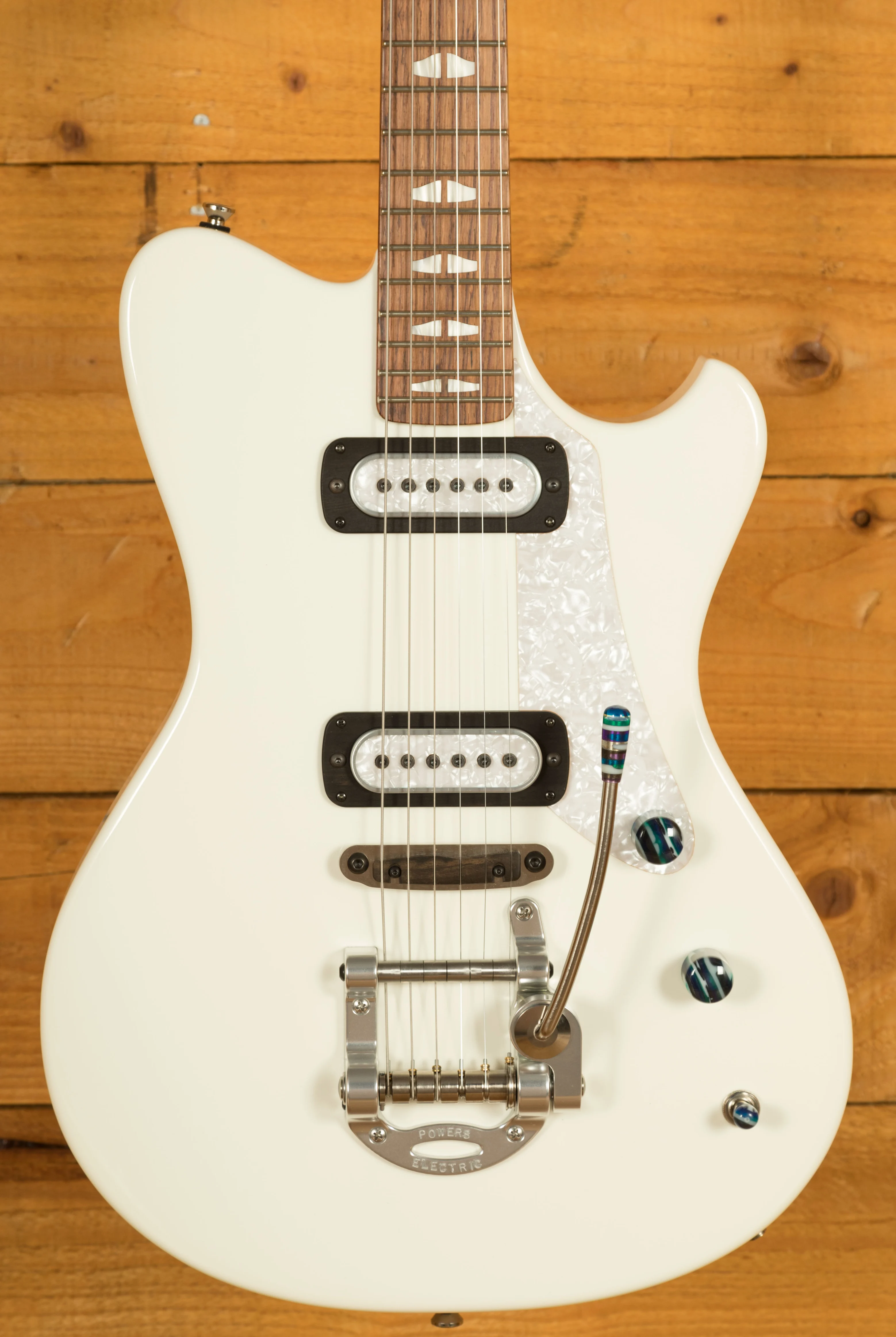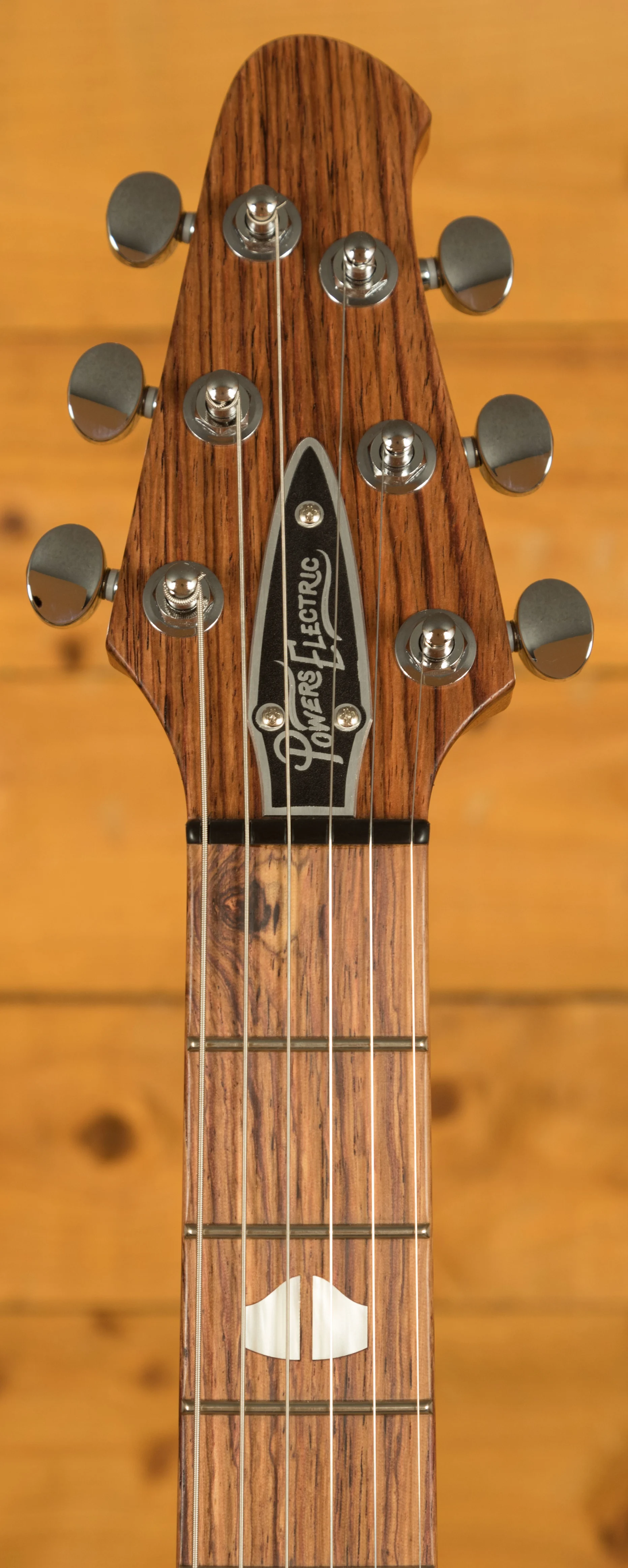 The Powers Electric A-Type is designed with the player's comfort in mind. Its lightweight, hollow body ensures ease of handling whether standing or sitting, while the contoured armrest and radiused body edges enhance playing comfort. The neck offers a perfect blend of size and smooth transition into the unique split radius fretboard. This asymmetrical fretboard, which is flatter on the treble side, allows for effortless string bending and maximum playability, ensuring that players can explore fresh ideas and sound more like themselves.